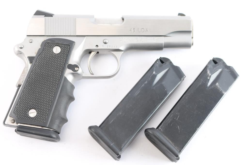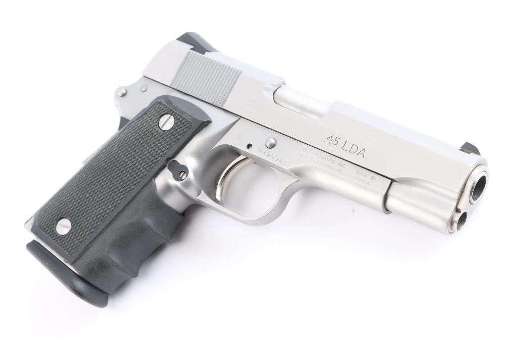 Canadian made double-stack 1911-style semiautomatic pistol imported by Para-Ordnance Inc of Ft Lauderdale FL. Features stainless steel construction, 4.25" barrel, shortened frame to aid with concealment, three dot Novak style sights in dovetails, manual safety left side of frame, grip safety, smooth curved trigger and spurless hammer. Operates using the Para-Ord LDA (light double action) trigger which provides a light and smooth trigger operation. Bore is excellent. Retains approx. 98% finish with superficial scratches and light rust on the grip safety. Includes three 13 round double-stack magazines. Condition is NRA Very Good. *** Modern Firearm ***