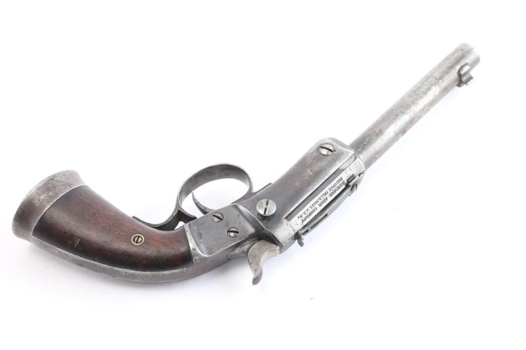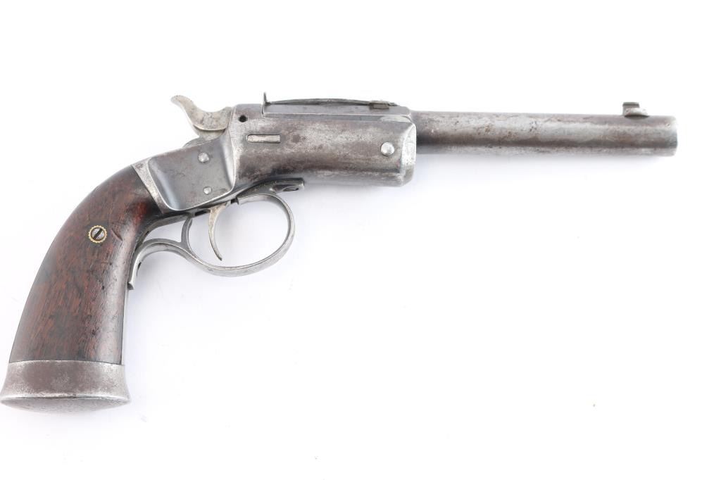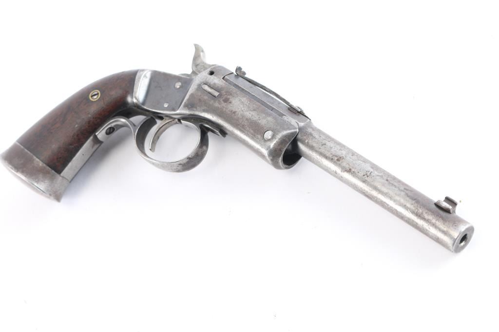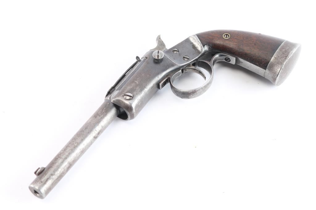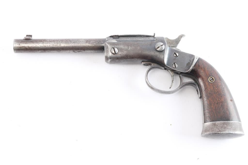 Single shot tip up pistol chambered in .22LR with part octagon/ round 6" BBL. Circa 1907-16. Fixed bead post front sight and rear adjustable "V" rear sight, missing elevator, checkered hammer spur, smooth curved trigger and two piece smooth wood panel grips. Bore is very good with strong rifling. Retains approx. 30% finish with heavy wear, some rust and a browning patina. The hammer has the ability to travel too far rearward and will not move forward when the trigger is depressed without assistance. Walnut grips are good with some scratches and dings. BBL reads "J. Stevens Arms Company Chicopee Falls Mass USA." NRA condition is fair to good. ***C&R Eligible Firearm***.