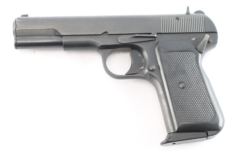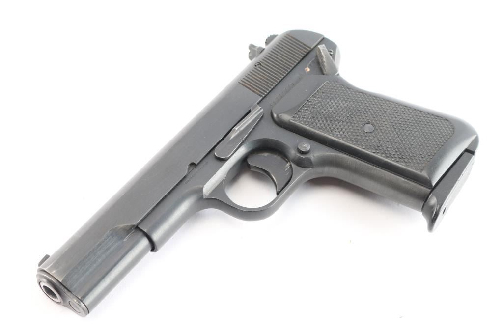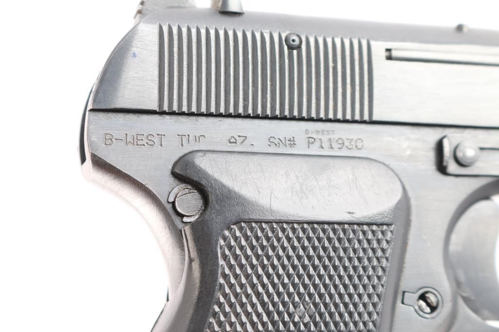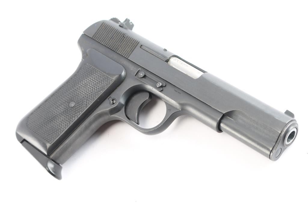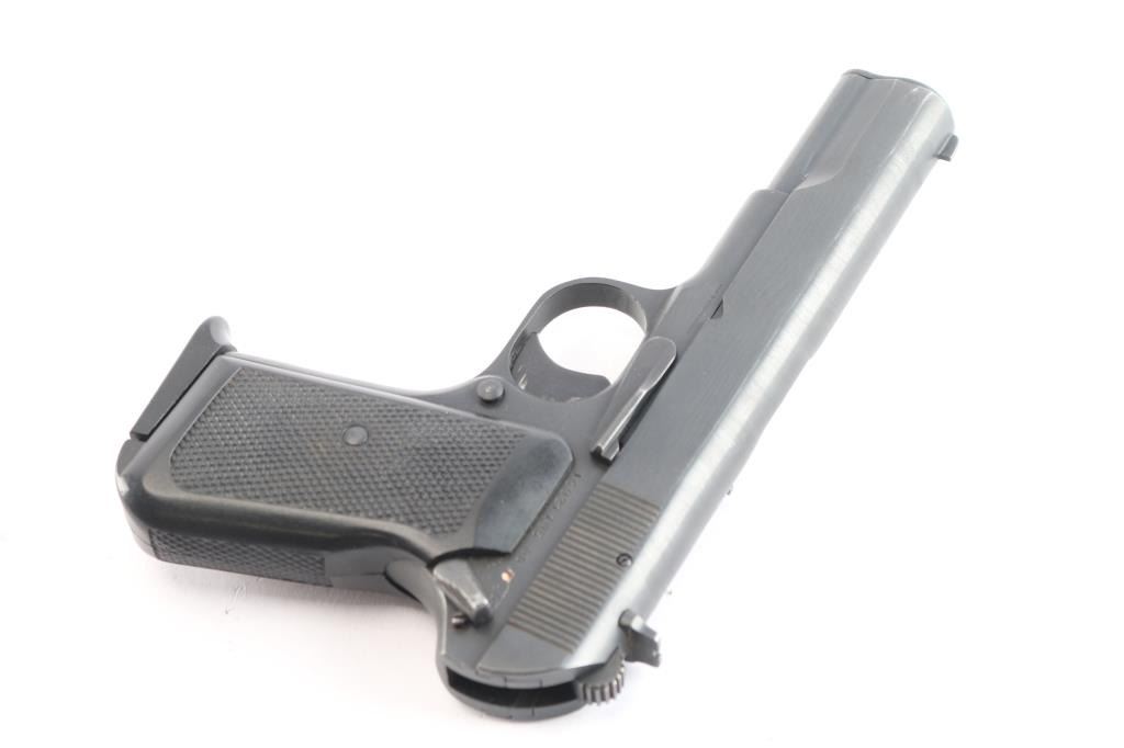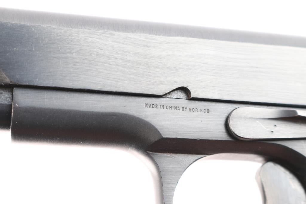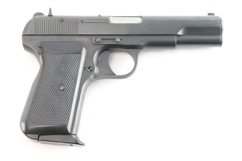 Chinese made semiautomatic pistol imported by B-West, Tucson,AZ. A slightly modified Tokarev pistol w/original SN: 16027795, blued finish, features 4.4" barrel, fixed sights, single action, left side of frame mounted manual safety, left side frame slide stop, pushbutton mag release, smooth trigger and checkered black plastic grips. Bore is very good. Retains 95% finish, with slight edge wear and action wear on trigger. Grips are very good. No markings on slide. Comes with one metal magazine with finger rest base plate. Condition is NRA Very Good. *** Modern Firearm ***