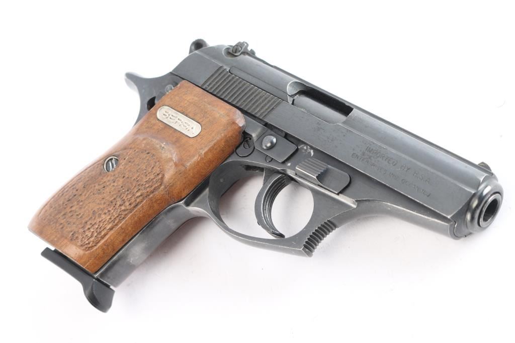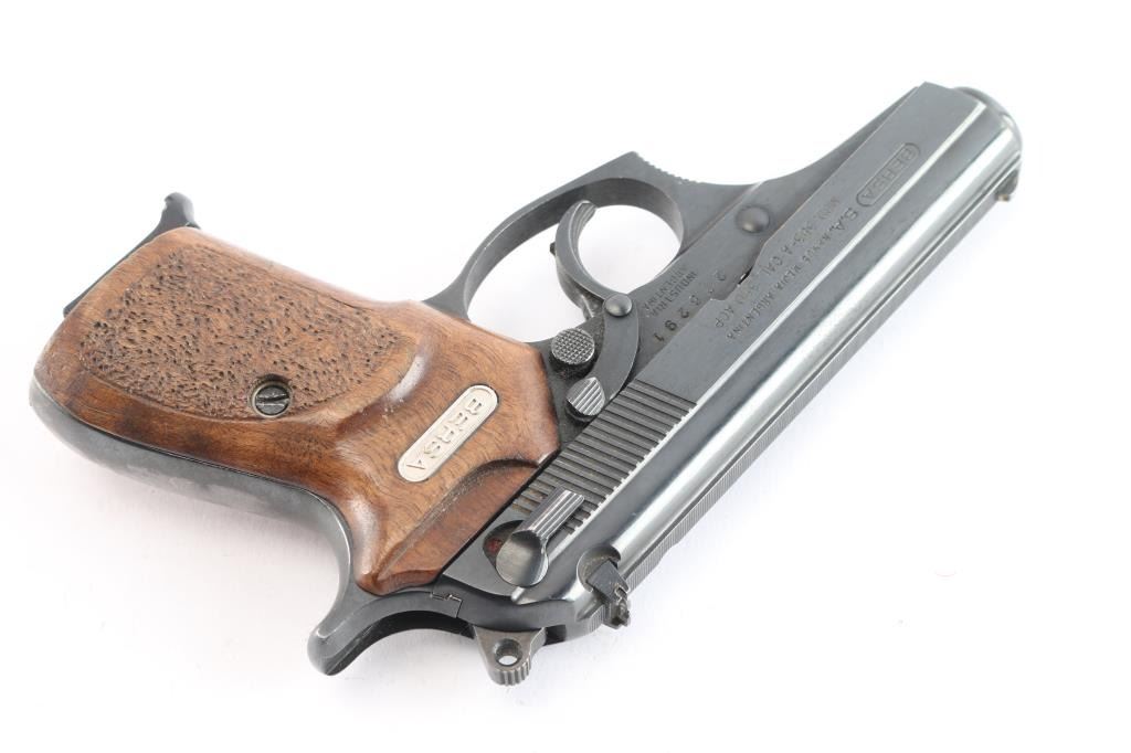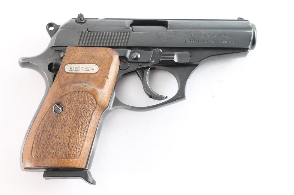 *For parts or repair'. Made in Argentina and Imported by R.S.A. Enterprises Inc. of Ocean, N.J. DA/SA, semi-automatic compact pistol chambered in .380 Auto. Features a blued finish with serrated top rib, 3.5" barrel, fixed white dot front sight, windage adjustable two dot rear sight, serrated wide trigger, serrated round hammer spur, manual safety/decocker on the left side of the slide, magazine disconnect safety, push button magazine release. Textured wood grip panels w/Bersa plates. Bore is very good w/strong rifling. Retains approx. 75% finish w/on the grip straps, edge wear, scratches and scattered oxidation. Hammer does not cock, making it inoperable in SA and causing the hammer to fall in DA. Comes with one 7rd metal magazine. Condition is NRA poor. ***Modern Firearm***.