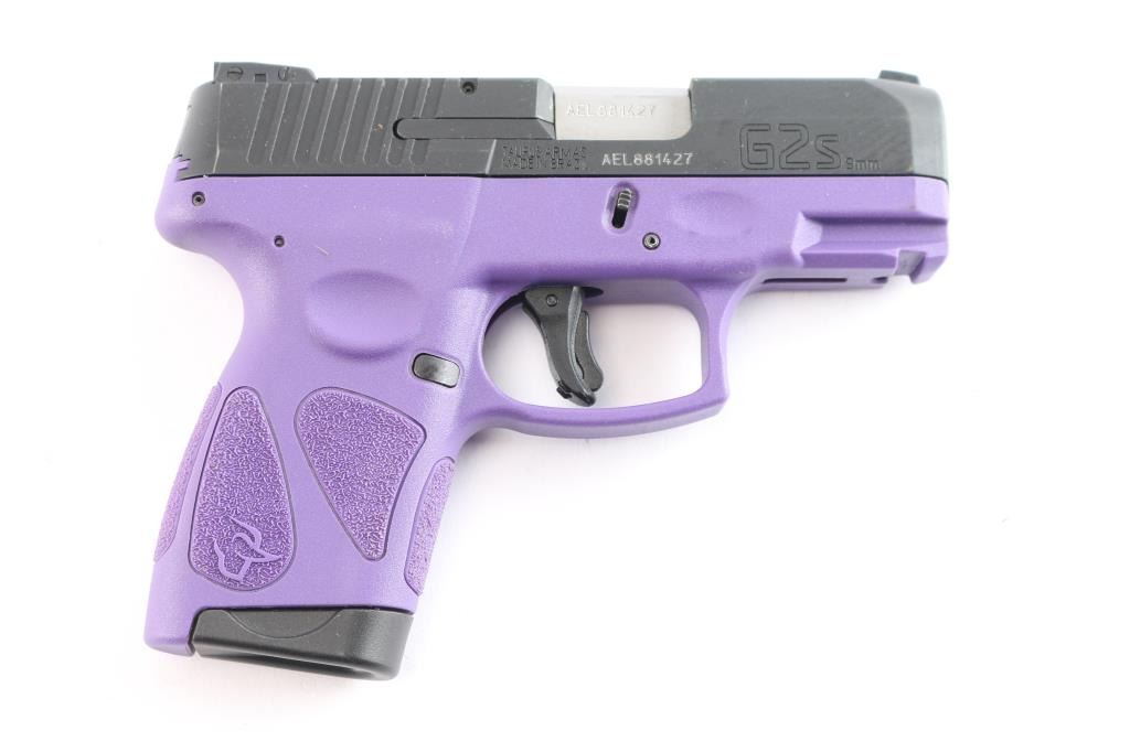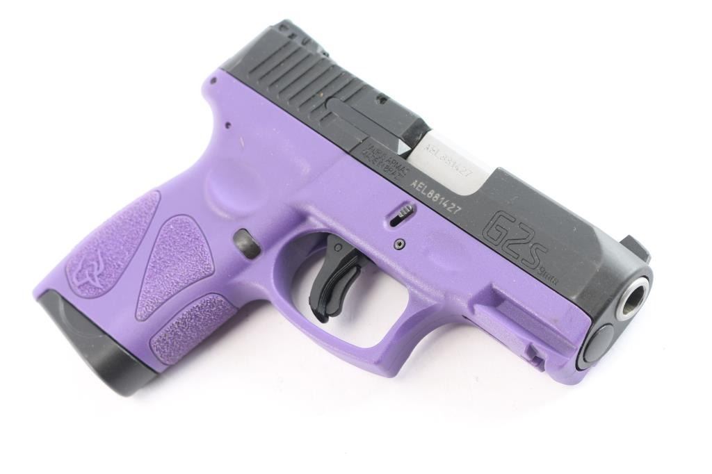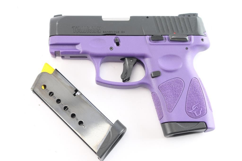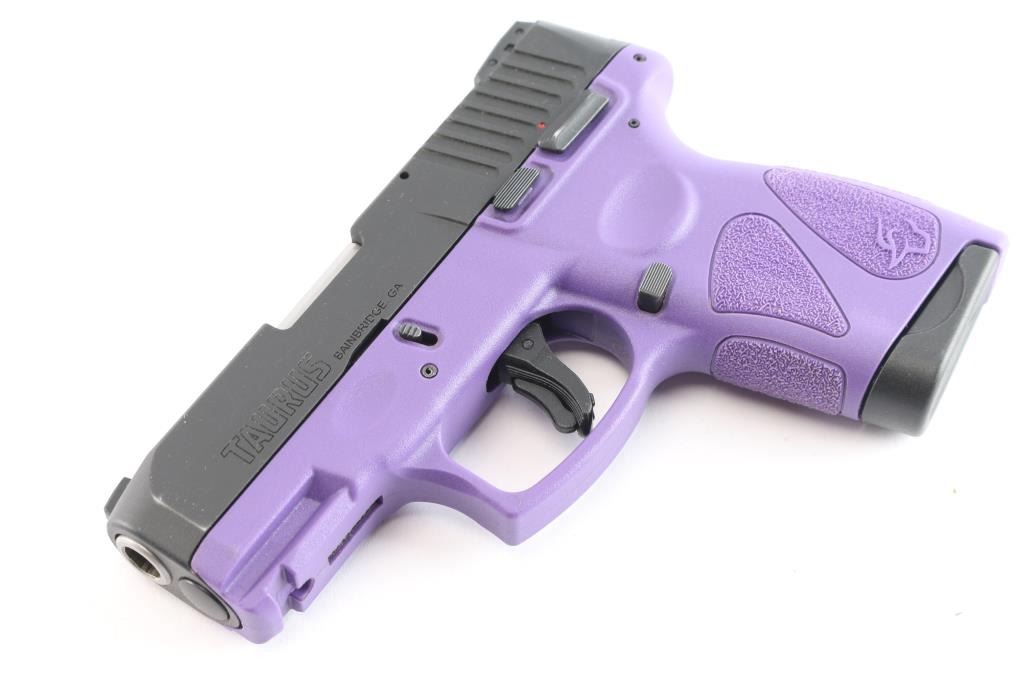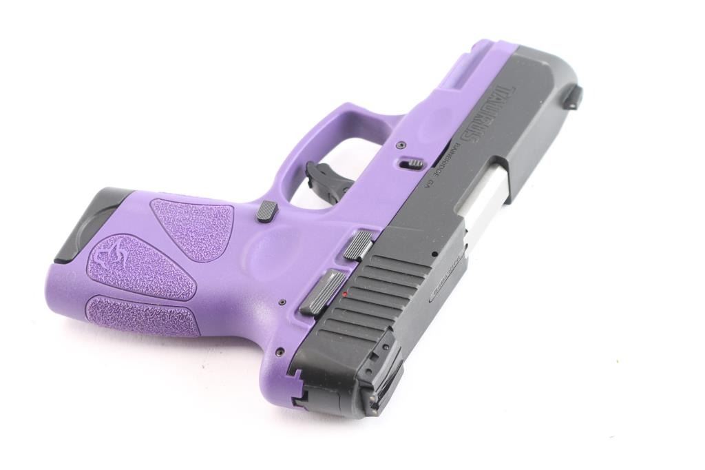 Semi-automatic, striker-fired, compact pistol, made in Brazil. Matte-black slide with purple colored polymer frame. 3" barrel, safety on trigger, frame mounted thumb safety, slide stop and magazine release button. Bore is excellent. Retains approx. 98% finish with slight edge wear at front of slide. Comes with two 7rd magazines. NRA condition is Excellent. ***Modern Firearm***