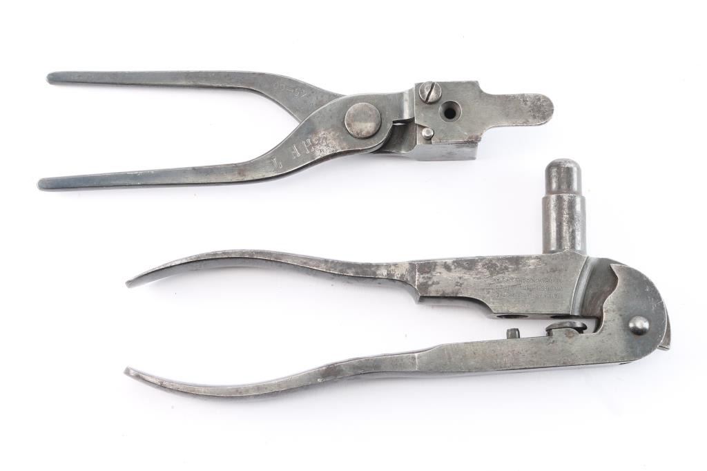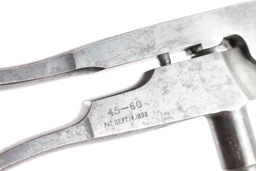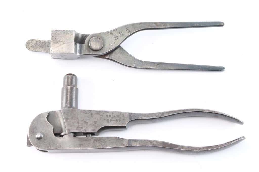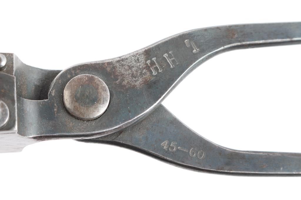 A. 45-60 mold hand-stamped H.H.7. Unmarked with 75% original blue and excellent cavity. Some pitting on sprue-cutter. B. Ideal loading tool 45-60 caliber - Sept 14, 1888 pt. date. No de capping pin. Good condition with 75/85% finish remaining and some minor pitting and erosion.