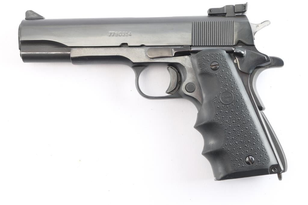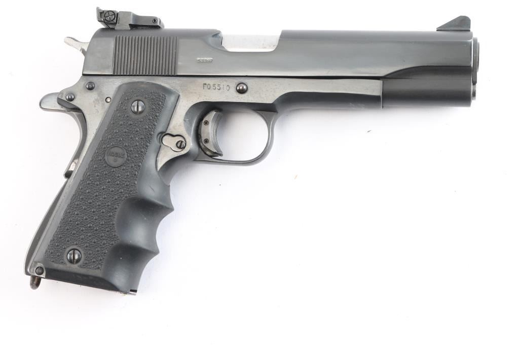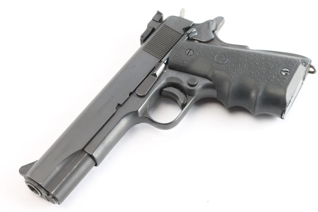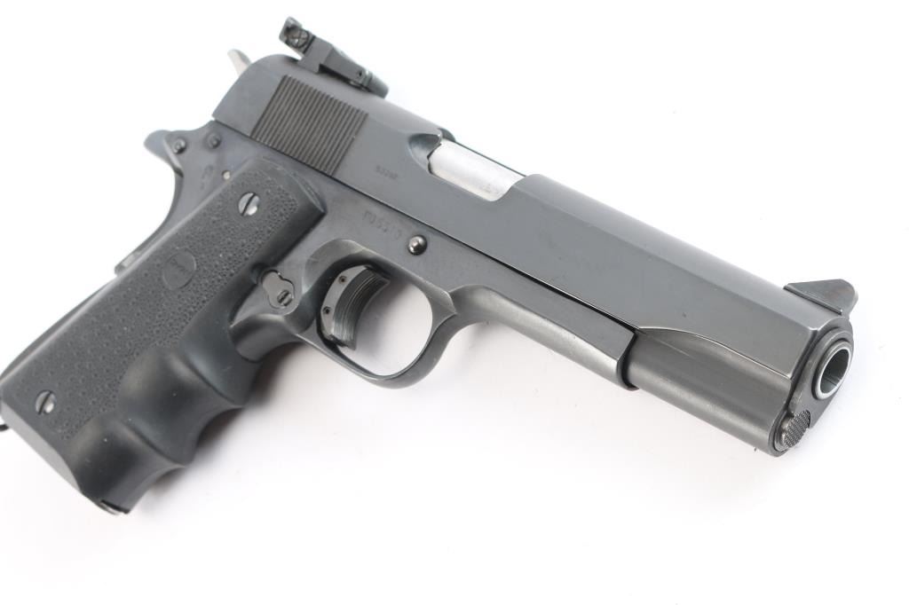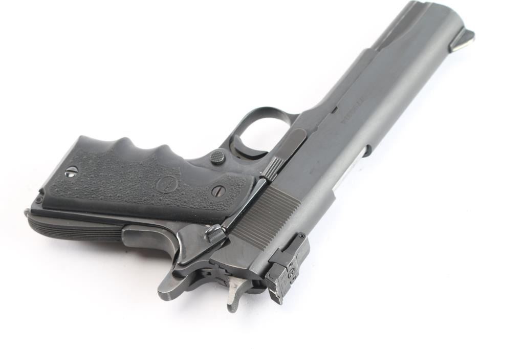 Semi-automatic '1911' - style pistol chambered in .45 ACP. Features a 5" barrel, front sight blade with white stripe and a Millett fully adjustable rear target sights, blued slide and frame, serrated curved wide trigger shoe, checkered hammer spur, slide stop, thumb safety, push button mag release, serrated front and back grip straps w/lanyard loop and grip safety. Hogue black rubber wrap-around textured finger groove grip. Bore is very good w/strong rifling. Retains approx. 95% finish with friction wear on moving parts. Action is smooth/tight. Comes with one 8rd metal magazine. NRA condition is very good. ***Modern Firearm***.