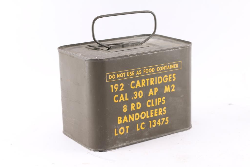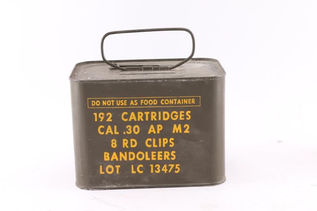 Unopened USGI "Spam Can" of 192 AP M2 .30-06 cartridges in 8 rd clips/Bandoleers.
