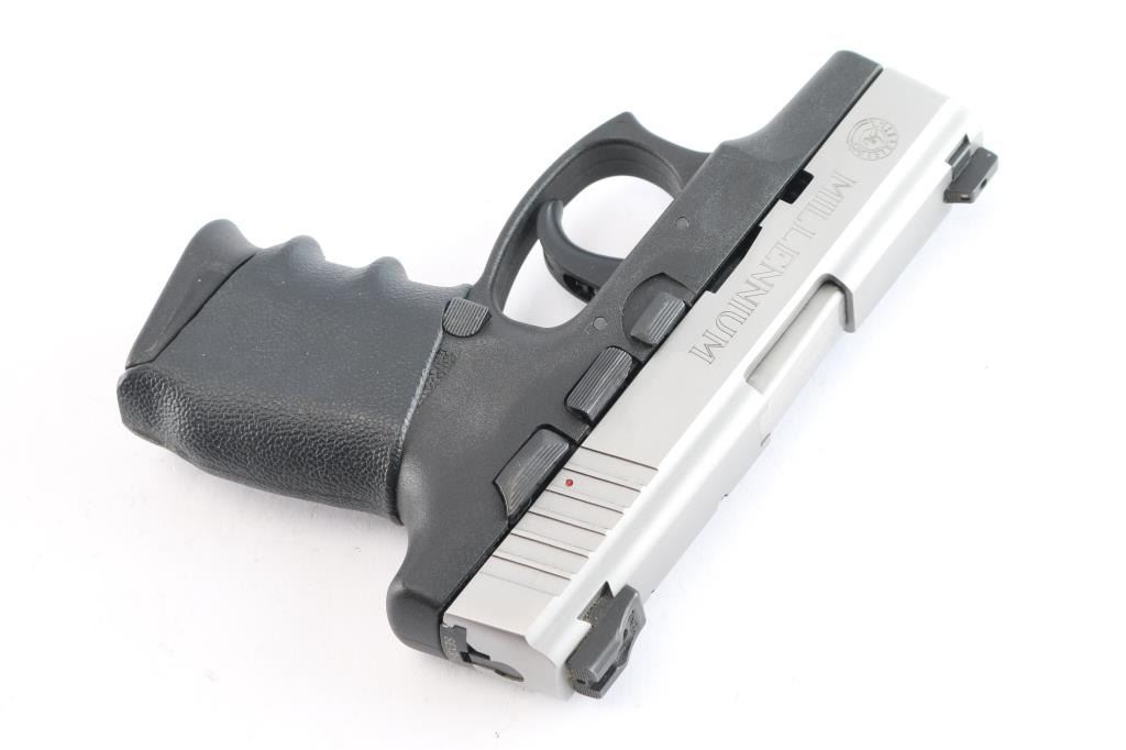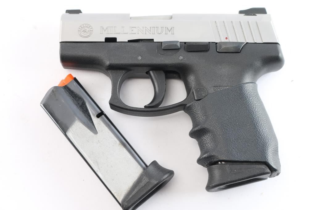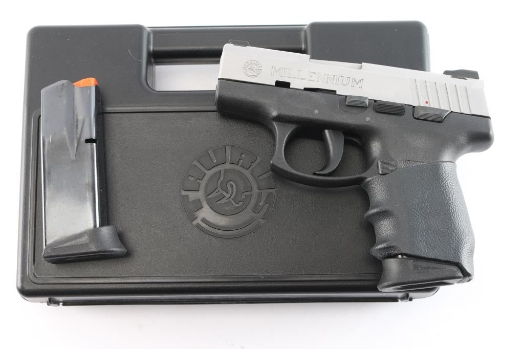 'Millennium' Brazilian made striker fired semi-automatic compact pistol chambered in .40 Smith & Wesson. Features a stainless steel slide with internal key lock safety, 3.25" barrel, Heinie high-contrast white dot sights, smooth polymer trigger, push button magazine release, 10 round factory magazine with finger rest floorplate, thumb safety on the left side of the frame, and black polymer frame with textured grip & added slip-up grip sleeve. Includes the original factory hard case with lock, brush, keys and spare magazine. Pistol exhibits minor handling marks and contact wear on the barrel hood. The action is mechanically sound with double-action restrike capability, the bore is excellent and polymer is excellent.