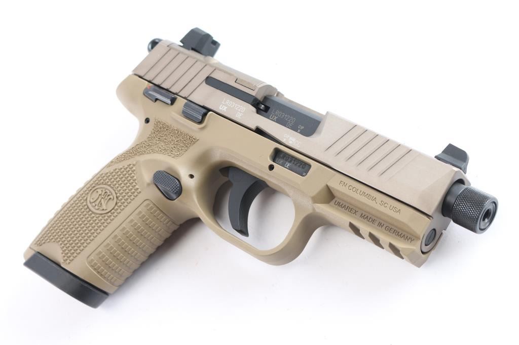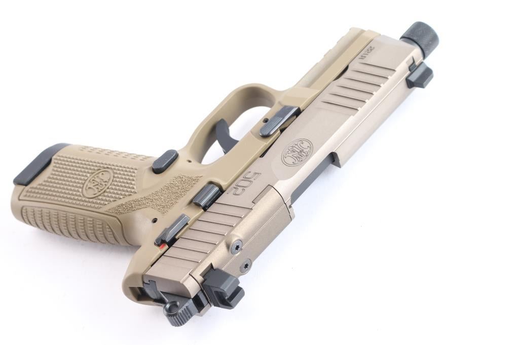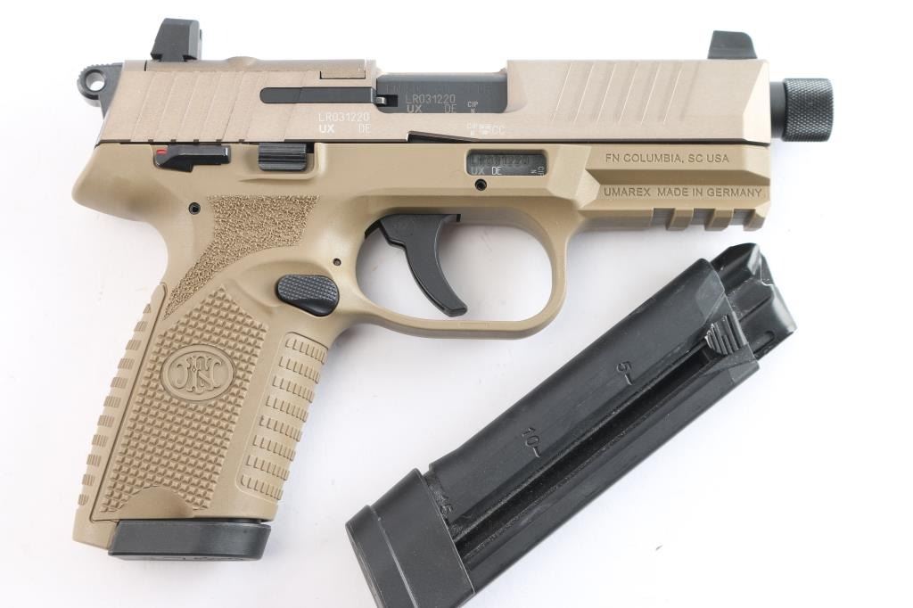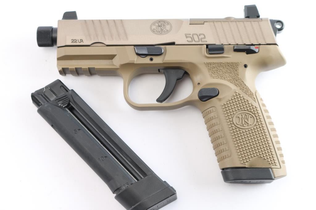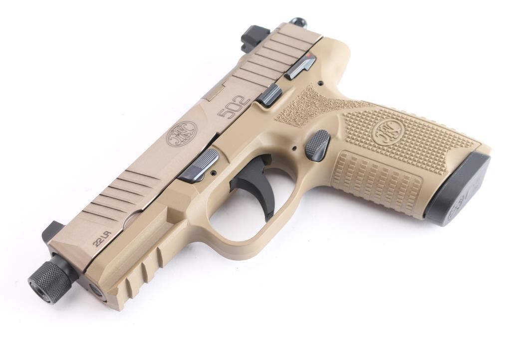 German made rimfire pistol with the size and style of the service type FN pistols, imported by FN USA Columbia SC. Features FDE slide, matte black controls and FDE polymer frame, 4.5" barrel with thread protector double action trigger with exposed serrated ring hammer, ambi manual frame mounted safety, ambi slide stop, ambi push button mag release, tall dovetail mounted sights, rear sight mounted on a blank plate to fill the slide's optic cut. Bore is pristine. Retains 98% finish . Includes factory hard plastic box, manual, several optic plates with rear sights attached, two 15 round magazines.