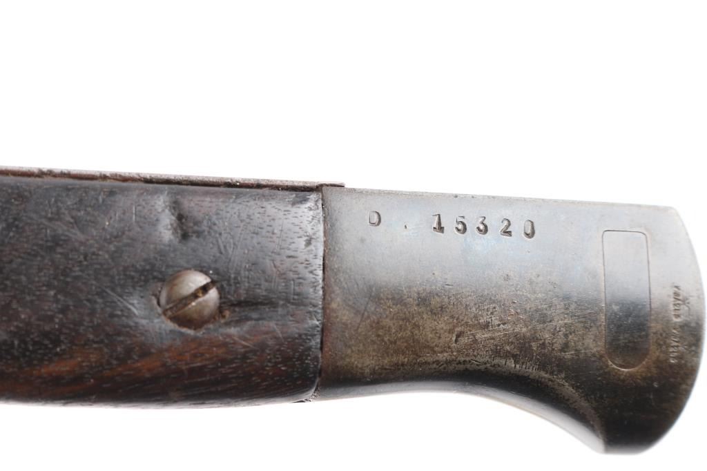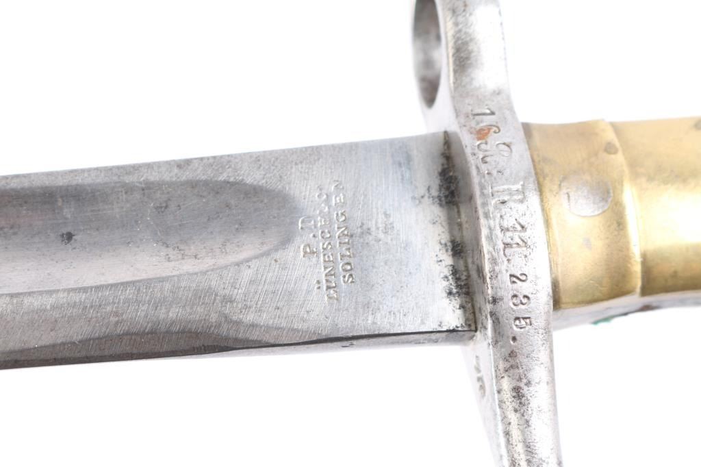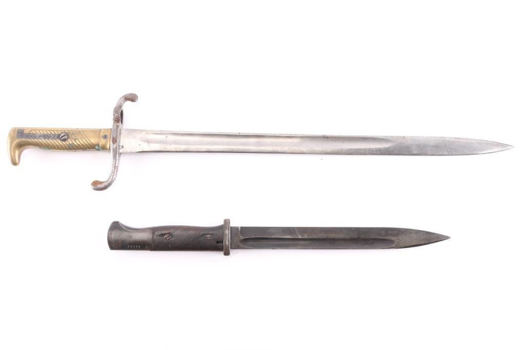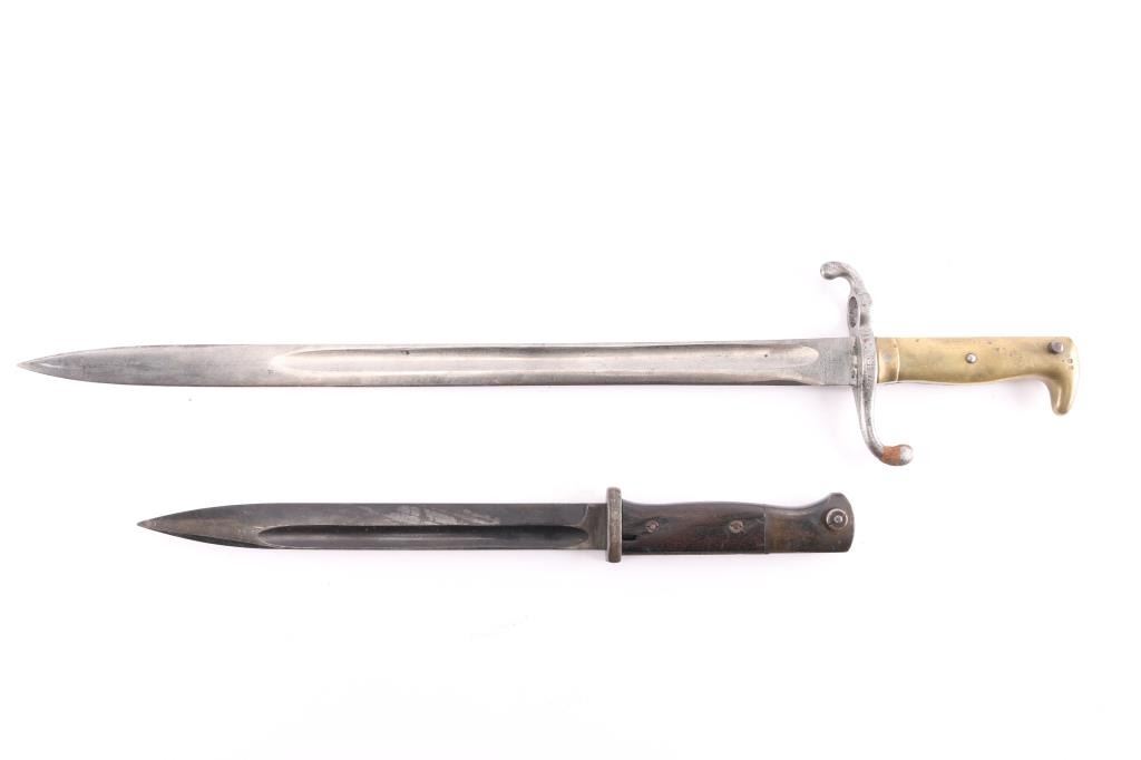 1) German WW2 K98k bayonet reissued in Argentina. Ricasso markings scrubbed, blue blade. Rifle serial number "D15320" stamped on pommel. Waffenamt eagle/WaA253" double stamped on pommel. No scabbard. 2) P.D. Luneschloss Imperial German M1871 Bayonet. Date is worn, crossguard is unit marked to a Reiter Regiment (cavalry). No scabbard. Both in very good condition.