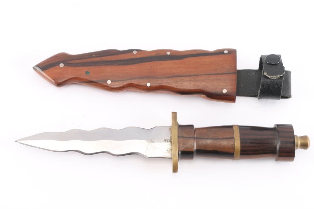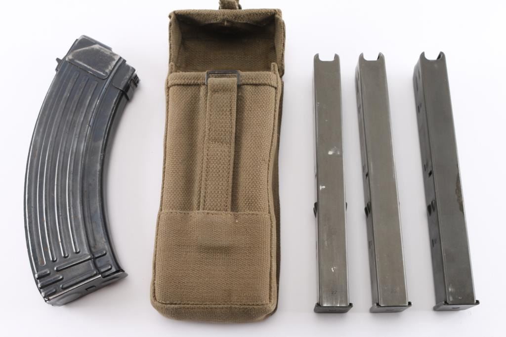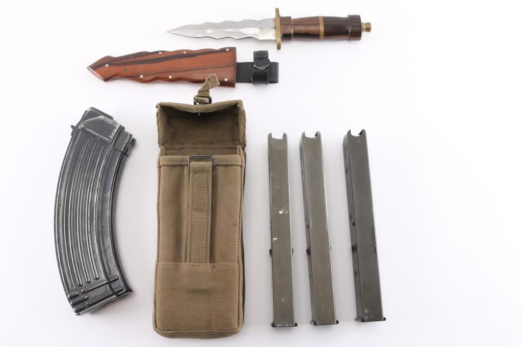 Includes one Yugoslavian 7.62X39AK 47 steel magazine, 30 round. Three German military (By by IMI) 32-rd 9mm Uzi magazines two marked '29' and one marked '22', with tan canvass pouch. unmarked 'wavy' blade dagger with double sided 5' blade, wood grip with brass fittings, riveted wood scabbard with belt loop. All in very good condition.