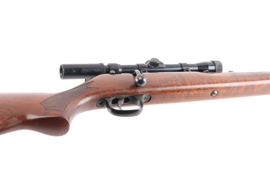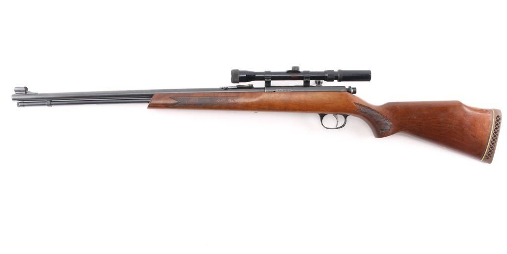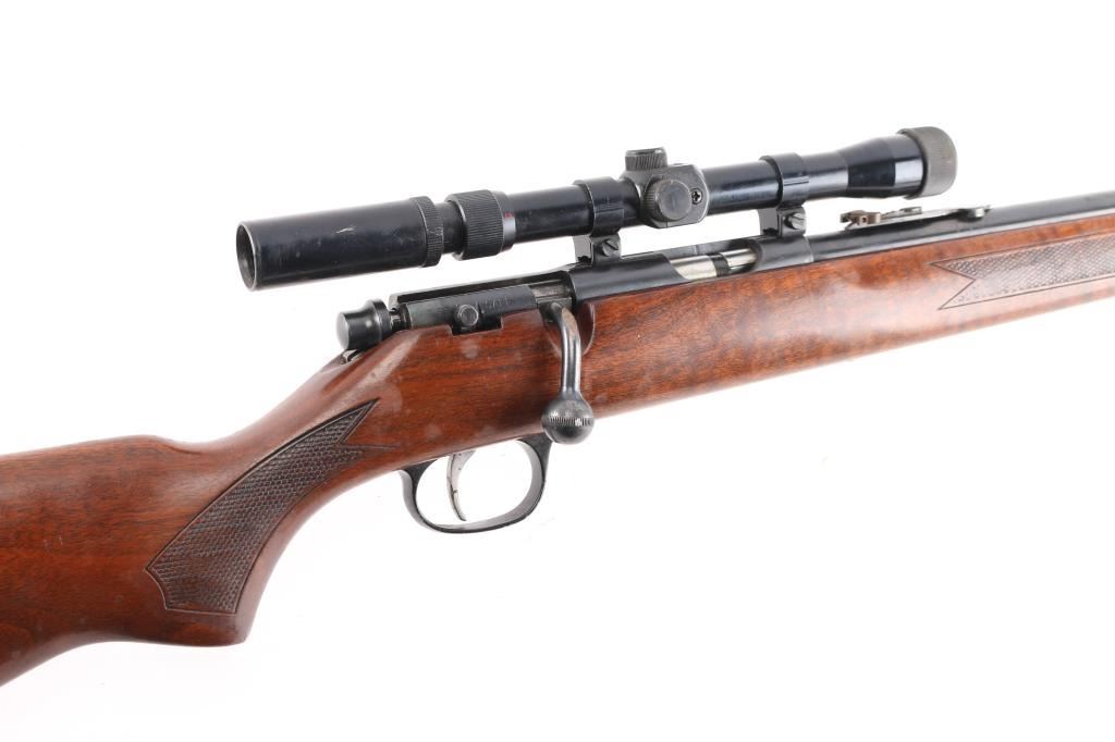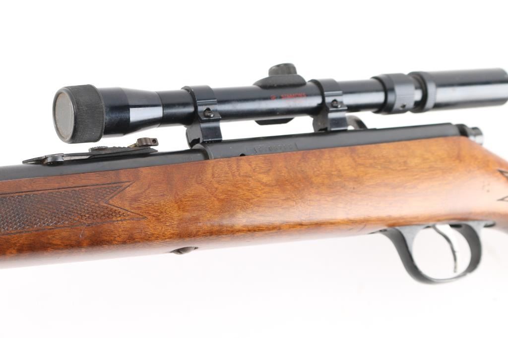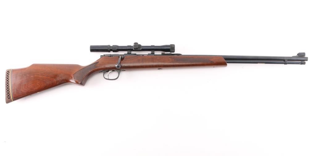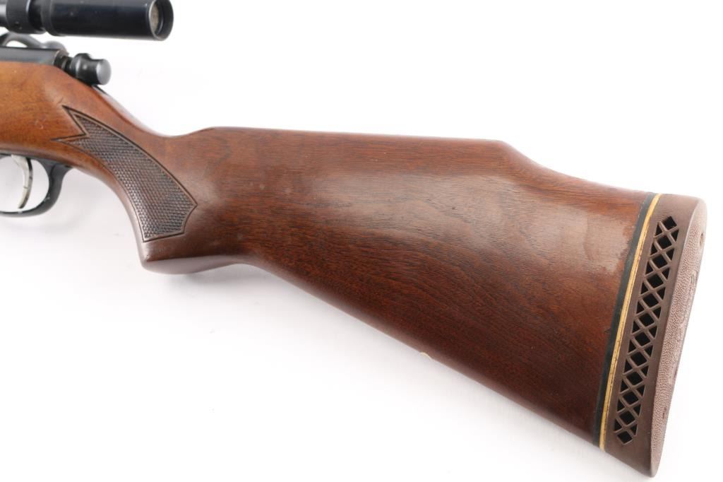 Bolt-action rifle. (1971-1988) 22" Micro-grove rifled barrel. Flip notch adjustable rear, and hooded front blade sights. Fed from a 13 rd full length tube magazine. One piece wood stock with checkered foregrip, and wrist, serrated trigger, right side thumb safety, "JM" marked barrel, cocking indicator. Bore is excellent/bright. Action is smooth/tight. Wood is very good, with some minor scratches/dings. Pachmyer vented rubber recoil pad is very good. Blued metal finish is about 94% with a scuff on the bolt handle showing white metal and a few minor scratches. Mounted with a Simmons 3X-7X20 scope, duplex reticle, clear optics.