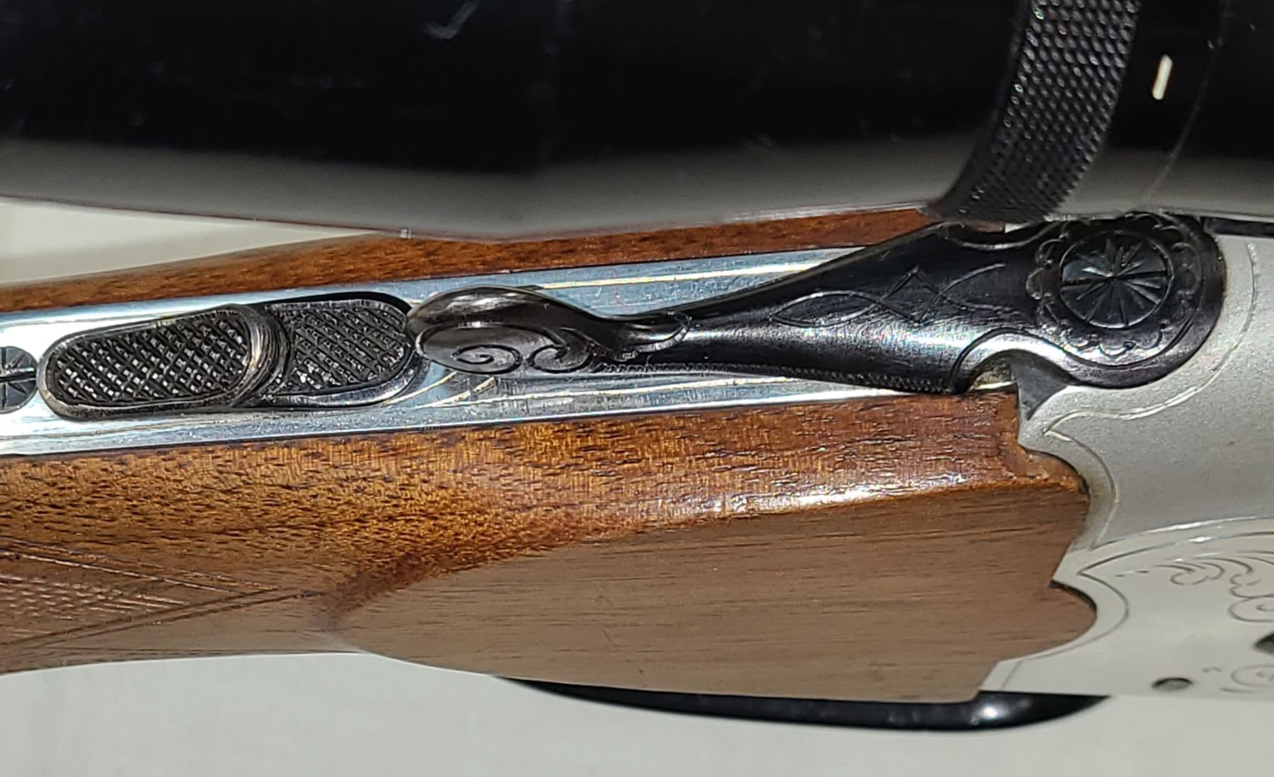 Highly polished receiver has some nice scroll engraving as shown. Bluing to barrels