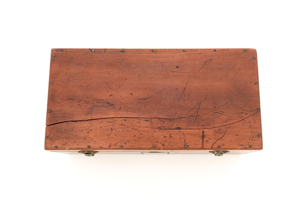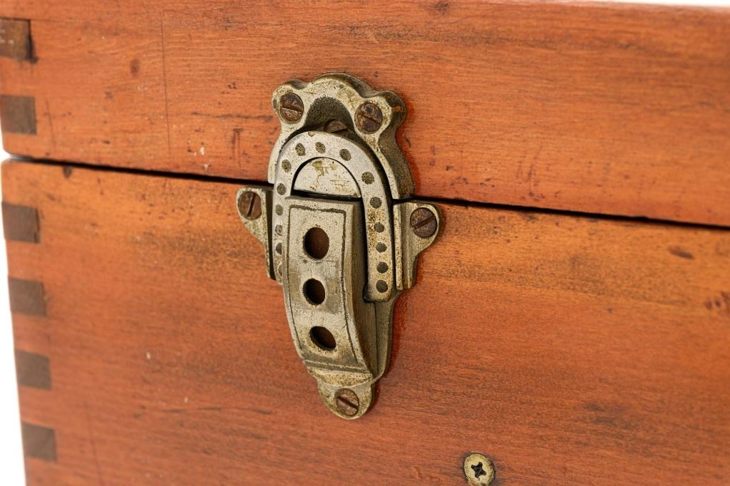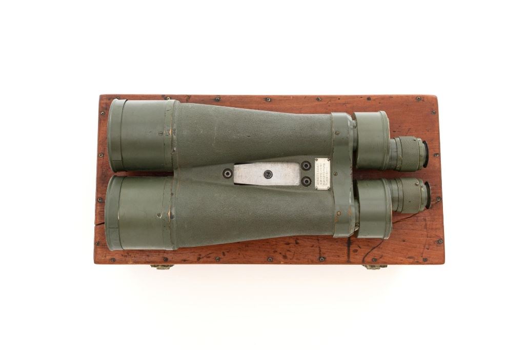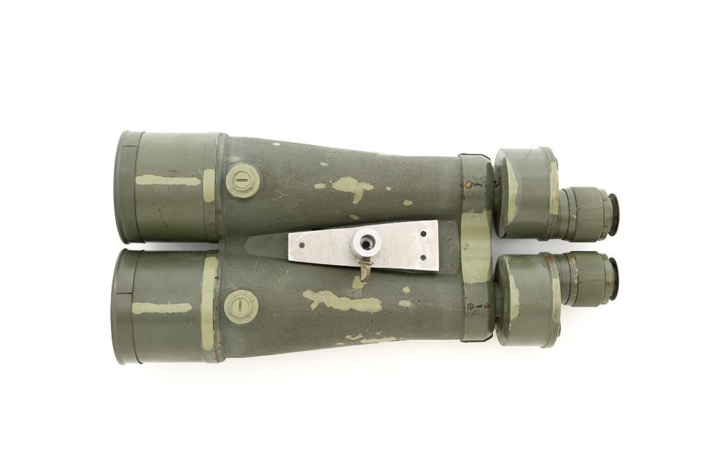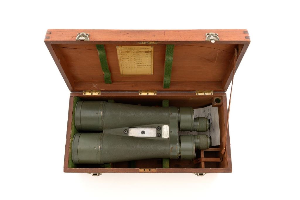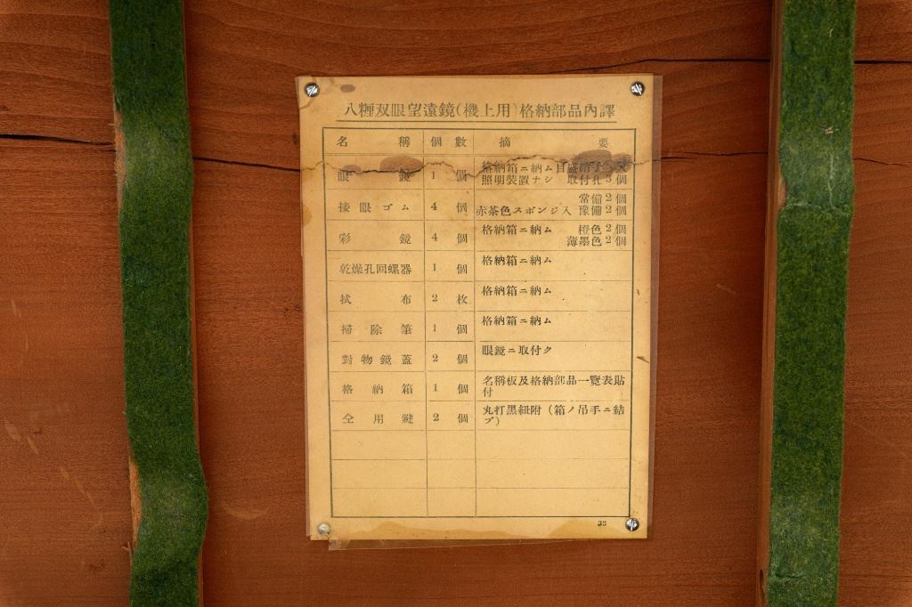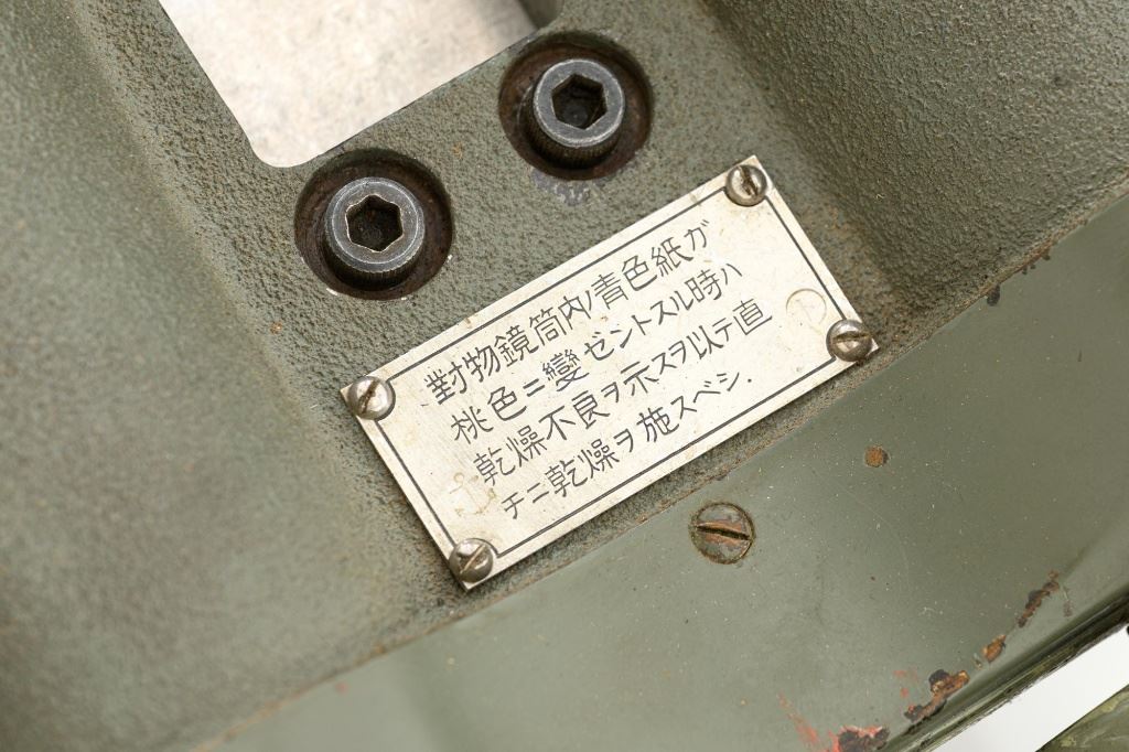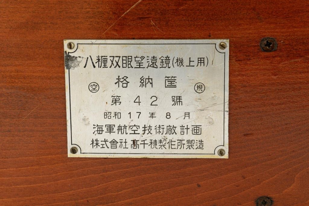 WWII Japanese 8cm Aircraft Binoculars by Takatiho, 15 x 80mm 4, Made in 1942, #42 with matching case. Marked with the Kugisho "Naval Air Technical Department" characters. Metal plate on the matching numbered case reads in Japanese "8cm Binoculars Telescope (For Airborne Use) / Storage Case No. 42 / Dated August, Showa 17 / Designed by the Naval Air Technical Arsenal - Manufactured by Takatiho Seisakusho Co., Ltd." Lenses remain in excellent condition, with only a slight haze seen inside, mostly on the left side, when looking from the objective end. Individually-focused oculars, with diopter adjustment markings from -4 to +2. Aluminum plate at the top states that when the desiccant paper inside turns from blue to pink, measures should be taken to dry the piece. Green paint on the body is very good on top. Below, worn areas were touched-up with a lighter green enamel. An aluminum mounting plate is attached using the existing holes and accepts a 1/2" diameter rod. Brass lens covers are present. Wood case measures 10-1/2" x 21-1/2" x 8-1/2" and remains in very good condition, with secure dovetailed corners. Top has two old splits but nothing loose. Hardware is in good condition, with one replacement screw on the right latch. Green felt on the inside supports is worn. Leather pieces are in good condition. Parts list affixed inside the top shows two keys, which are missing. Red and dark green colored ocular filters look to be the only small parts present. Binoculars are 18-1/2" long and weigh 18 lb. Est.: $1,500-$2,000.