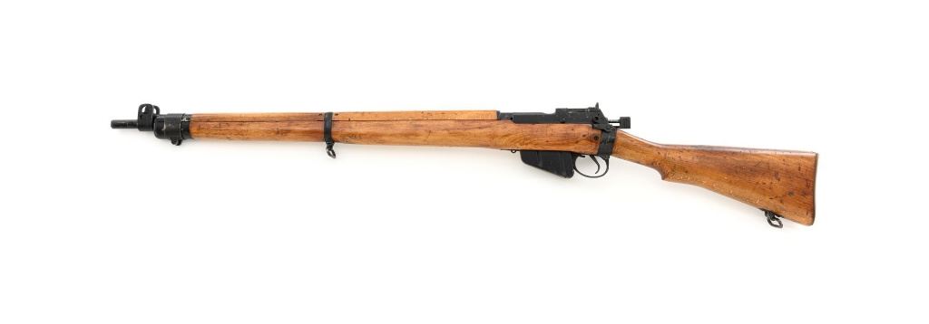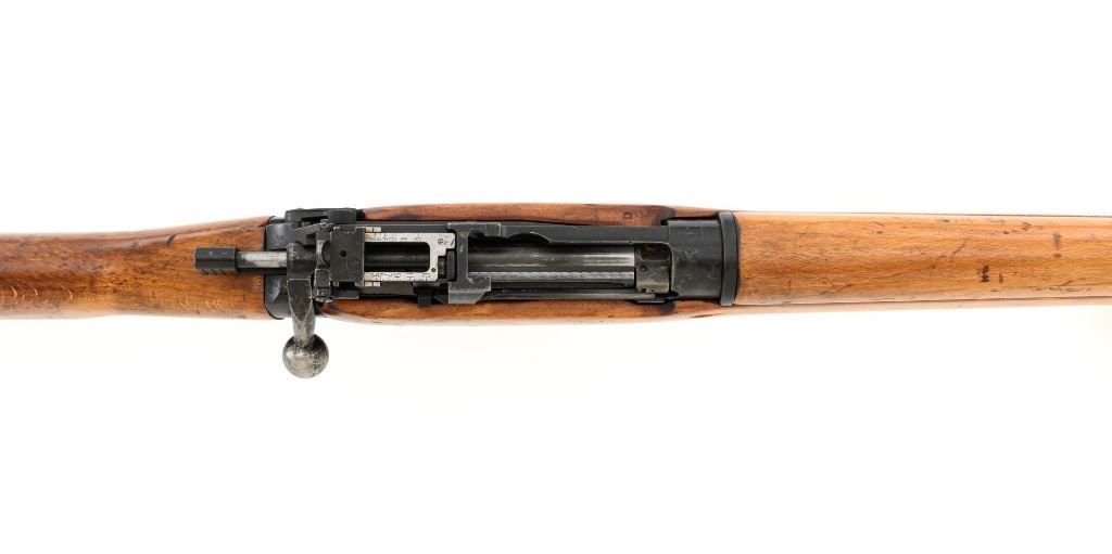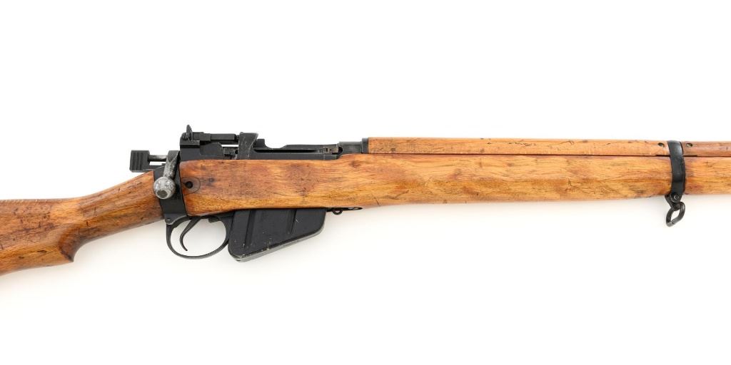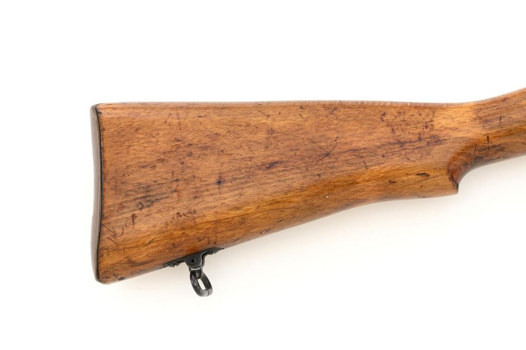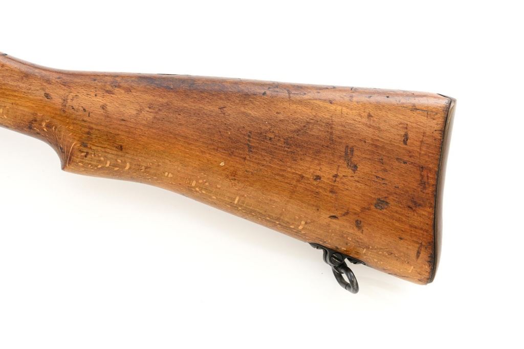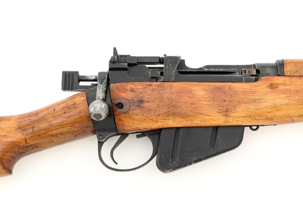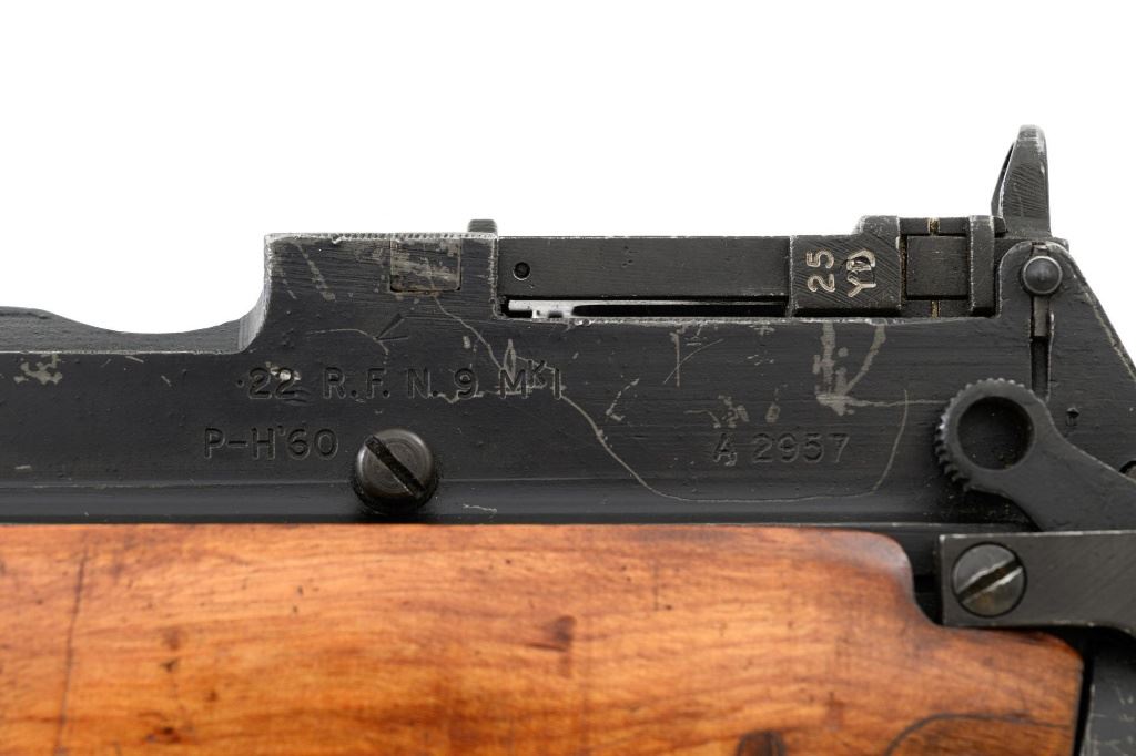 British Parker Hale No.9 Mk 1 Lee Enfield Bolt Action Training Rifle, #A2957, .22 rimfire cal., 25.2" barrel, blackened finish, hardwood stock set with hand guard, blade front sight with protectors, original folding leaf rear sight with aperture and battle sight remains in place, and a new setting marked "25 YD" has been added to left side of the elevator. Rifle is a standard No.4 that was converted to a training rifle by Parker Hale for the British Royal Navy by installing a new bolt head with an offset firing pin and a new barrel marked "PARKER RIFLED A.G.P." on the crown. The follower has been removed from the magazine. Left side of the receiver is marked ".22 R.F.N.9 Mk 1/P-H60". Matching numbers on bolt handle and forend. Number on the magazine has been crossed out. Import marked on left side of the barrel. Condition overall is very good, retaining approx.75%-80% blackened finish, with scattered wear and handling marks. Wood is very good, with added finish, showing impressions and handling marks. Action operates smoothly. Bore is bright with very good rifling. Est.: $800-$1,100. (C&R)