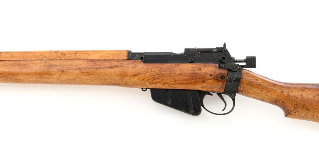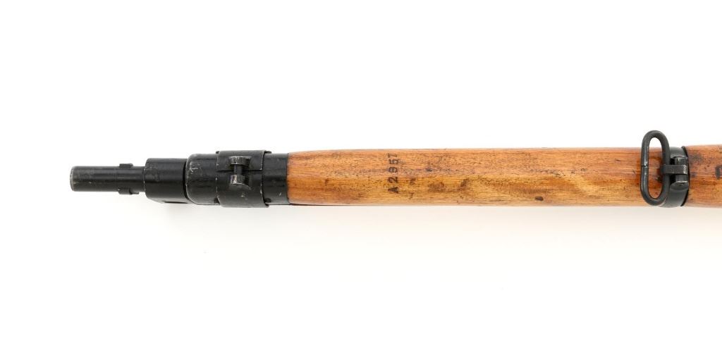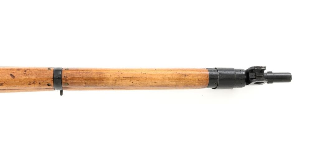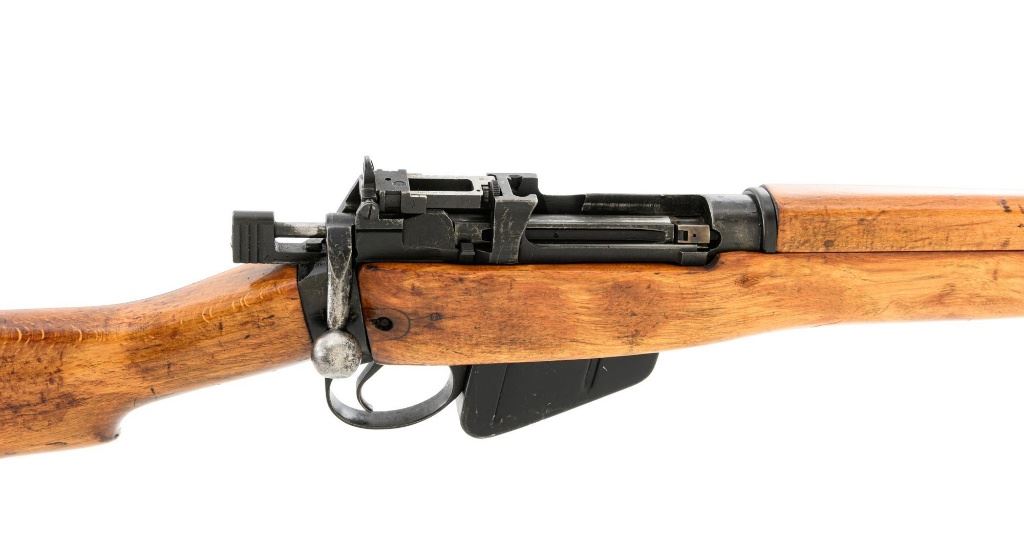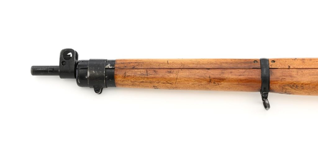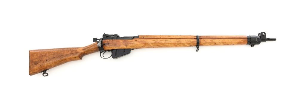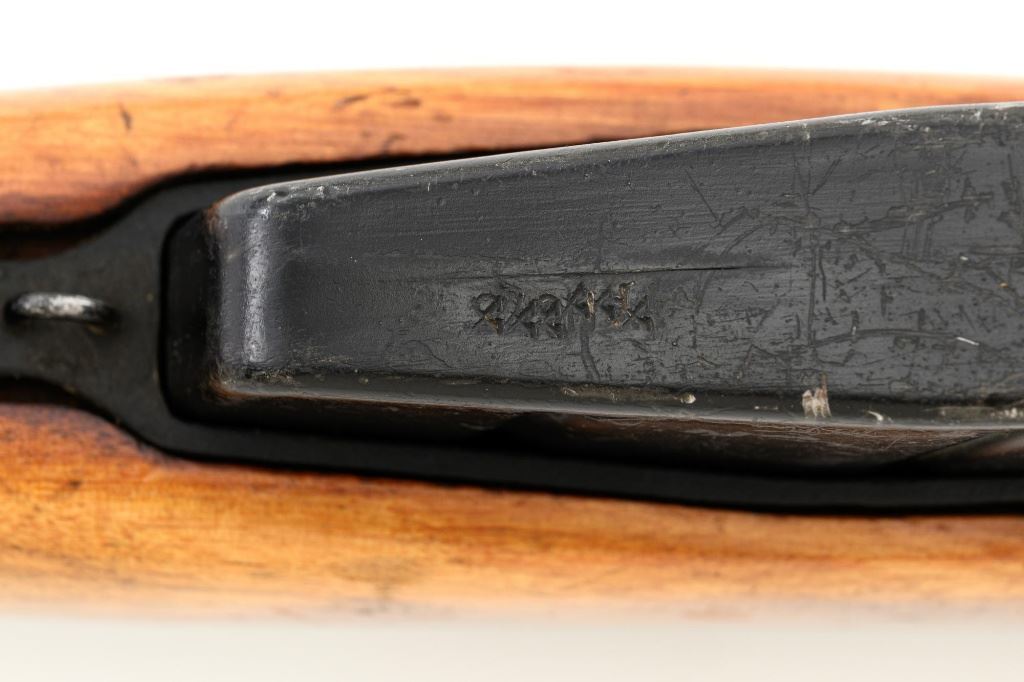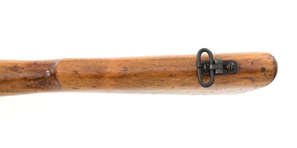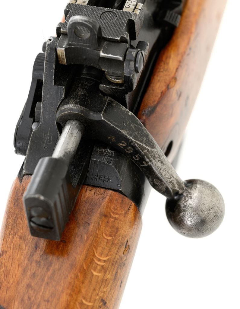 British Parker Hale No.9 Mk 1 Lee Enfield Bolt Action Training Rifle, #A2957, .22 rimfire cal., 25.2" barrel, blackened finish, hardwood stock set with hand guard, blade front sight with protectors, original folding leaf rear sight with aperture and battle sight remains in place, and a new setting marked "25 YD" has been added to left side of the elevator. Rifle is a standard No.4 that was converted to a training rifle by Parker Hale for the British Royal Navy by installing a new bolt head with an offset firing pin and a new barrel marked "PARKER RIFLED A.G.P." on the crown. The follower has been removed from the magazine. Left side of the receiver is marked ".22 R.F.N.9 Mk 1/P-H60". Matching numbers on bolt handle and forend. Number on the magazine has been crossed out. Import marked on left side of the barrel. Condition overall is very good, retaining approx.75%-80% blackened finish, with scattered wear and handling marks. Wood is very good, with added finish, showing impressions and handling marks. Action operates smoothly. Bore is bright with very good rifling. Est.: $800-$1,100. (C&R)
