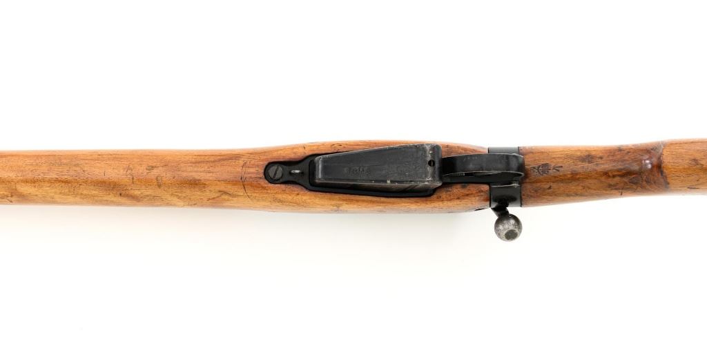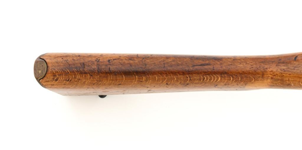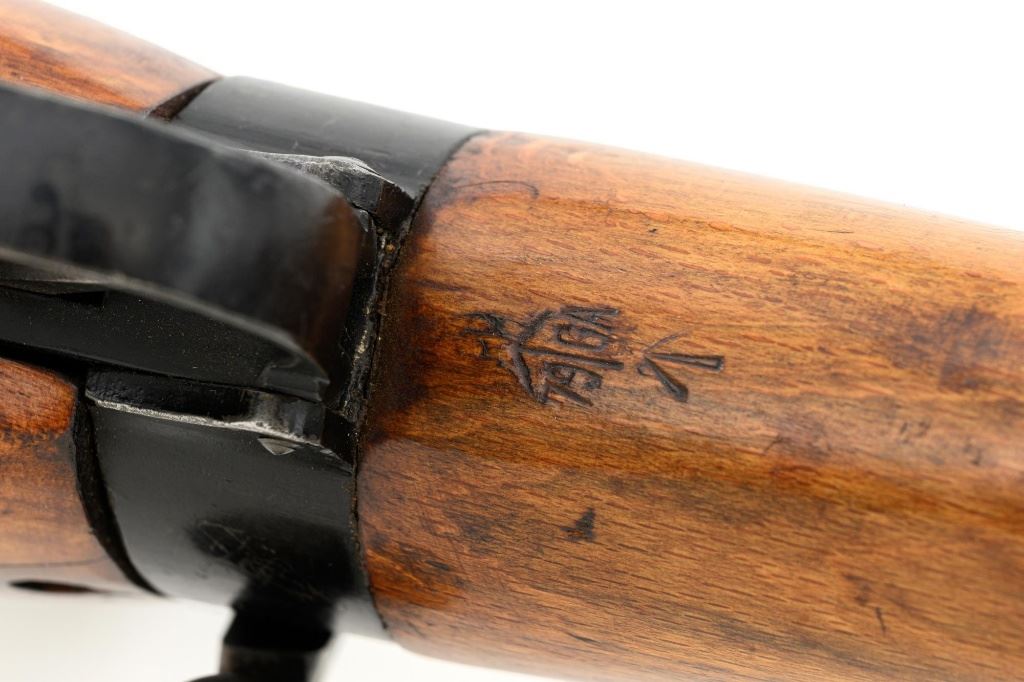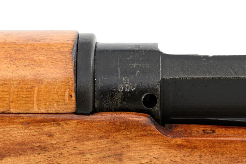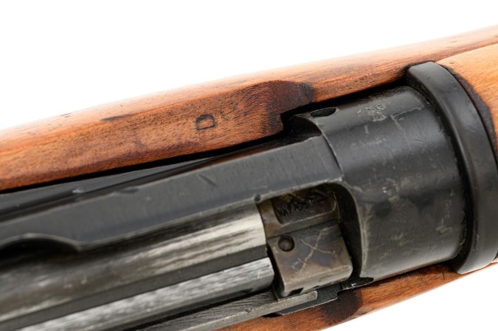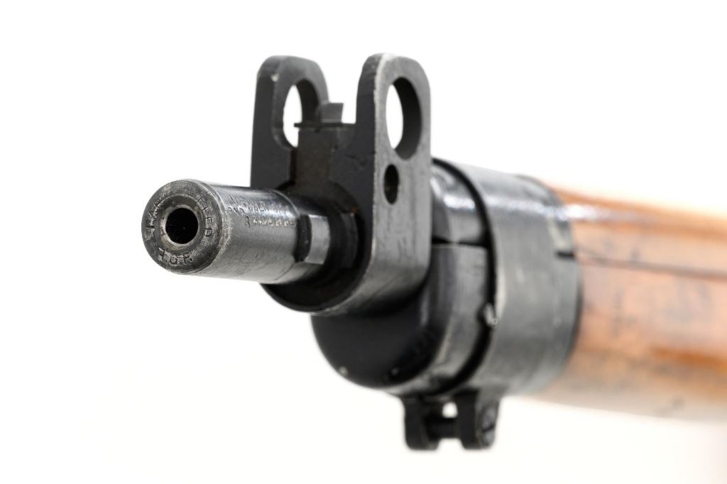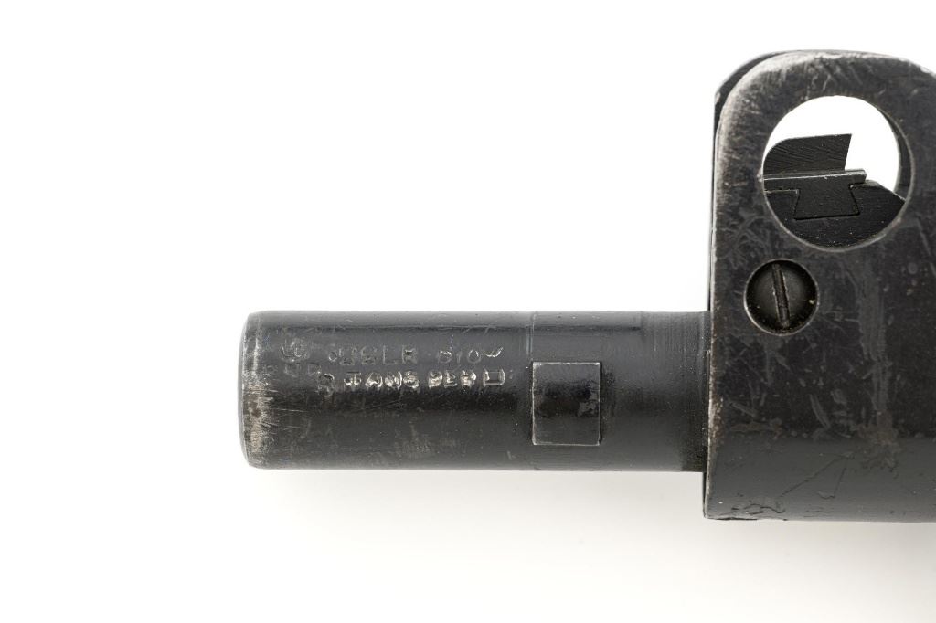 British Parker Hale No.9 Mk 1 Lee Enfield Bolt Action Training Rifle, #A2957, .22 rimfire cal., 25.2" barrel, blackened finish, hardwood stock set with hand guard, blade front sight with protectors, original folding leaf rear sight with aperture and battle sight remains in place, and a new setting marked "25 YD" has been added to left side of the elevator. Rifle is a standard No.4 that was converted to a training rifle by Parker Hale for the British Royal Navy by installing a new bolt head with an offset firing pin and a new barrel marked "PARKER RIFLED A.G.P." on the crown. The follower has been removed from the magazine. Left side of the receiver is marked ".22 R.F.N.9 Mk 1/P-H60". Matching numbers on bolt handle and forend. Number on the magazine has been crossed out. Import marked on left side of the barrel. Condition overall is very good, retaining approx.75%-80% blackened finish, with scattered wear and handling marks. Wood is very good, with added finish, showing impressions and handling marks. Action operates smoothly. Bore is bright with very good rifling. Est.: $800-$1,100. (C&R)