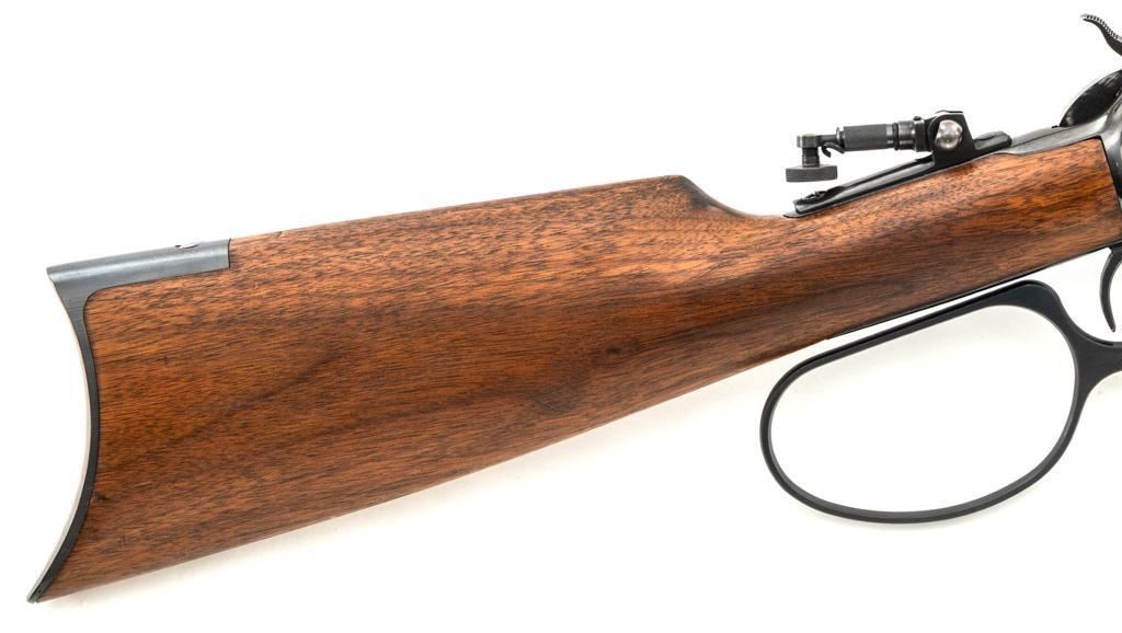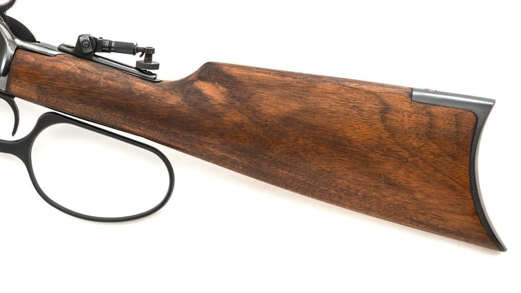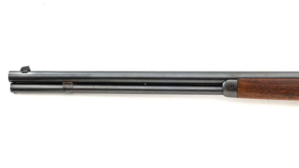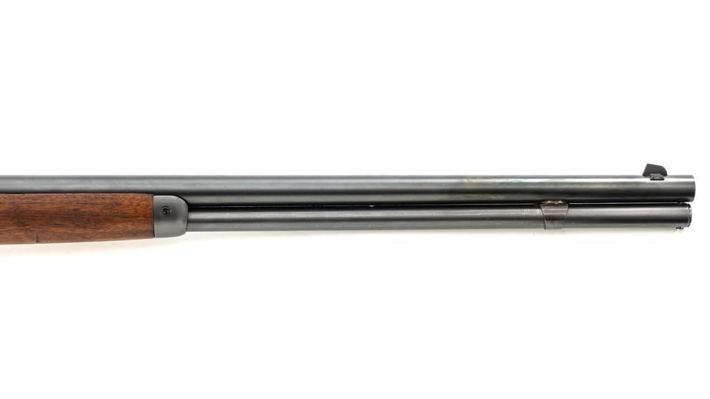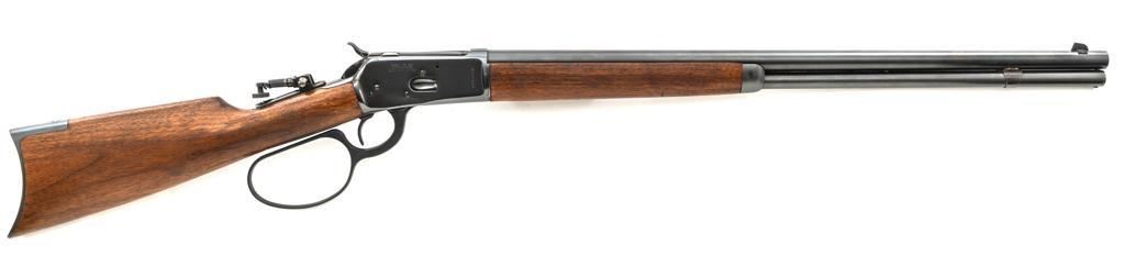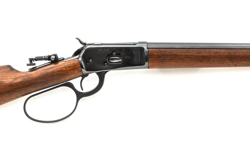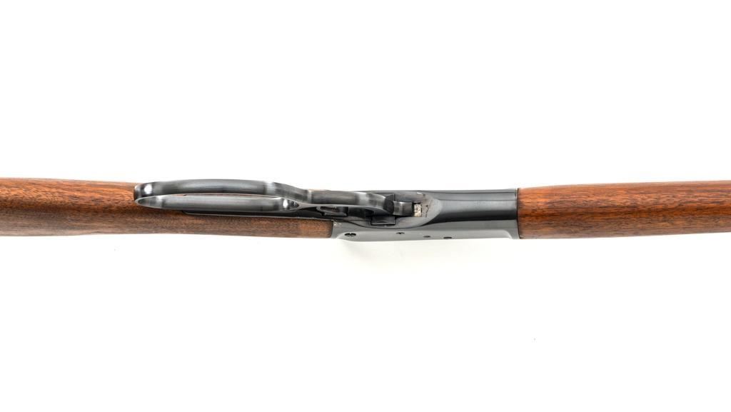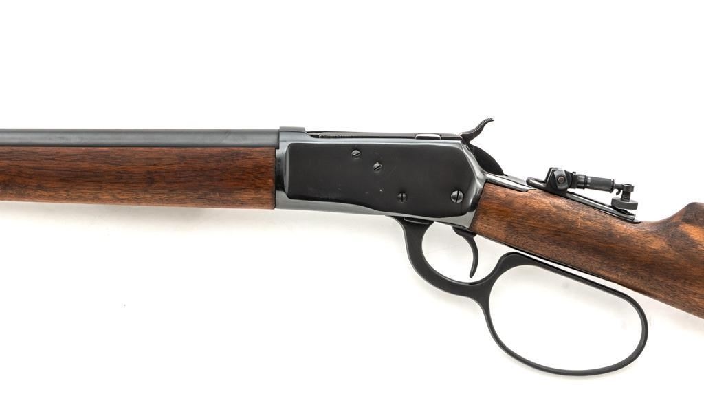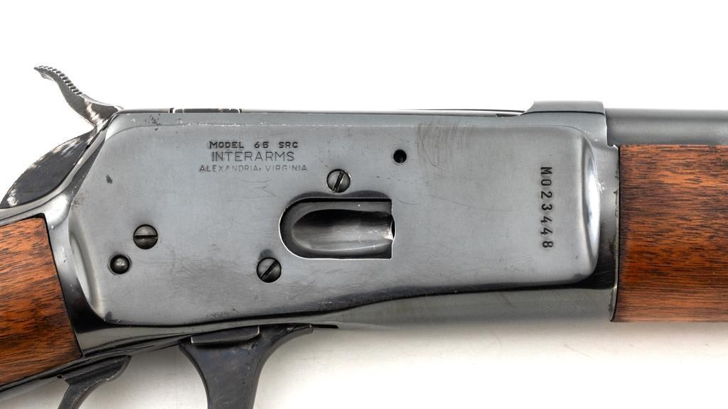 Rossi Model 65 Lever Action Rifle, #M023448, .44 Mag. cal., 24" round barrel, blue finish, smooth walnut forend and straight grip stock, ending with a smooth blue steel crescent buttplate, providing a 12.5" LOP. Rifle also features an oversized lever, blade front sight, and adjustable aperture sight at the tang. The original factory lever is included. Rifle is in near excellent overall condition, retaining approx. 97%-98% factory blue, with scattered light handling marks and minor surface rust where the barrel and magazine are attached. Receiver shows scattered light scratches and storage marks. Stock is in excellent condition, displaying only minor marks. Action functions smoothly. Bore is near excellent with well-defined rifling. Est.: $500-$700. (Modern)