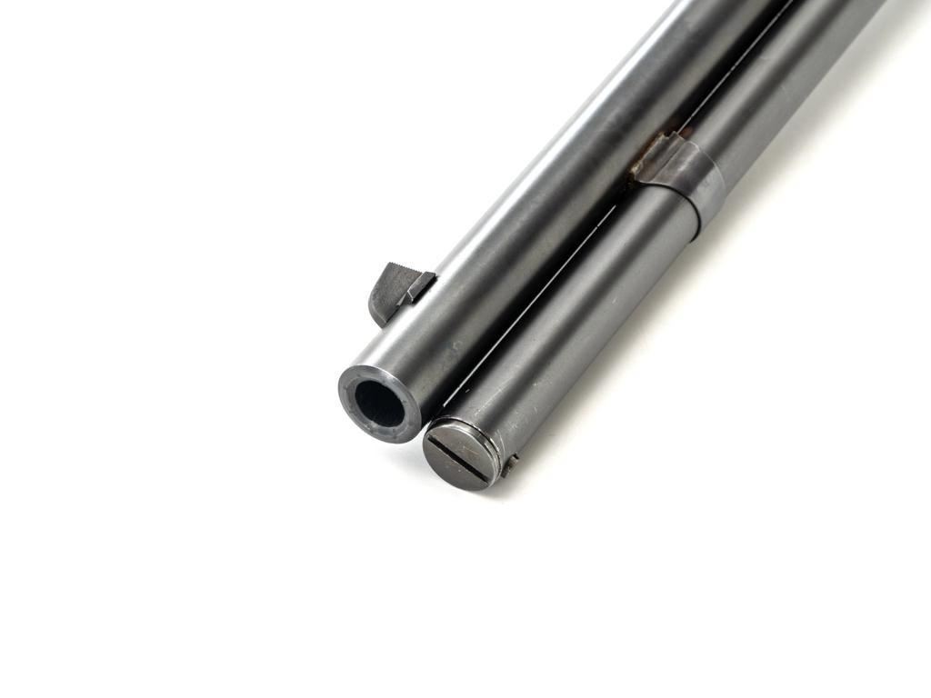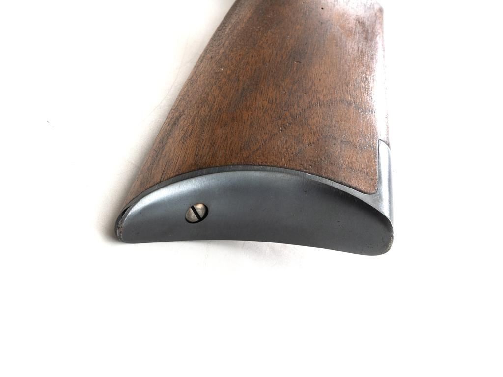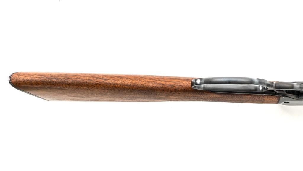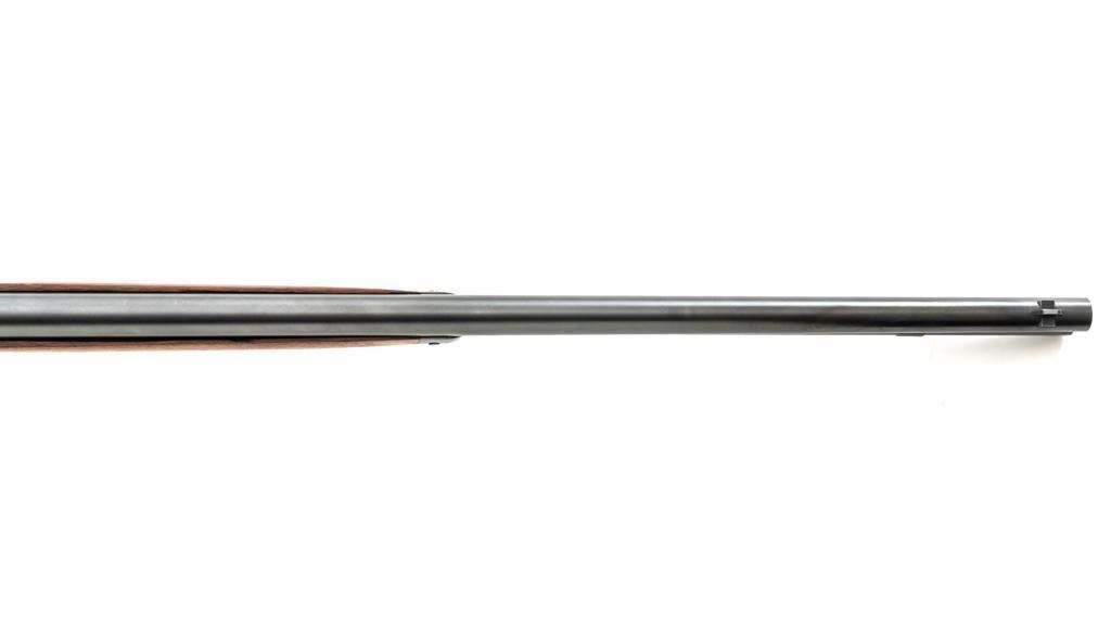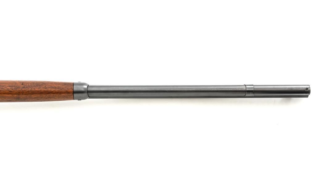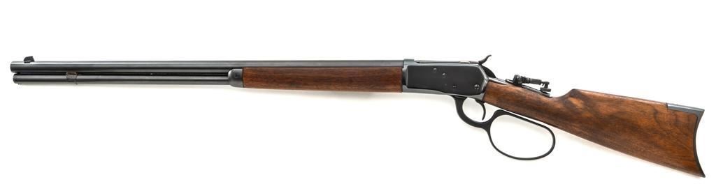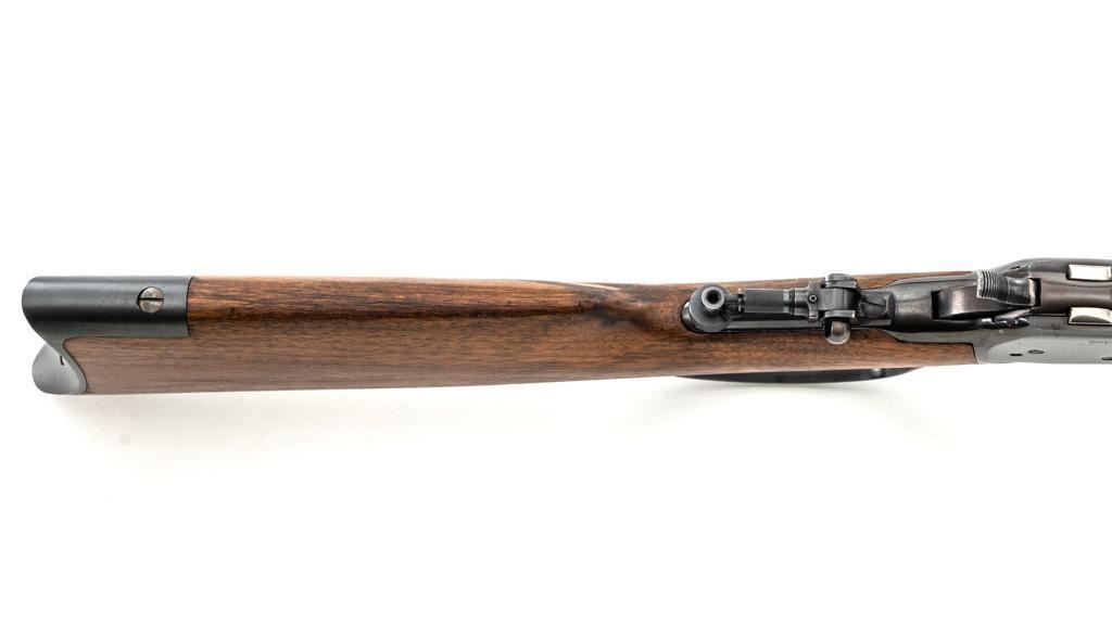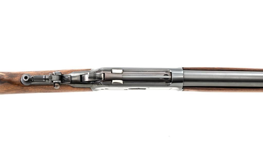 Rossi Model 65 Lever Action Rifle, #M023448, .44 Mag. cal., 24" round barrel, blue finish, smooth walnut forend and straight grip stock, ending with a smooth blue steel crescent buttplate, providing a 12.5" LOP. Rifle also features an oversized lever, blade front sight, and adjustable aperture sight at the tang. The original factory lever is included. Rifle is in near excellent overall condition, retaining approx. 97%-98% factory blue, with scattered light handling marks and minor surface rust where the barrel and magazine are attached. Receiver shows scattered light scratches and storage marks. Stock is in excellent condition, displaying only minor marks. Action functions smoothly. Bore is near excellent with well-defined rifling. Est.: $500-$700. (Modern)