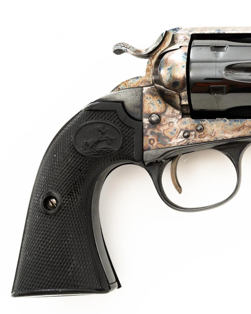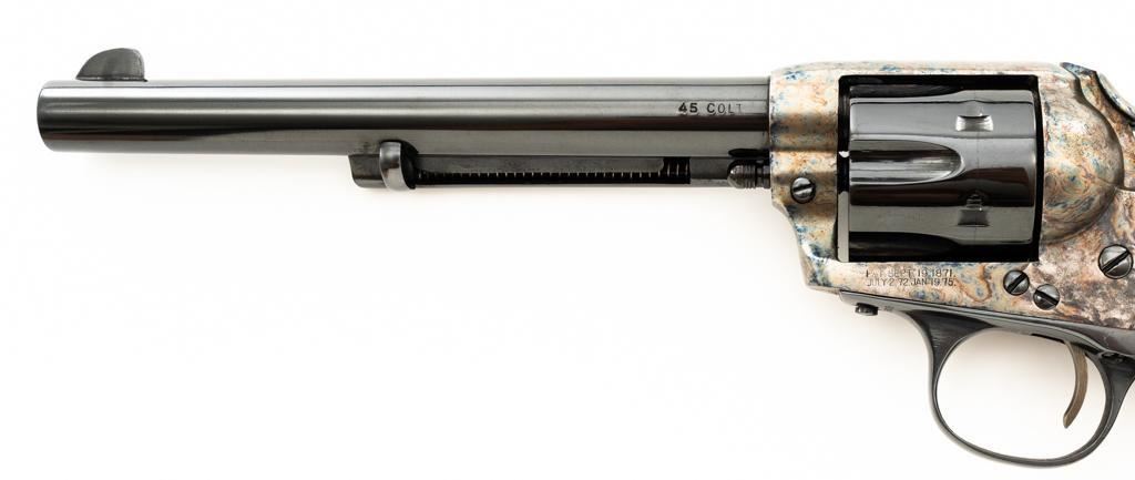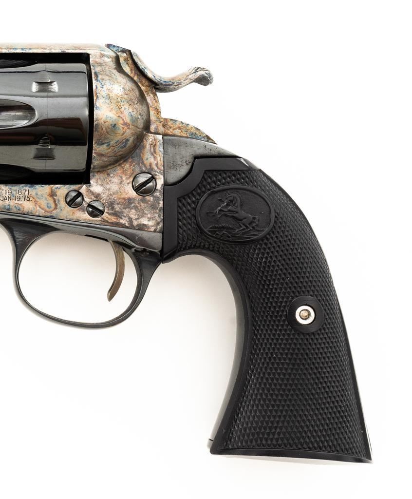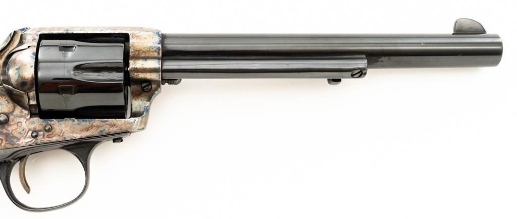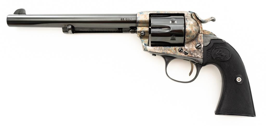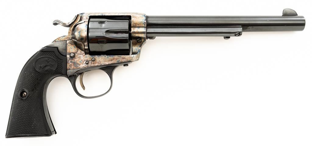 Colt Bisley Single Action Revolver, #196909, .45 Colt cal., 7.5" barrel, blue and color case hardened finish, checkered hard rubber two-piece grips with Colt monogram, blade front sight, and fixed "V"-notch rear sight. Inside of the loading gate is marked "1521". Frame shows clear factory markings but the barrel address and Bisley markings have been removed. Left side of the barrel is marked ".45 COLT". Mfgd 1899. Revolver is in near excellent condition as refinished, retaining approx. 97%-98% of an old reblued finish, with light scratches and handling marks along the barrel. Backstrap shows scratches and the serial number at the butt is faint, having been over polished. Case colors on the frame are vivid. Grips are near excellent with the interior of the right panel marked "VICTOR PABST / TACOMA, WA" and "BORNE / AUG. 5, 1891". It is unfortunate that the grips fit poorly. Action will require service as it only functions intermittently and will not hold at full-cock. Bore is good, with some areas of light erosion and well-defined rifling. Est.: $900-$1,200. (C&R)