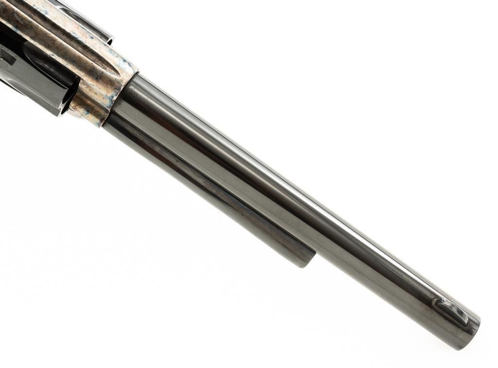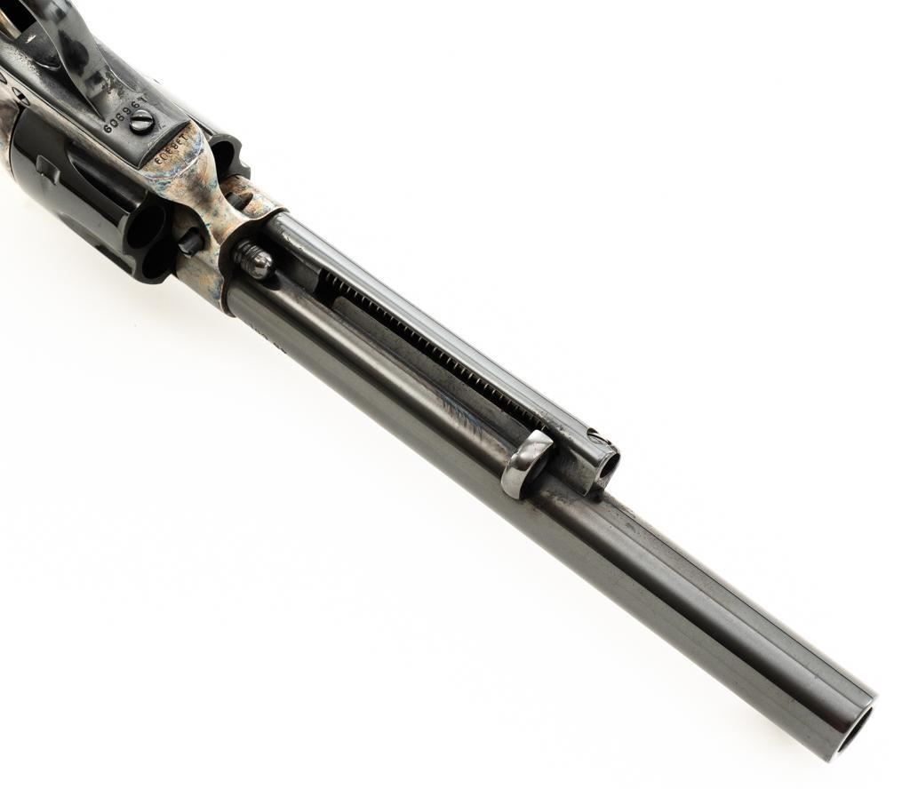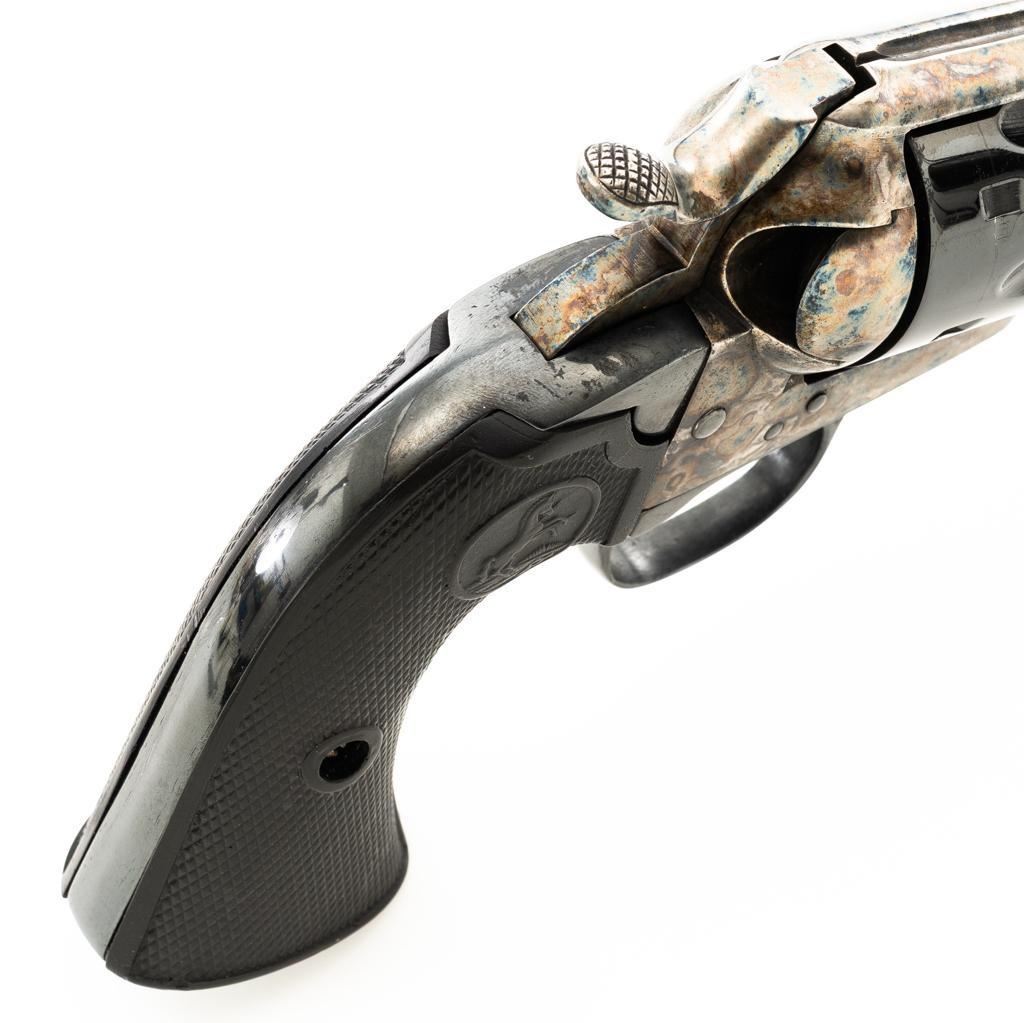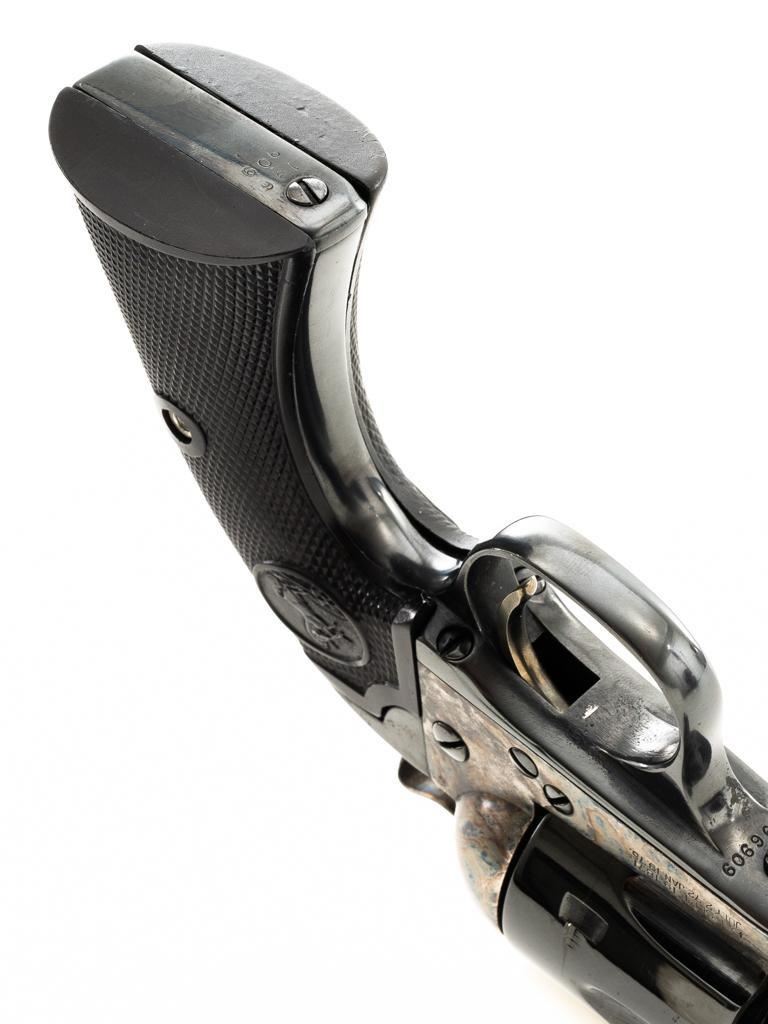Colt Bisley Single Action Revolver, #196909, .45 Colt cal., 7.5" barrel, blue and color case hardened finish, checkered hard rubber two-piece grips with Colt monogram, blade front sight, and fixed "V"-notch rear sight. Inside of the loading gate is marked "1521". Frame shows clear factory markings but the barrel address and Bisley markings have been removed. Left side of the barrel is marked ".45 COLT". Mfgd 1899. Revolver is in near excellent condition as refinished, retaining approx. 97%-98% of an old reblued finish, with light scratches and handling marks along the barrel. Backstrap shows scratches and the serial number at the butt is faint, having been over polished. Case colors on the frame are vivid. Grips are near excellent with the interior of the right panel marked "VICTOR PABST / TACOMA, WA" and "BORNE / AUG. 5, 1891". It is unfortunate that the grips fit poorly. Action will require service as it only functions intermittently and will not hold at full-cock. Bore is good, with some areas of light erosion and well-defined rifling. Est.: $900-$1,200. (C&R)