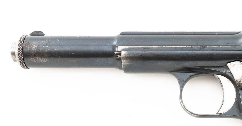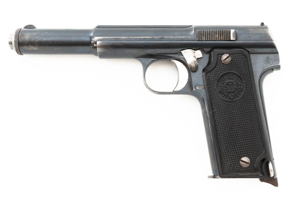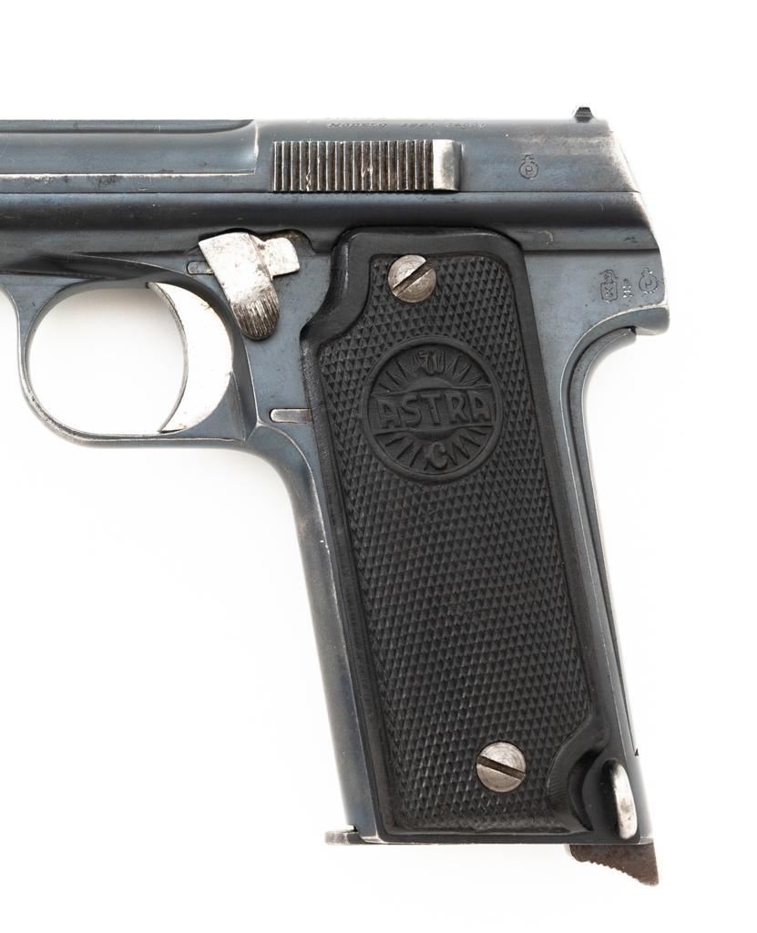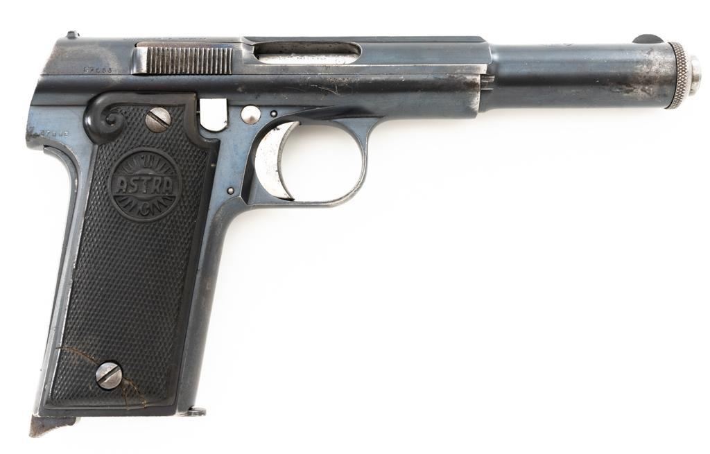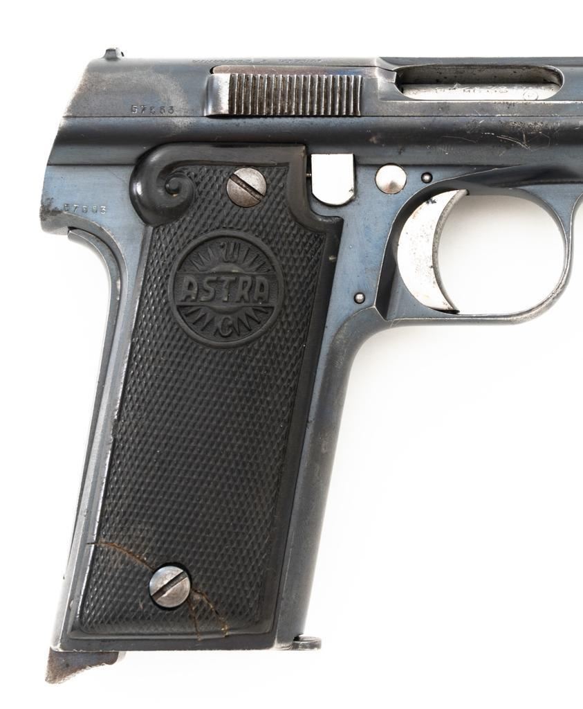 Spanish Astra Model 400 Semi-Automatic Pistol, #57553, 9mm Largo cal., 5.9" barrel, blued finish with bright trigger and safety, checkered hardwood grips, blade front sight, fixed rear sight with "U"-notched groove, and fixed steel lanyard loop. Includes one blued steel "ASTRA" marked magazine. Top is marked with "ASTRA" company logo, "PISTOLA DE 9M/M (38)/MODELO 1921(400)", and "UNCETA Y COMPANIA/GUERNICA ESPANA" on the rear of the slide. Barrel "9 M/M & 38/57553(firing proof)" at the ejection port. There are Spanish proof and inspection stamps on left side of the frame and barrel. Matching numbers on the frame and slide. No visible import marks. Condition overall is very good, retaining approx.75%-80% blue, with wear, toning, and patina to the slide and front grip strap. Right side grip with a crack across the lower screw. Left grip is good, showing age and handling wear. Action operates smoothly. Bore is bright with very good rifling. Est.: $300-$500. (C&R/PPT)