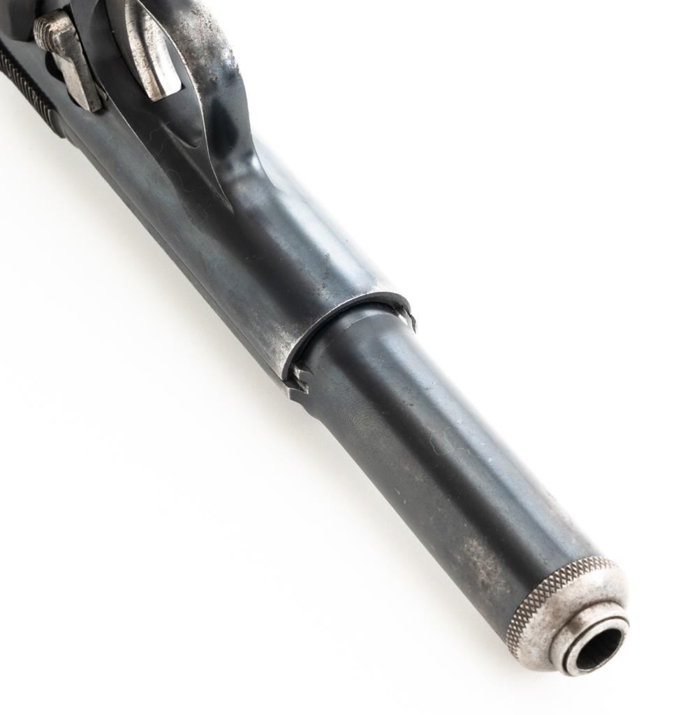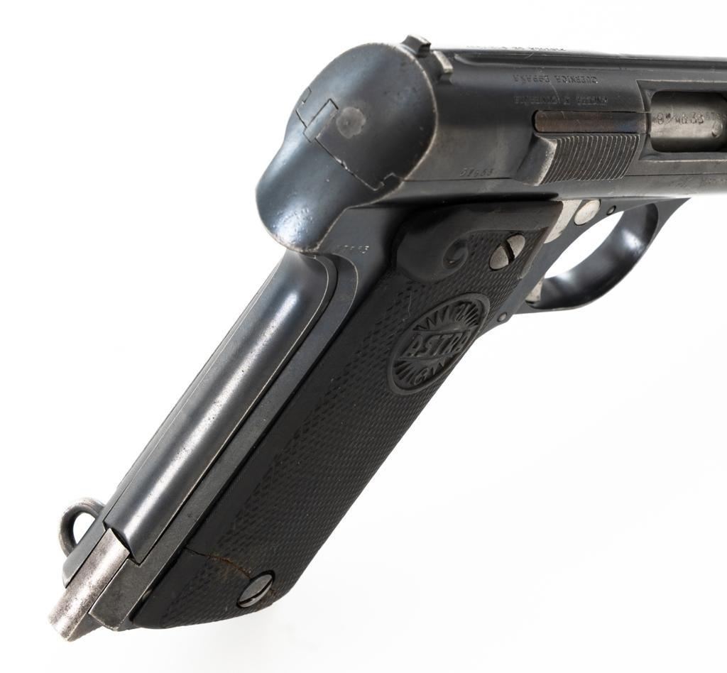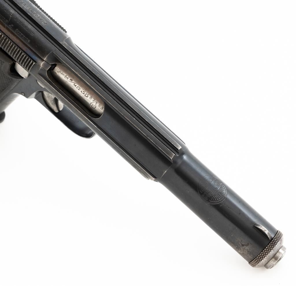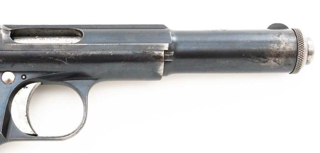 Spanish Astra Model 400 Semi-Automatic Pistol, #57553, 9mm Largo cal., 5.9" barrel, blued finish with bright trigger and safety, checkered hardwood grips, blade front sight, fixed rear sight with "U"-notched groove, and fixed steel lanyard loop. Includes one blued steel "ASTRA" marked magazine. Top is marked with "ASTRA" company logo, "PISTOLA DE 9M/M (38)/MODELO 1921(400)", and "UNCETA Y COMPANIA/GUERNICA ESPANA" on the rear of the slide. Barrel "9 M/M & 38/57553(firing proof)" at the ejection port. There are Spanish proof and inspection stamps on left side of the frame and barrel. Matching numbers on the frame and slide. No visible import marks. Condition overall is very good, retaining approx.75%-80% blue, with wear, toning, and patina to the slide and front grip strap. Right side grip with a crack across the lower screw. Left grip is good, showing age and handling wear. Action operates smoothly. Bore is bright with very good rifling. Est.: $300-$500. (C&R/PPT)