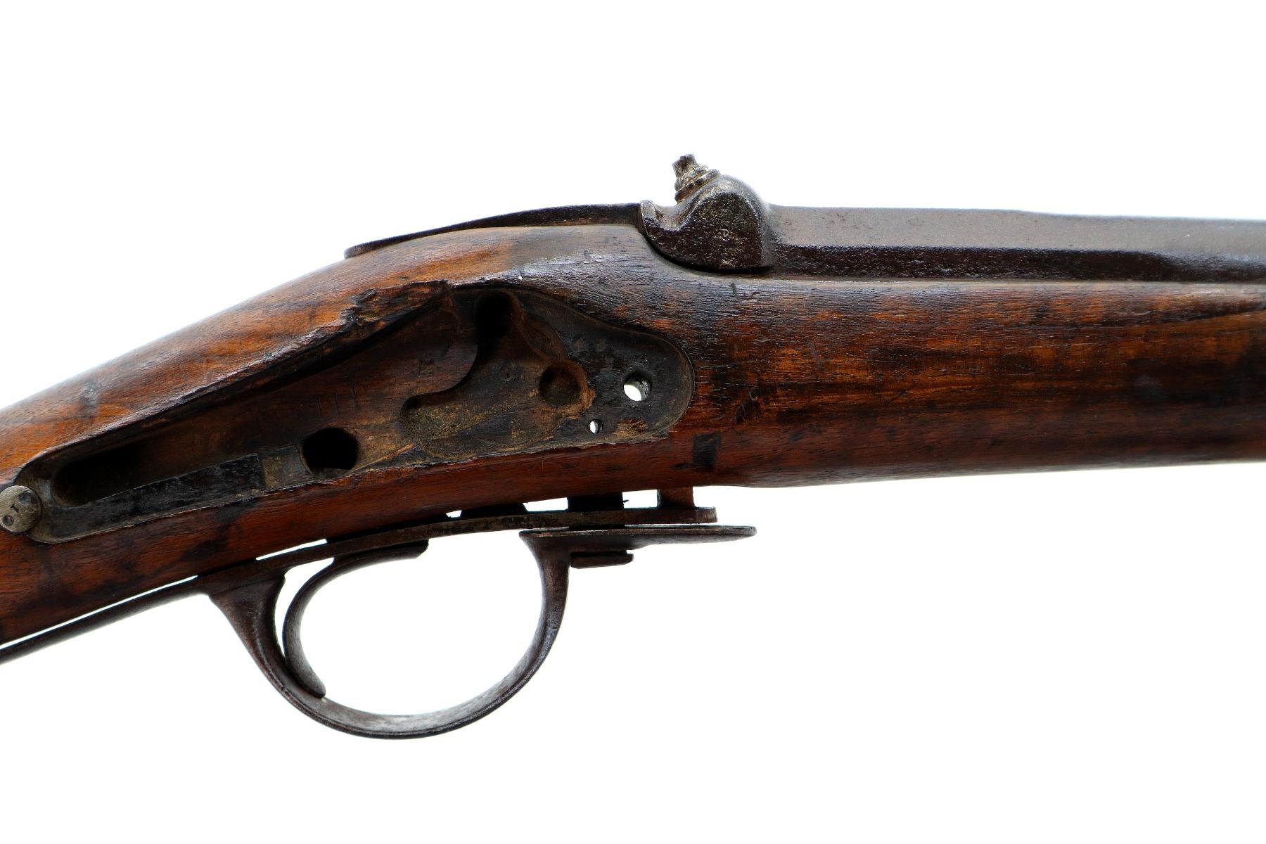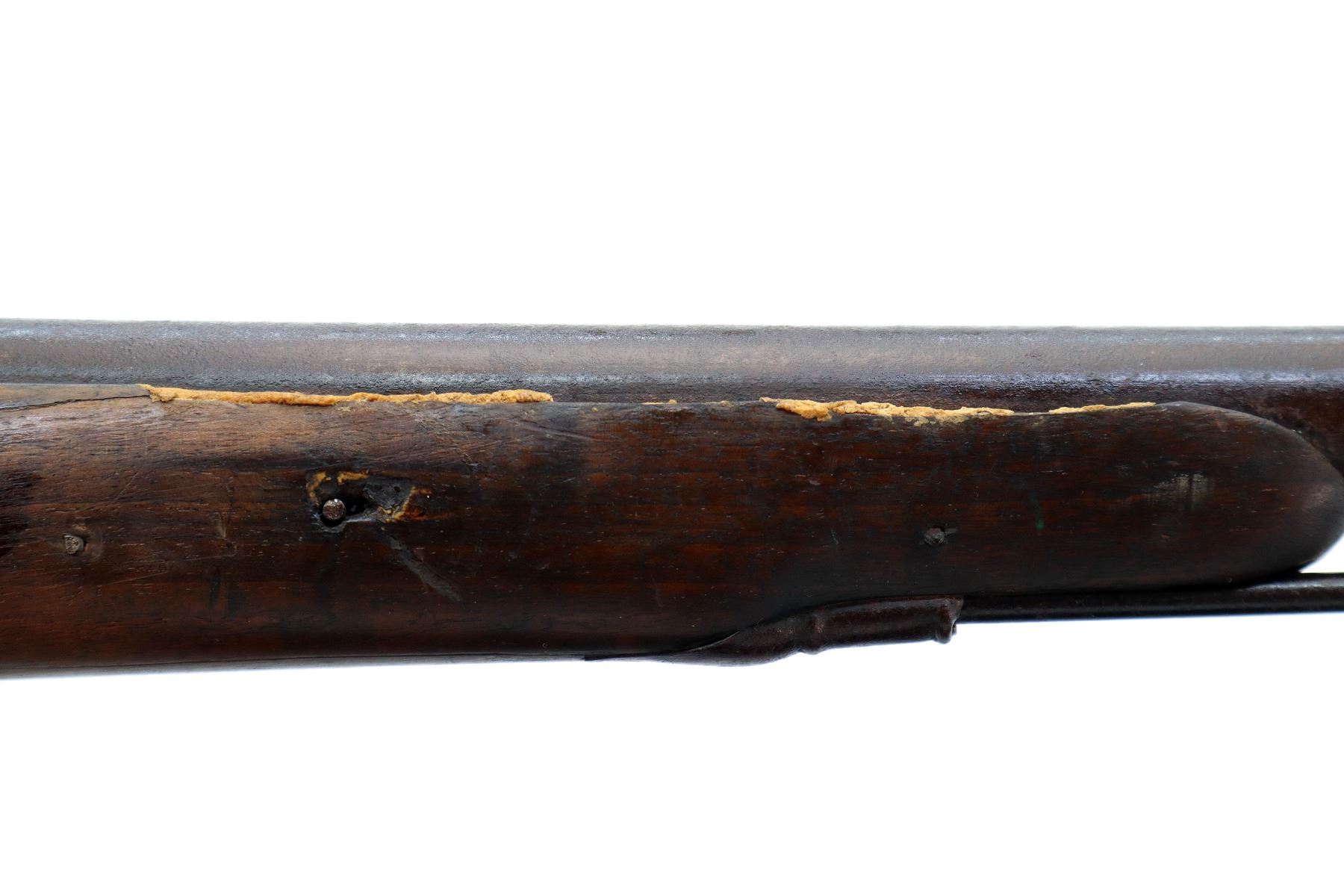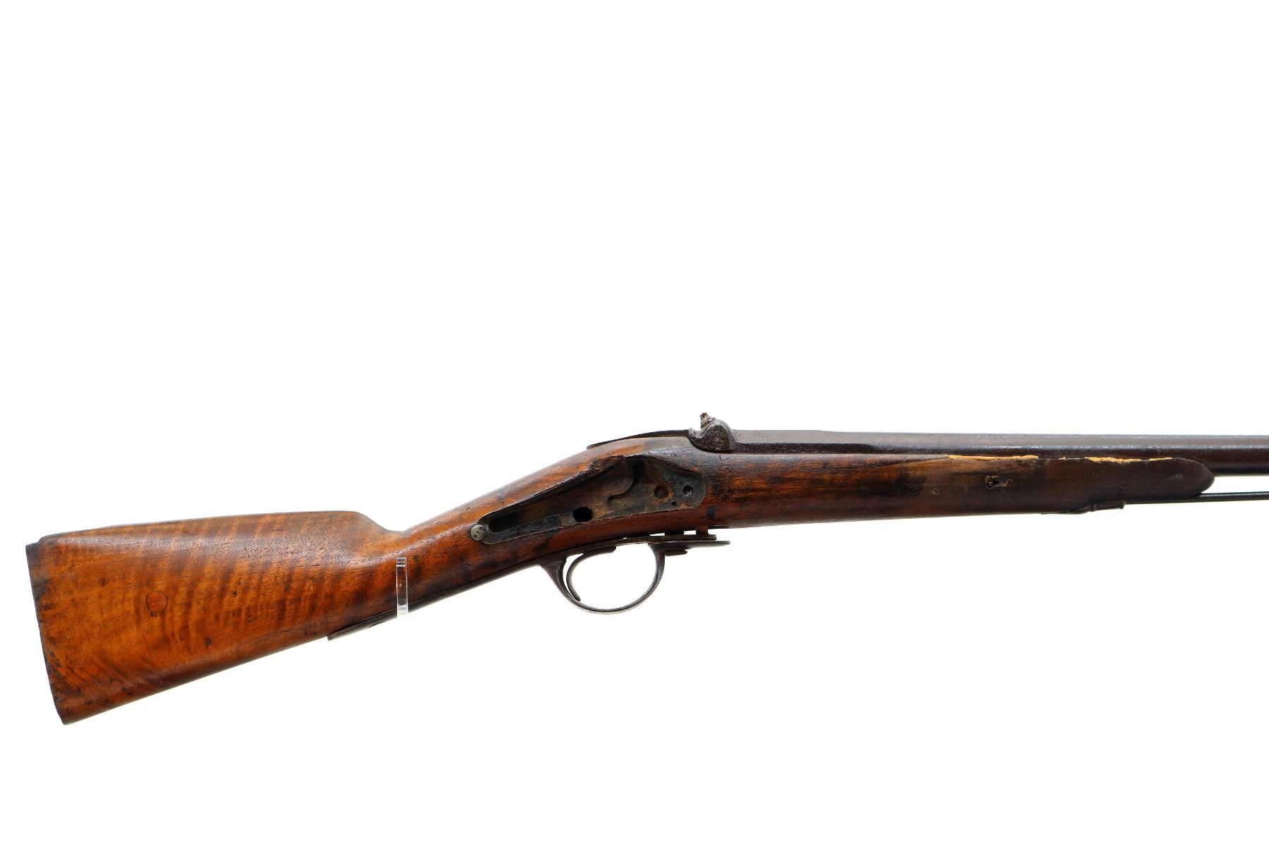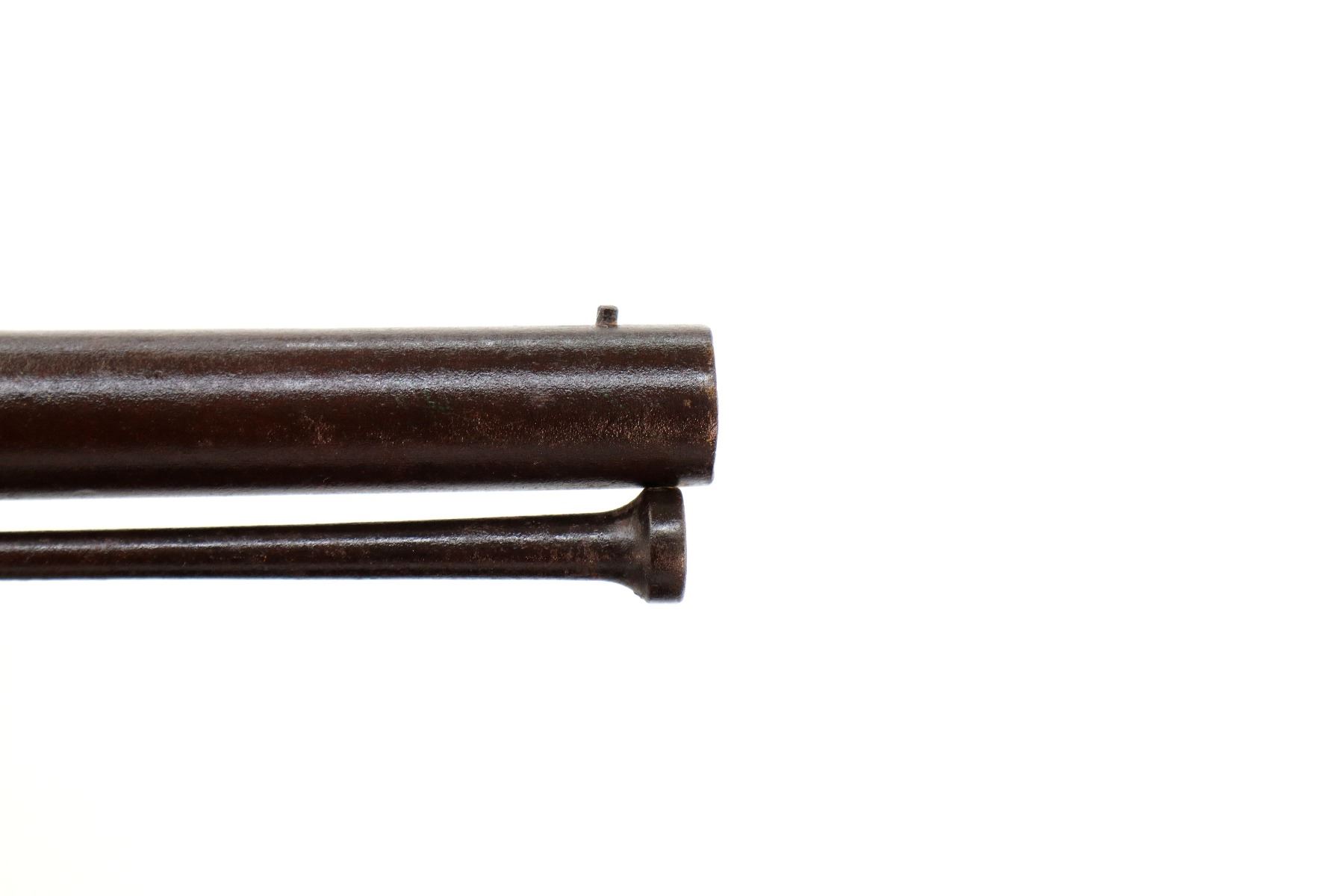 Main Description: Steel bead, tapered round barrel, nipple is damaged, missing tang screw, complete lock plus parts, butt plate and screws, trigger guard screws. Has a steel ramrod, hangers are damaged. One piece wood stock, forearm is chipped and cracked, straight grip chipped and cracked behind barrel and lock