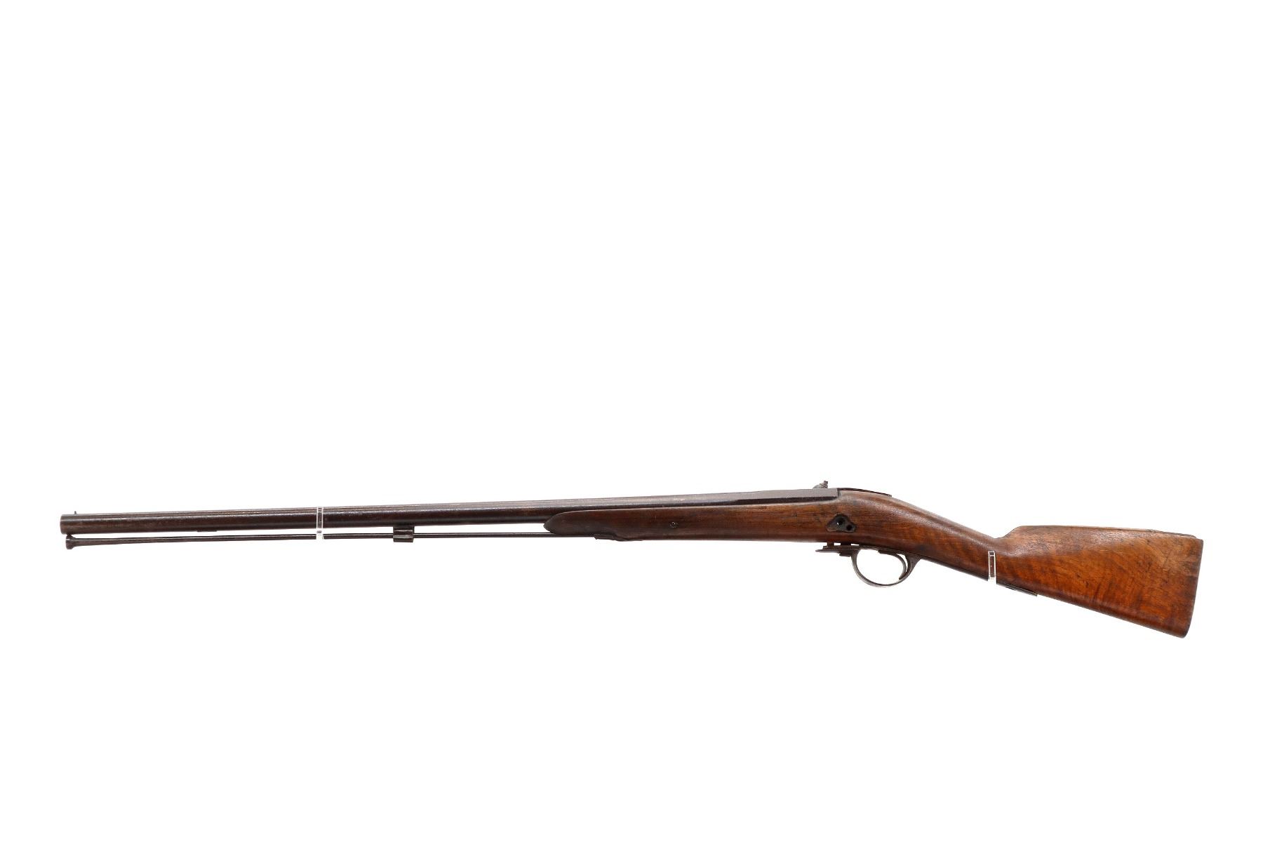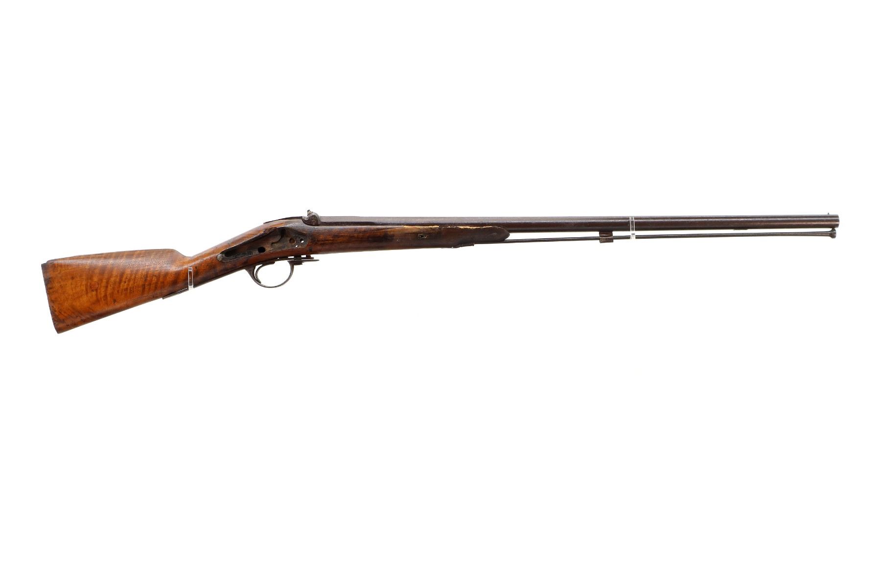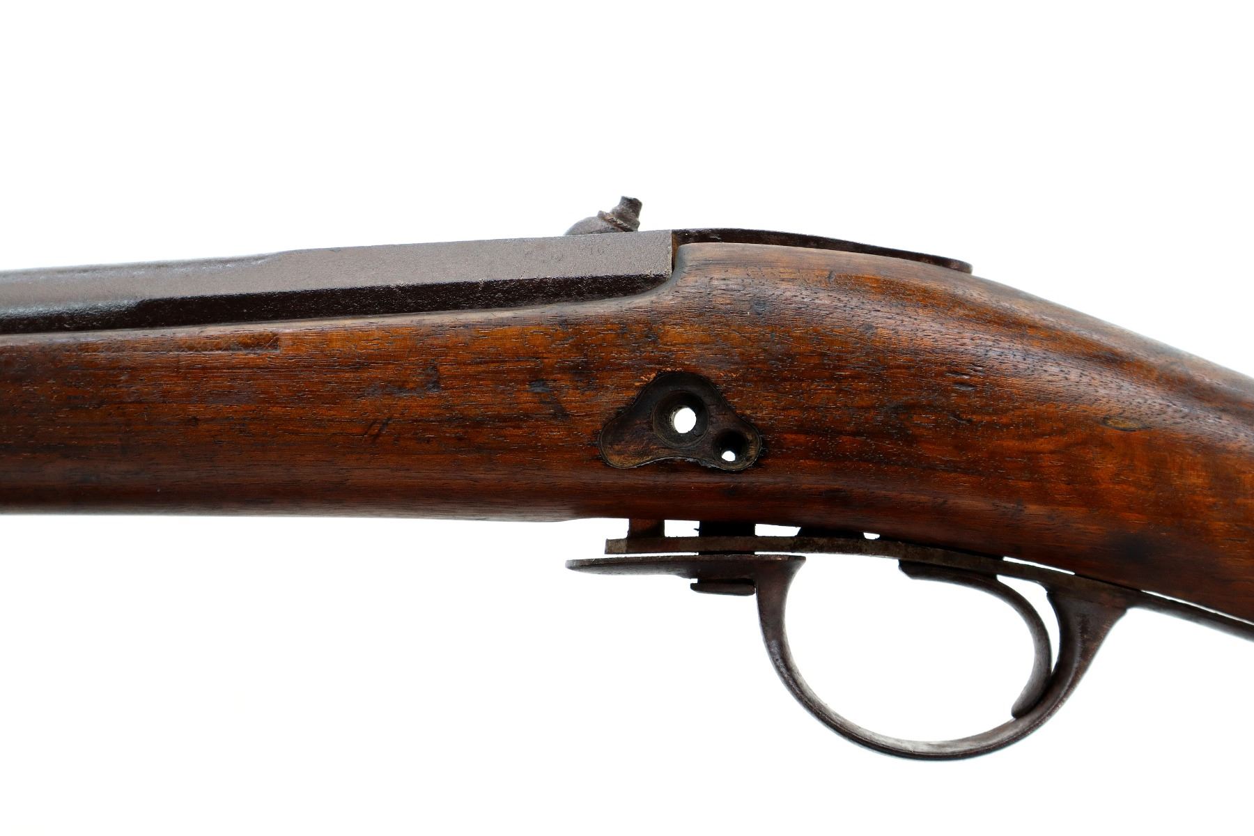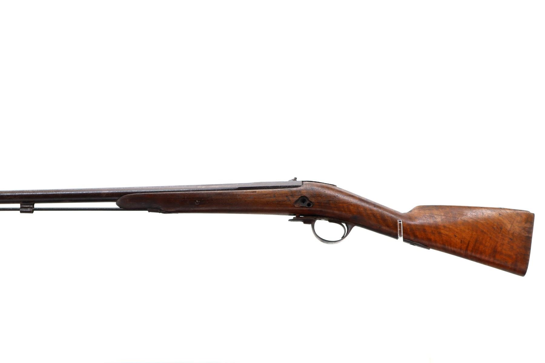 Main Description: Steel bead, tapered round barrel, nipple is damaged, missing tang screw, complete lock plus parts, butt plate and screws, trigger guard screws. Has a steel ramrod, hangers are damaged. One piece wood stock, forearm is chipped and cracked, straight grip chipped and cracked behind barrel and lock