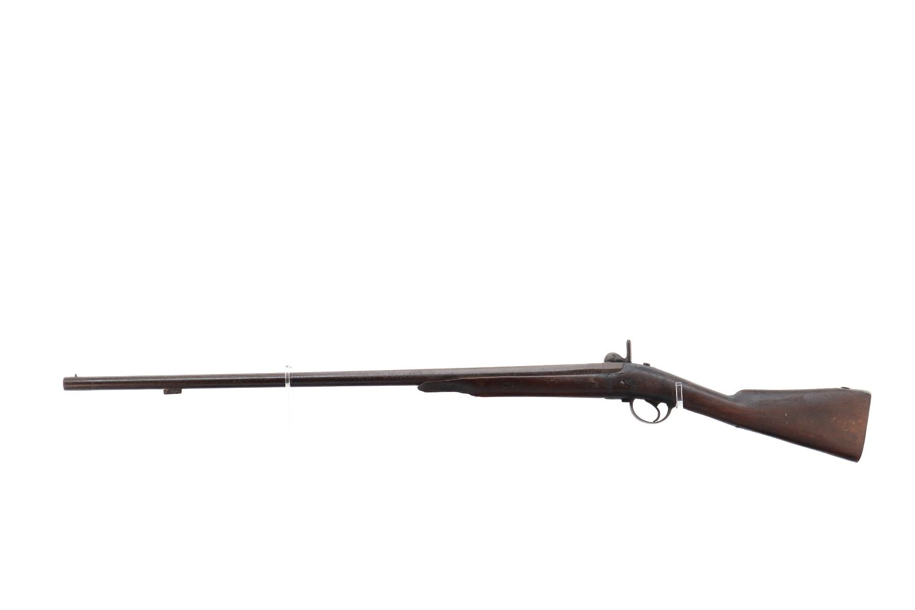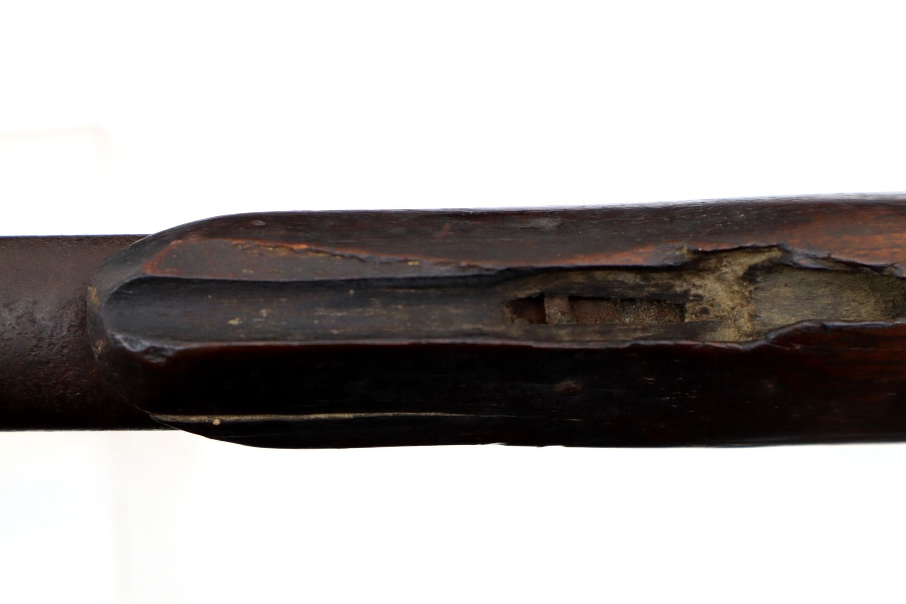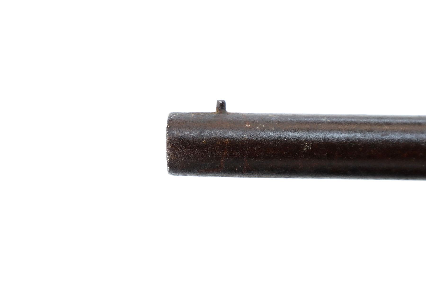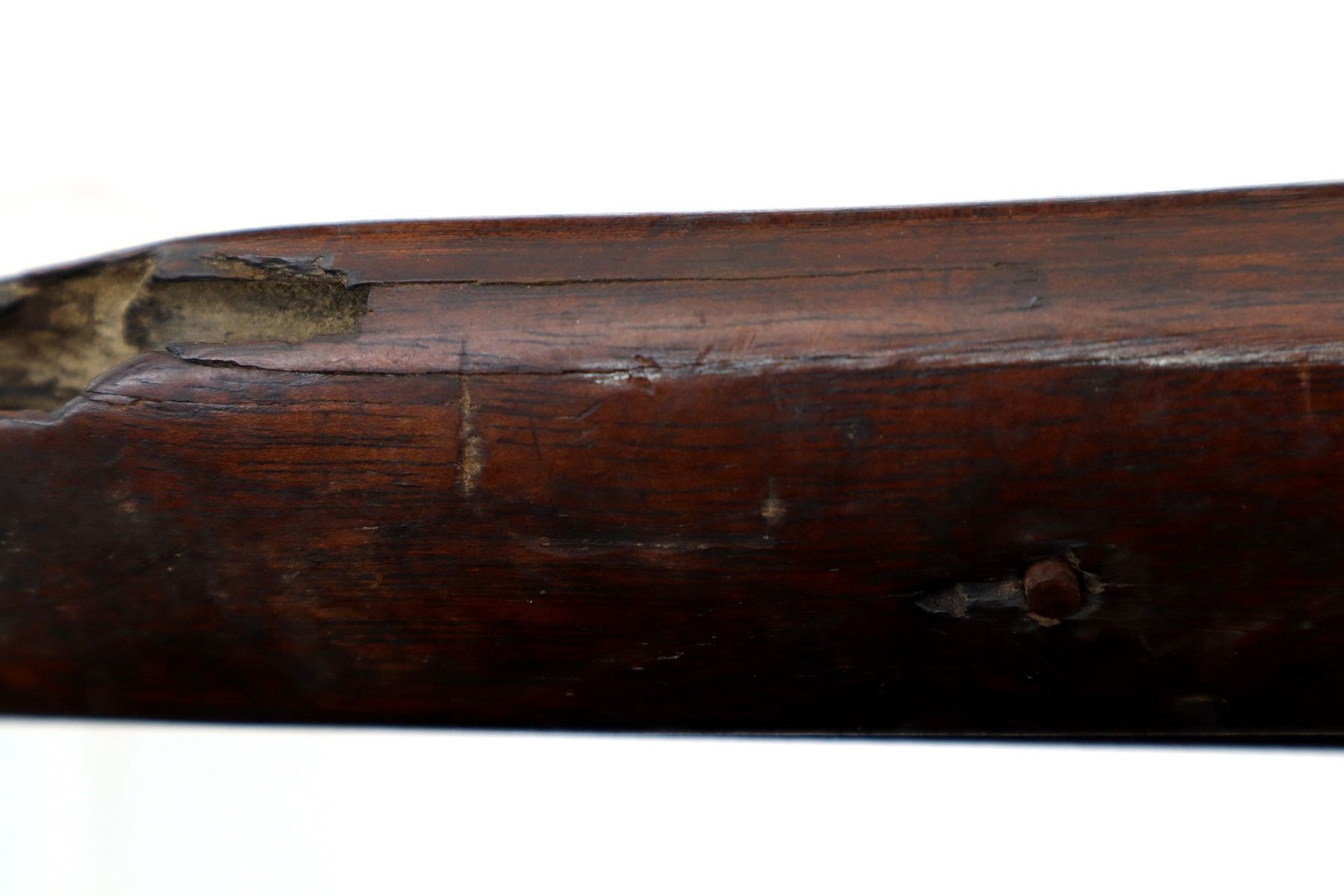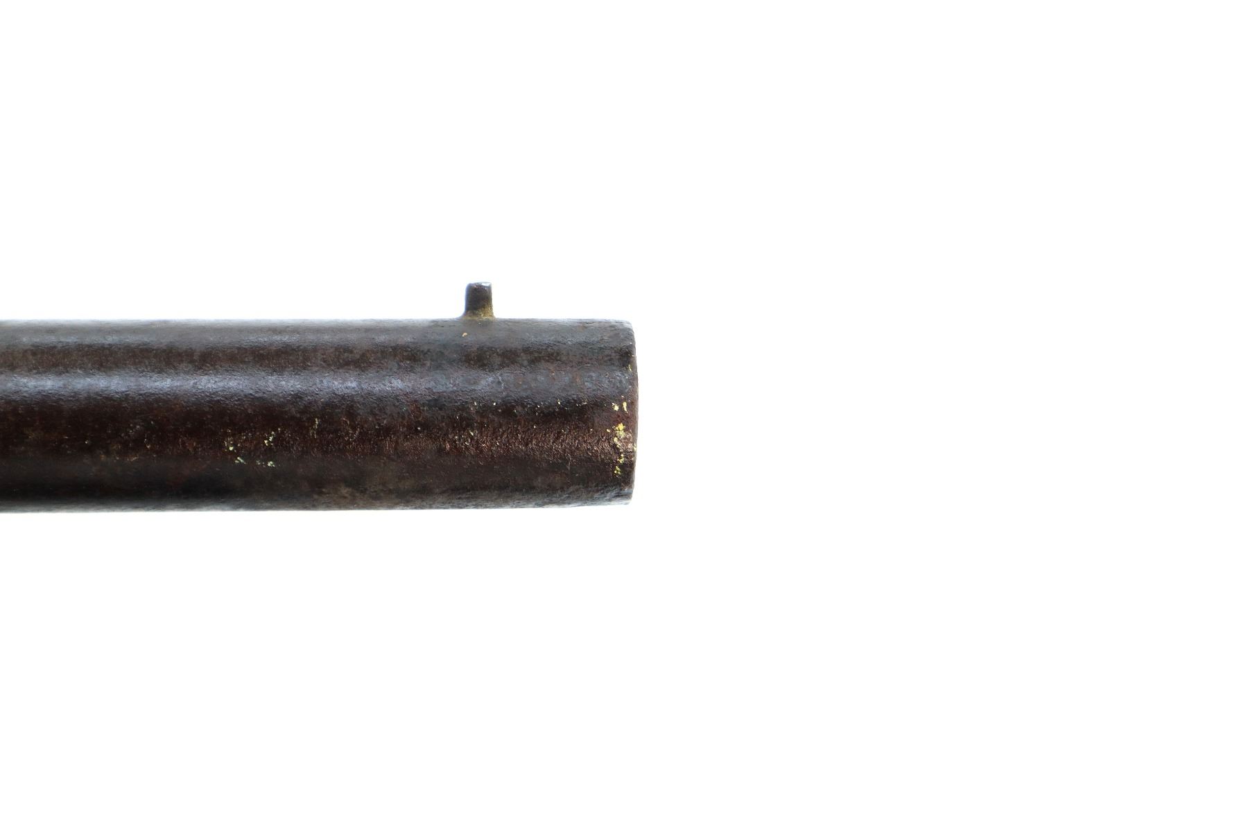 Main Description: Steel bead, tapered round barrel, smooth back action lock with checkered spur hammer that functions, nipple is damaged. One piece half length wood stock, forearm is chipped and cracked, straight grip, chipped and cracked behind barrel and lock, smooth steel butt plate, missing ramrod.