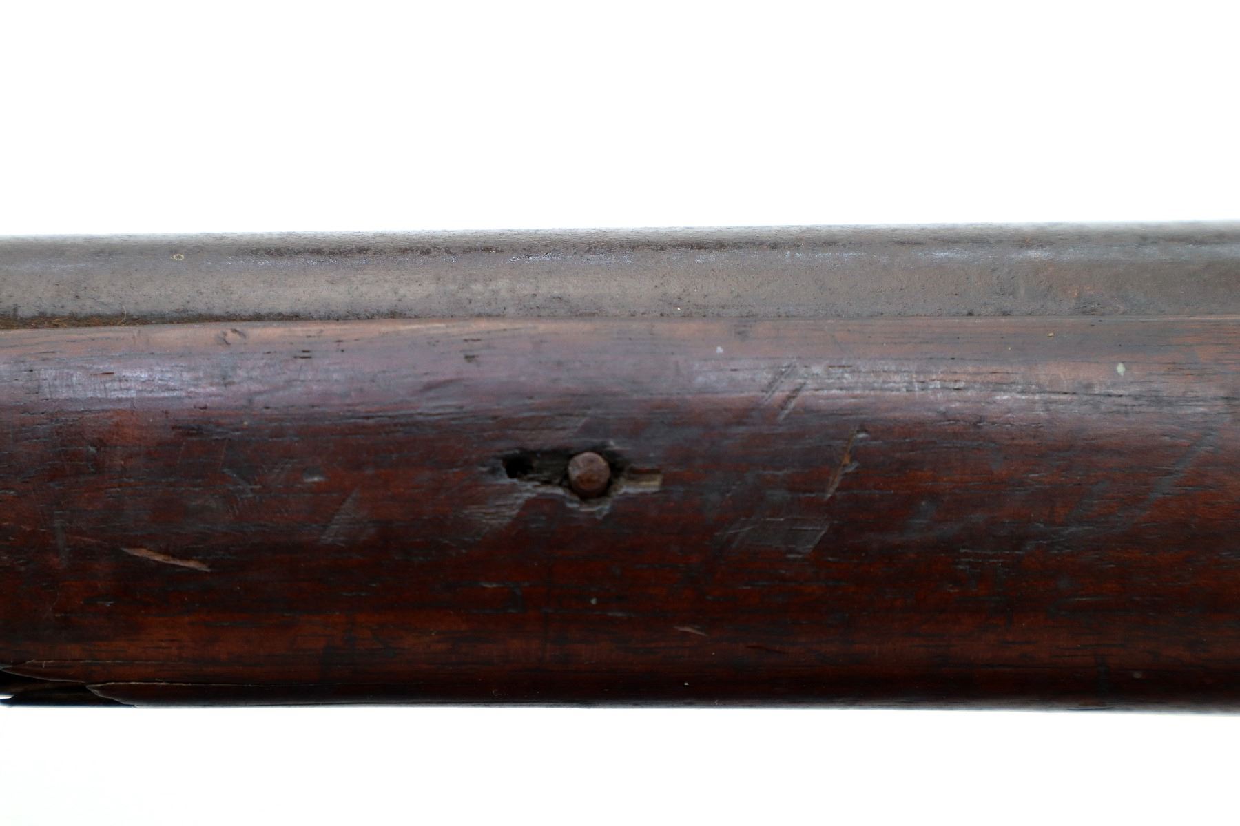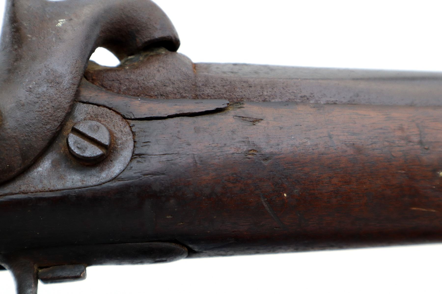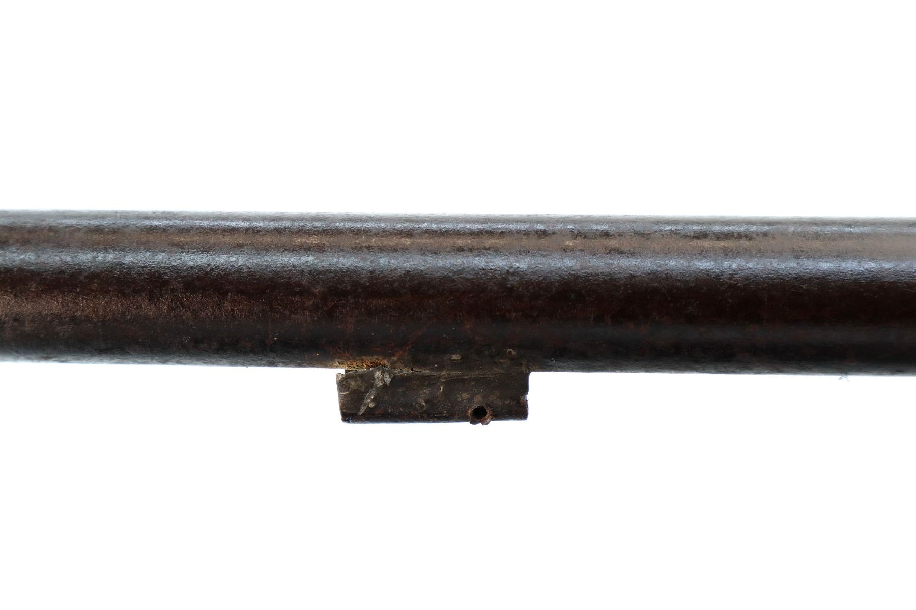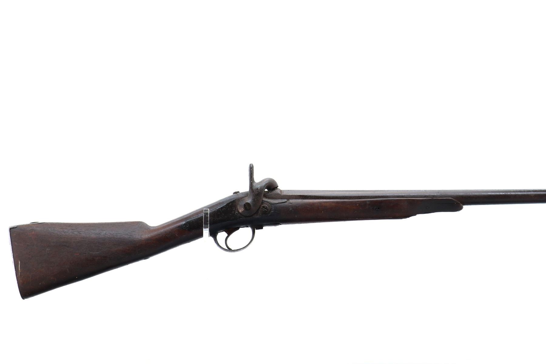 Main Description: Steel bead, tapered round barrel, smooth back action lock with checkered spur hammer that functions, nipple is damaged. One piece half length wood stock, forearm is chipped and cracked, straight grip, chipped and cracked behind barrel and lock, smooth steel butt plate, missing ramrod.