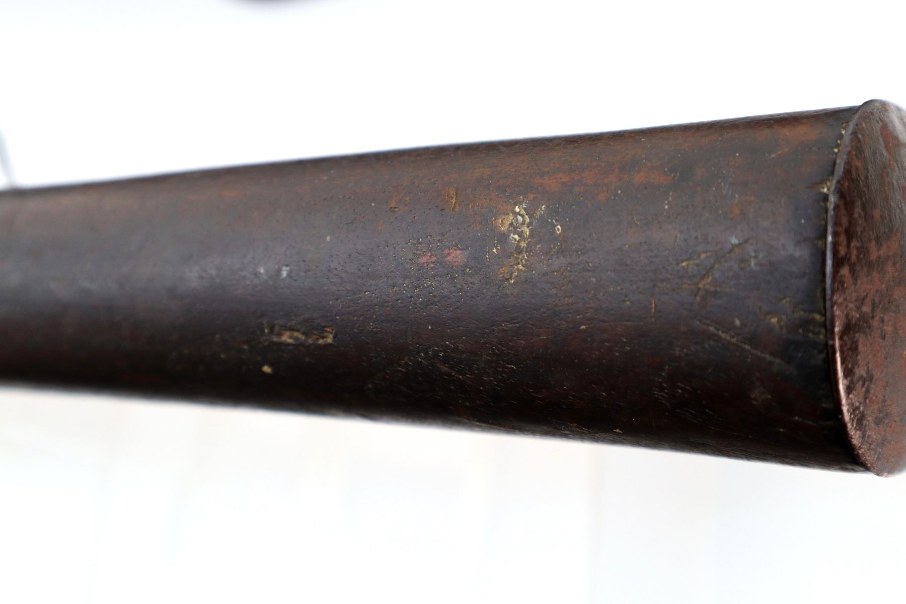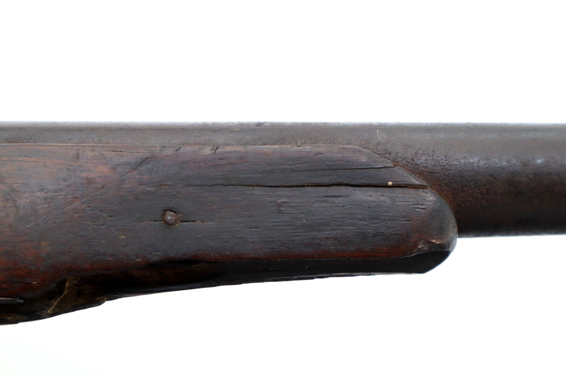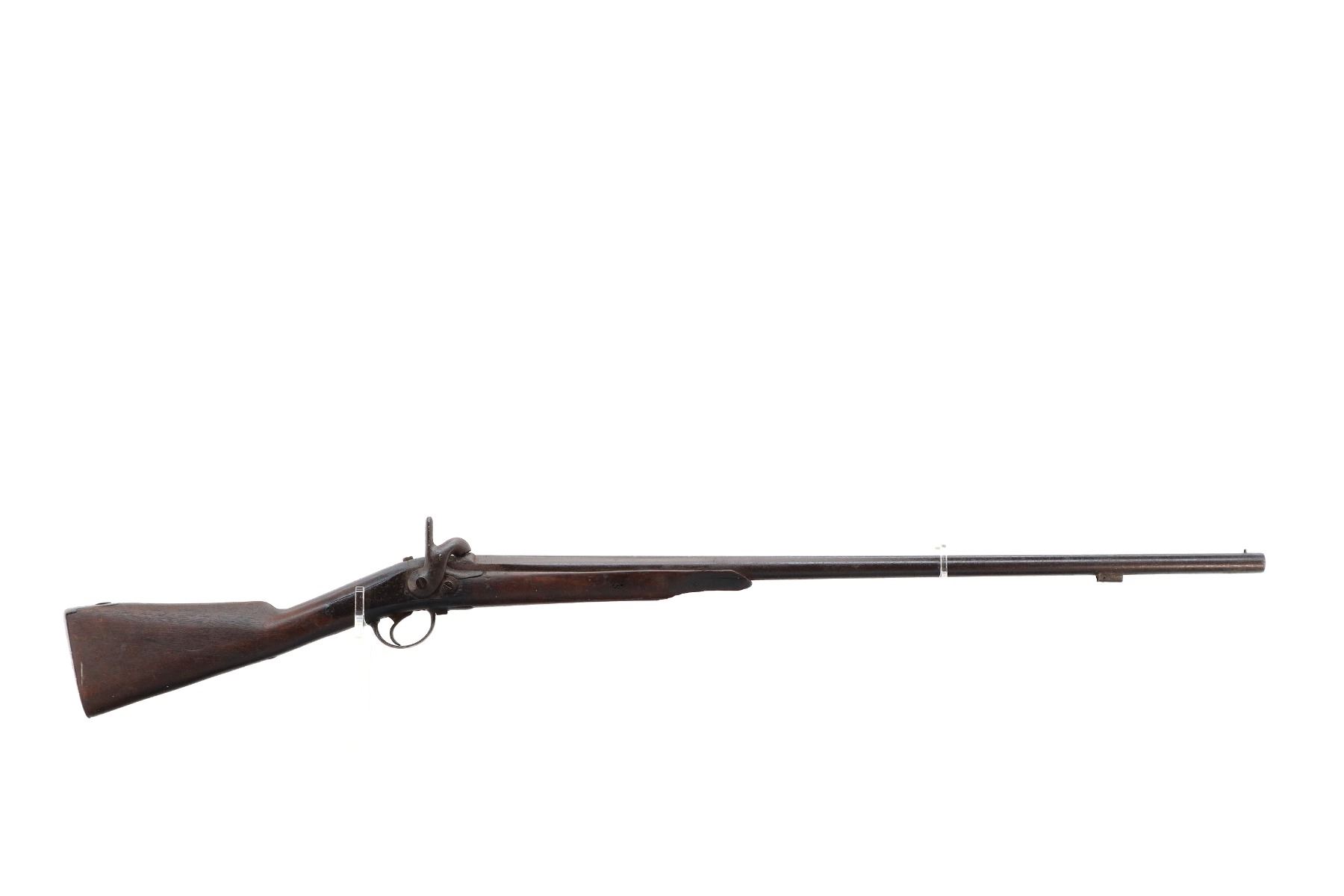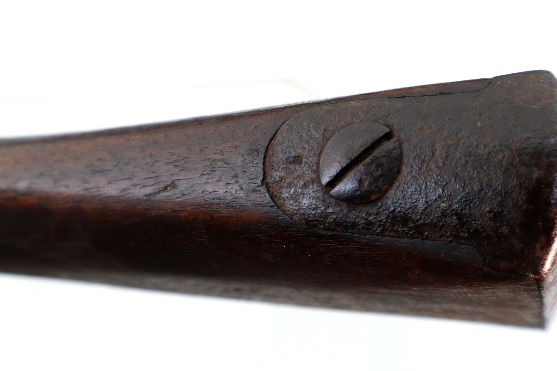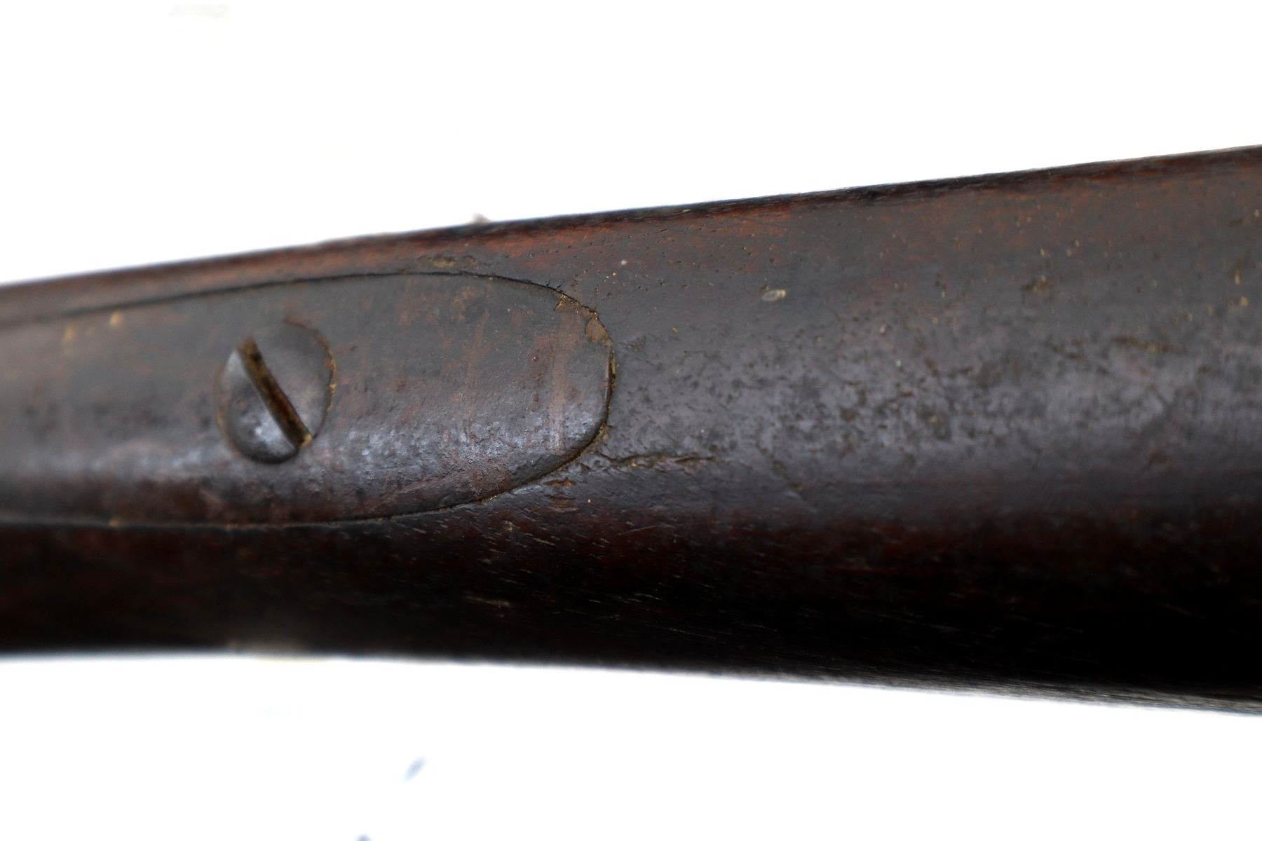 Main Description: Steel bead, tapered round barrel, smooth back action lock with checkered spur hammer that functions, nipple is damaged. One piece half length wood stock, forearm is chipped and cracked, straight grip, chipped and cracked behind barrel and lock, smooth steel butt plate, missing ramrod.