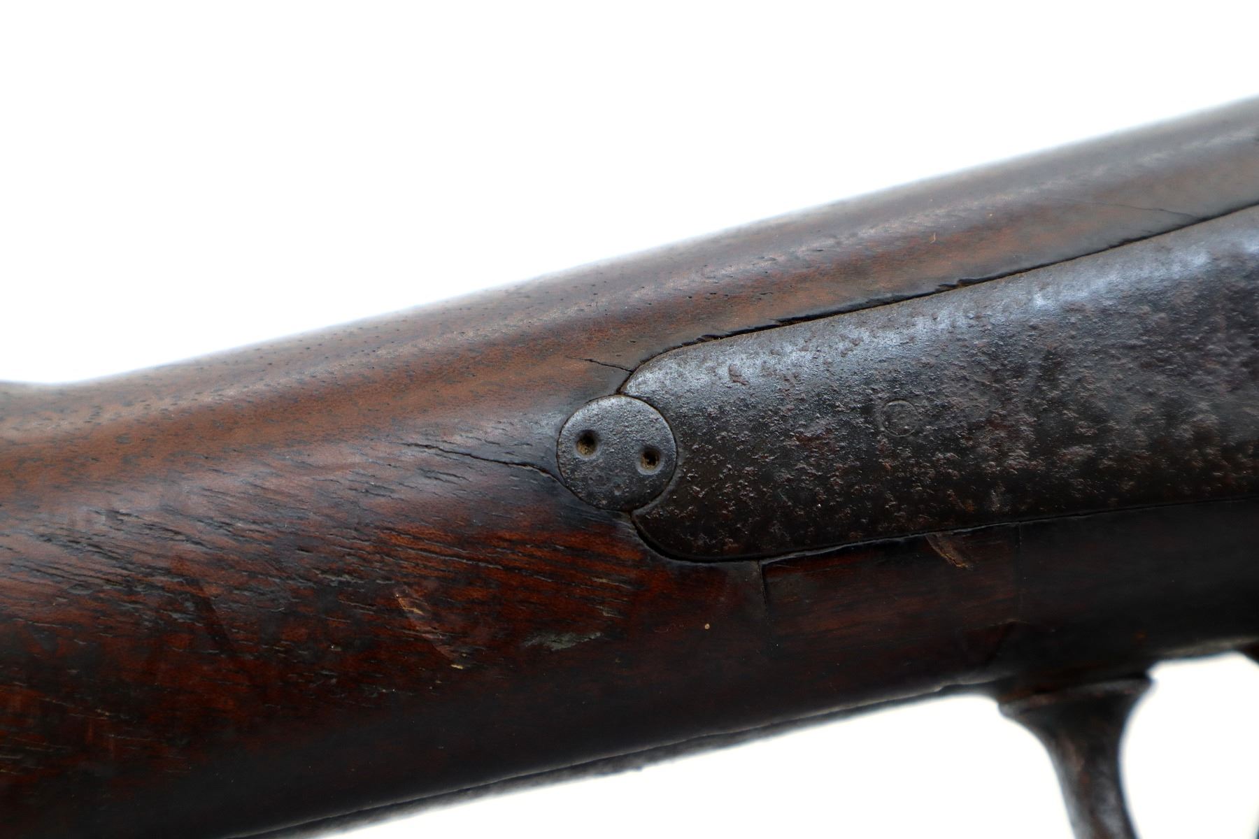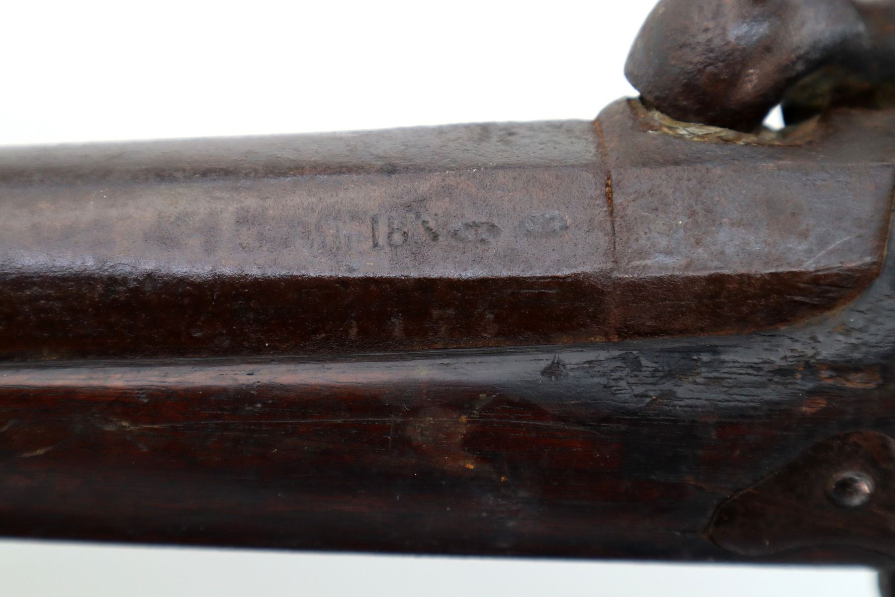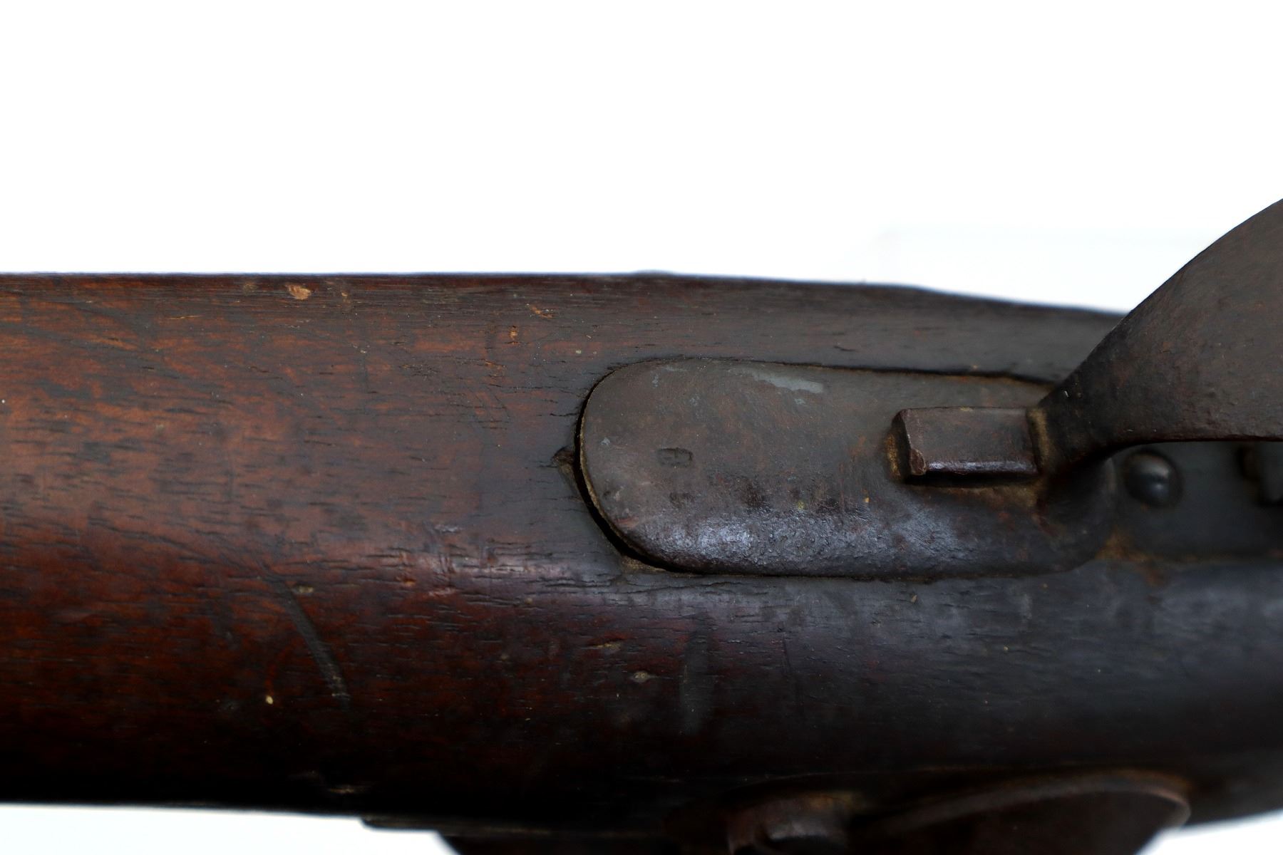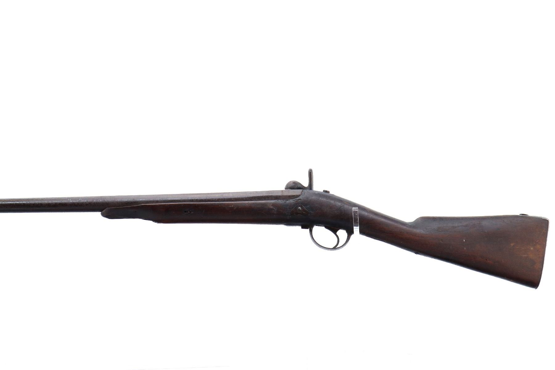 Main Description: Steel bead, tapered round barrel, smooth back action lock with checkered spur hammer that functions, nipple is damaged. One piece half length wood stock, forearm is chipped and cracked, straight grip, chipped and cracked behind barrel and lock, smooth steel butt plate, missing ramrod.