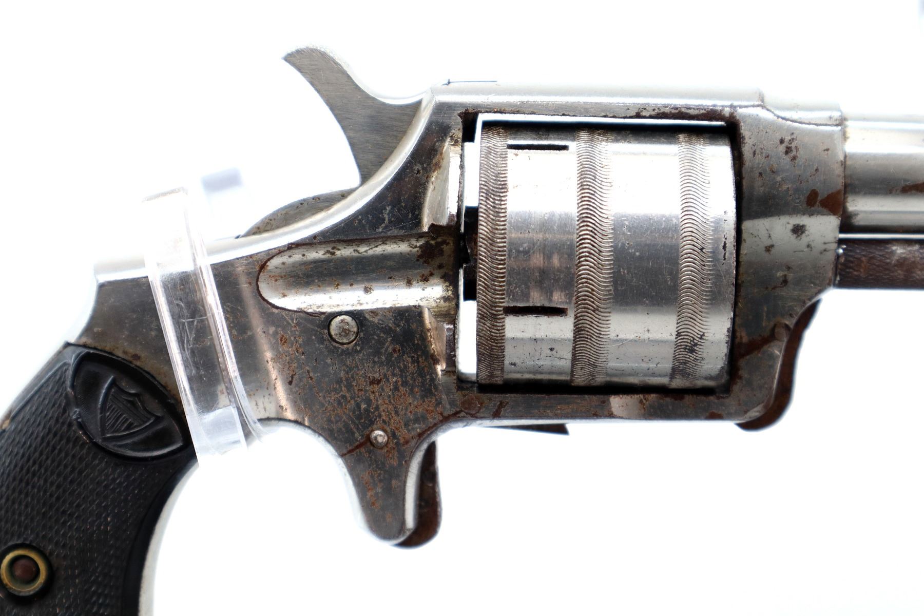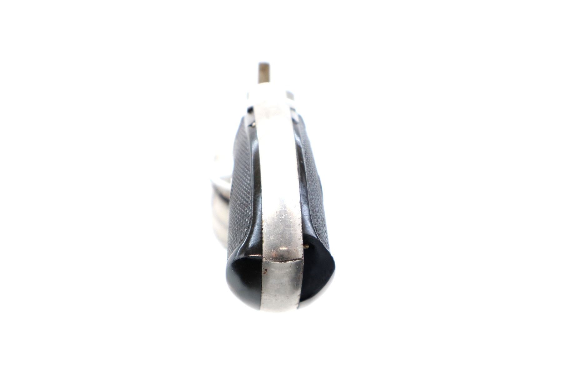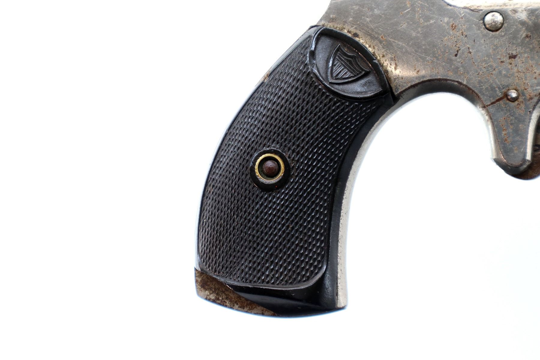 Main Description: Functions mechanically as designed, Does not index. Blade front sight, Nickel finish, tapered round barrel, engraved cylinder, checkered spur hammer and trigger. Two piece checkered black polymer grips with logo, both are chipped.