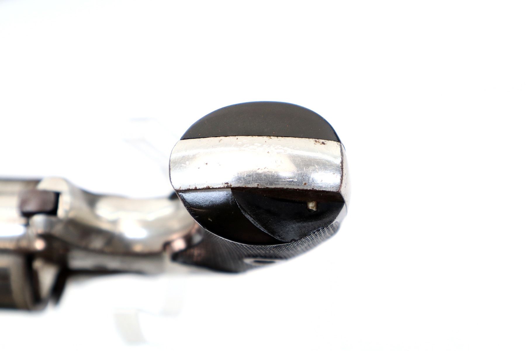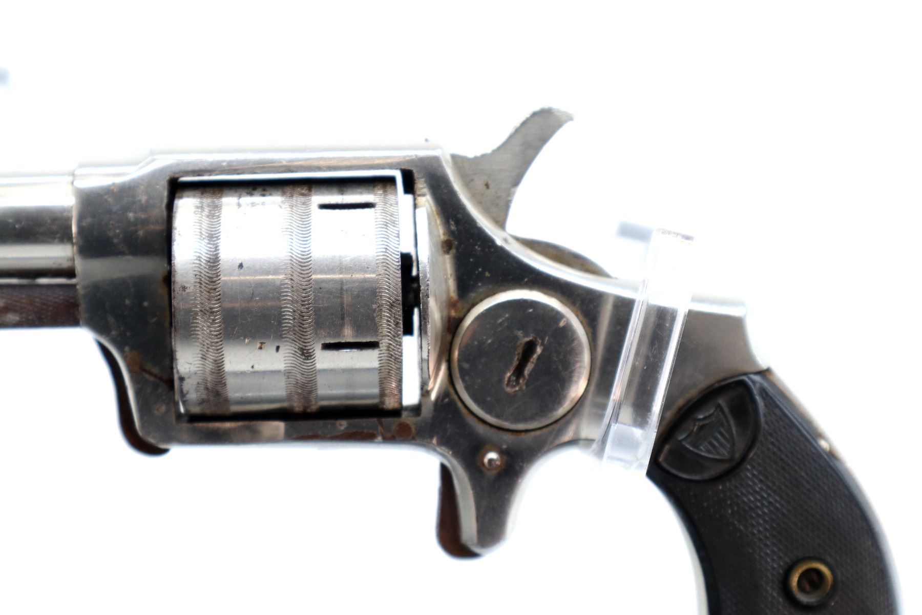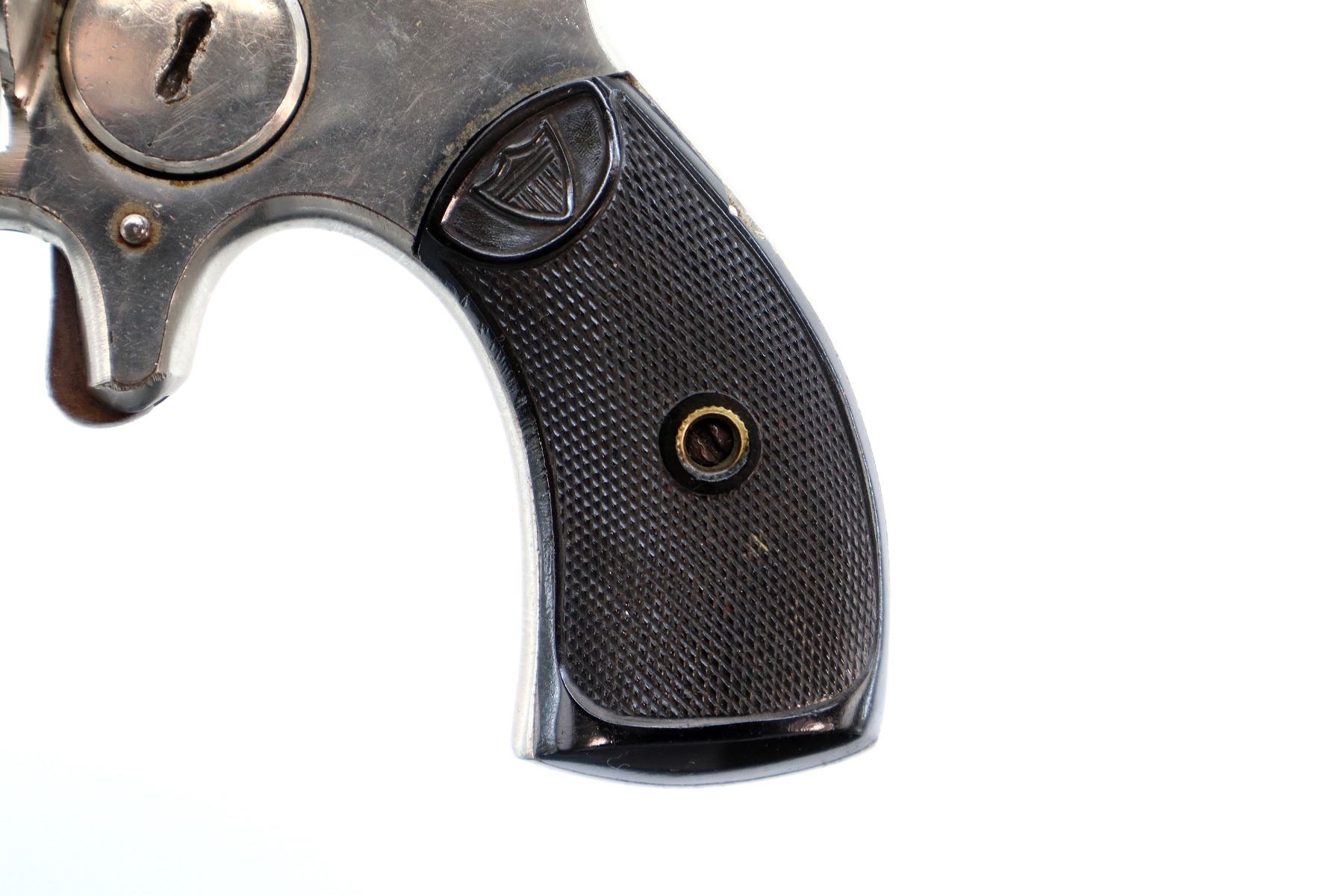 Main Description: Functions mechanically as designed, Does not index. Blade front sight, Nickel finish, tapered round barrel, engraved cylinder, checkered spur hammer and trigger. Two piece checkered black polymer grips with logo, both are chipped.