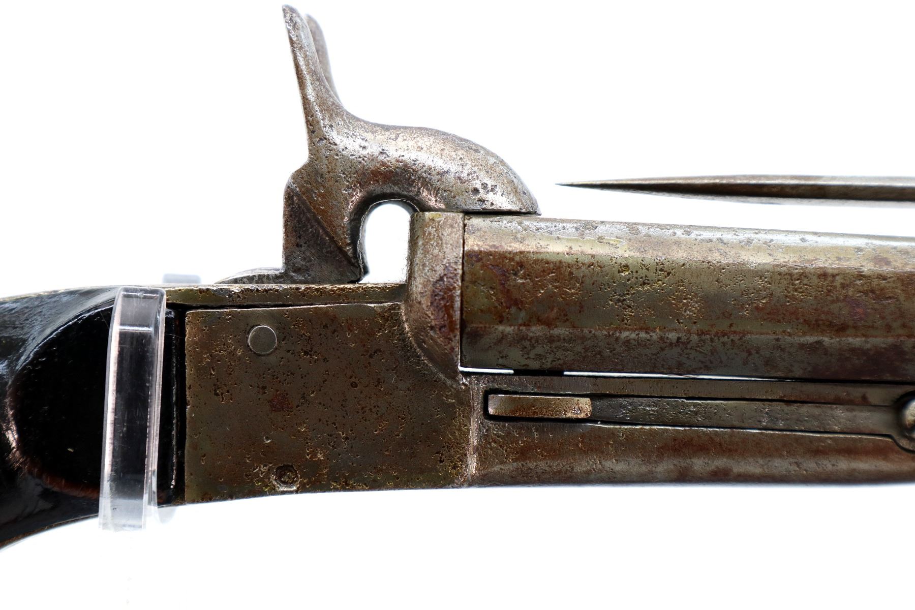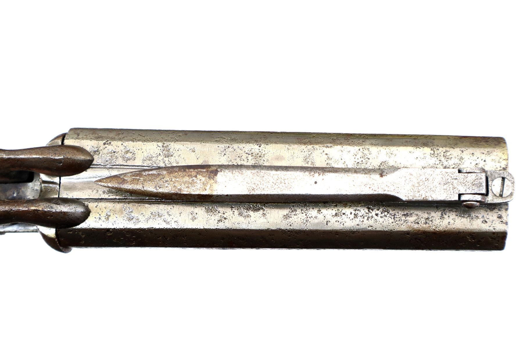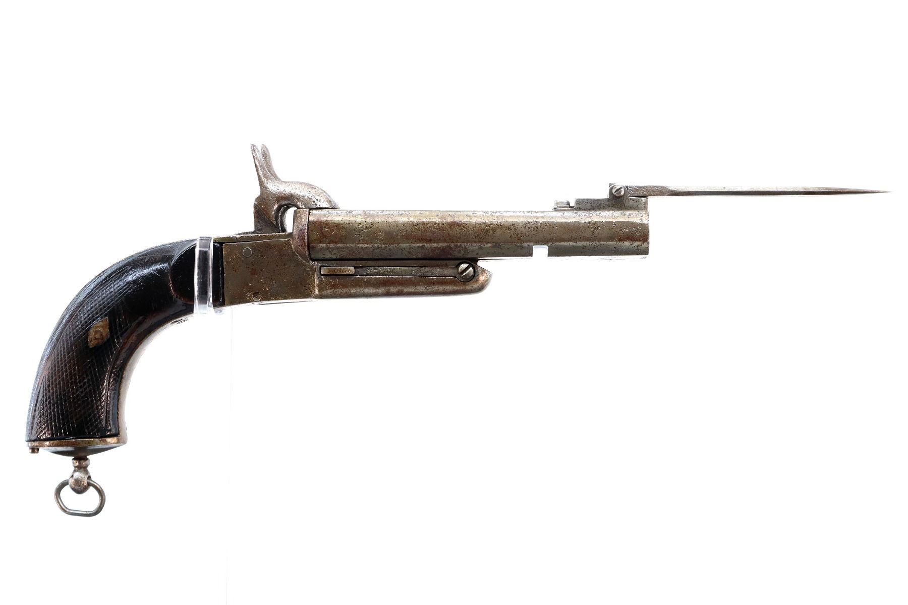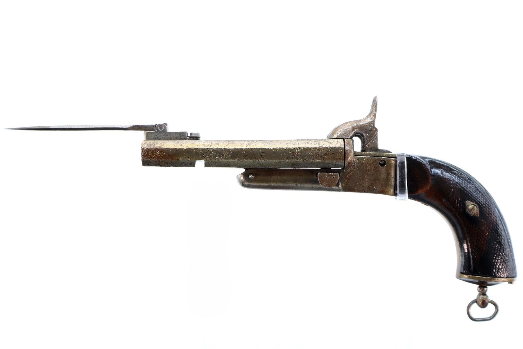 Main Description: No sights, octagon barrels with attached folding bayonet which is loose, smooth spur hammers and folding triggers, hammer pin is a replacement. Two piece checkered wood grips, lanyard ring, barrels are loose on the frame.