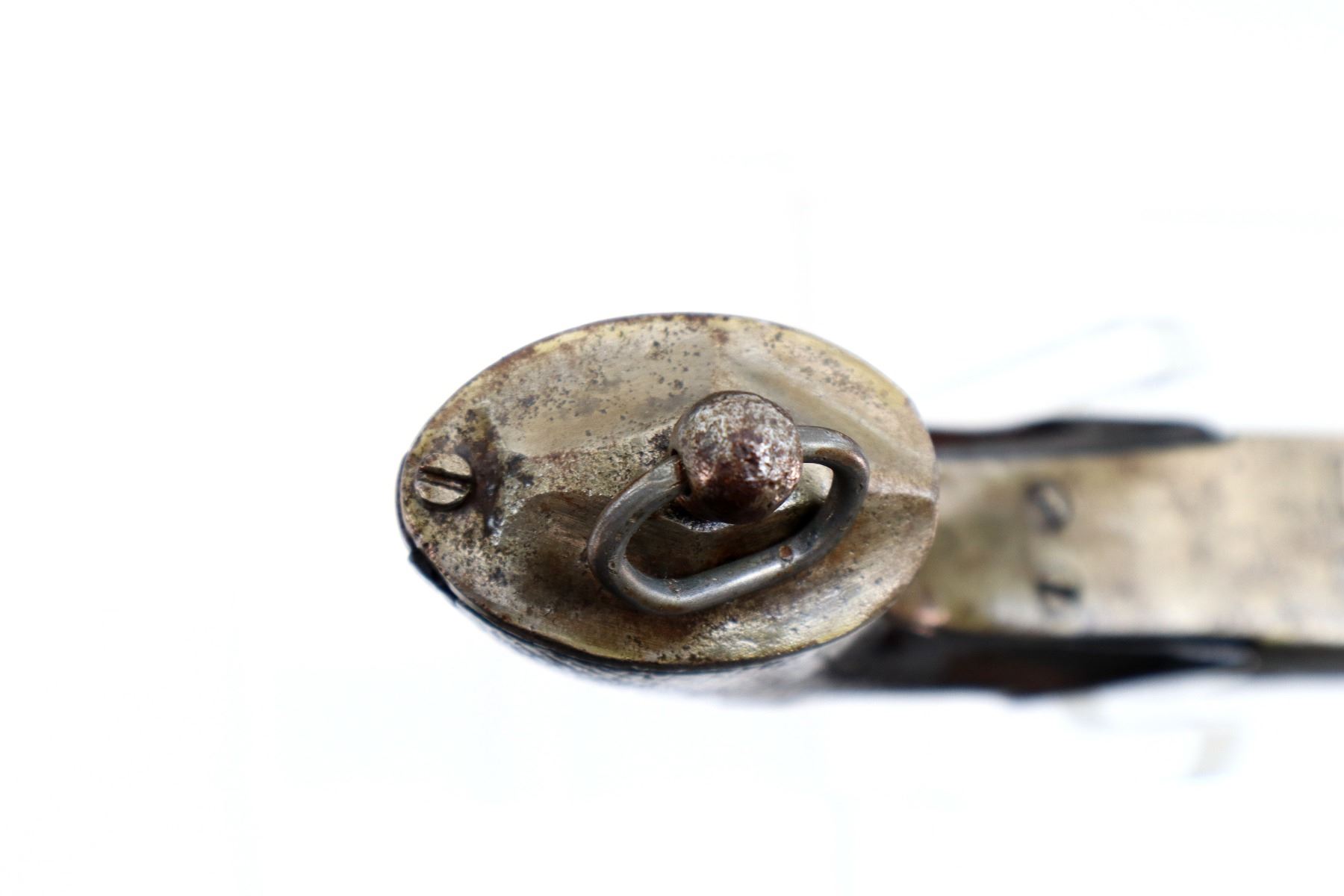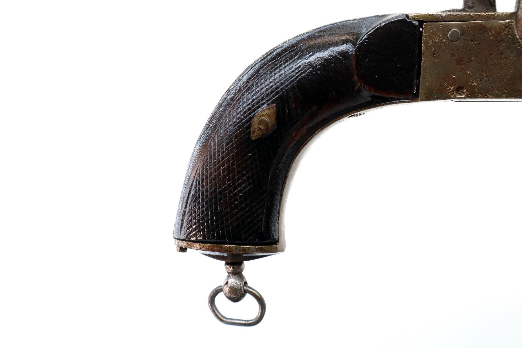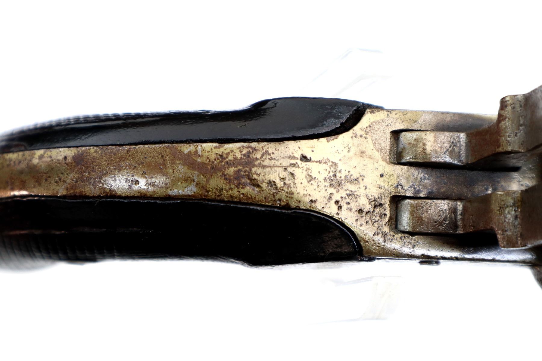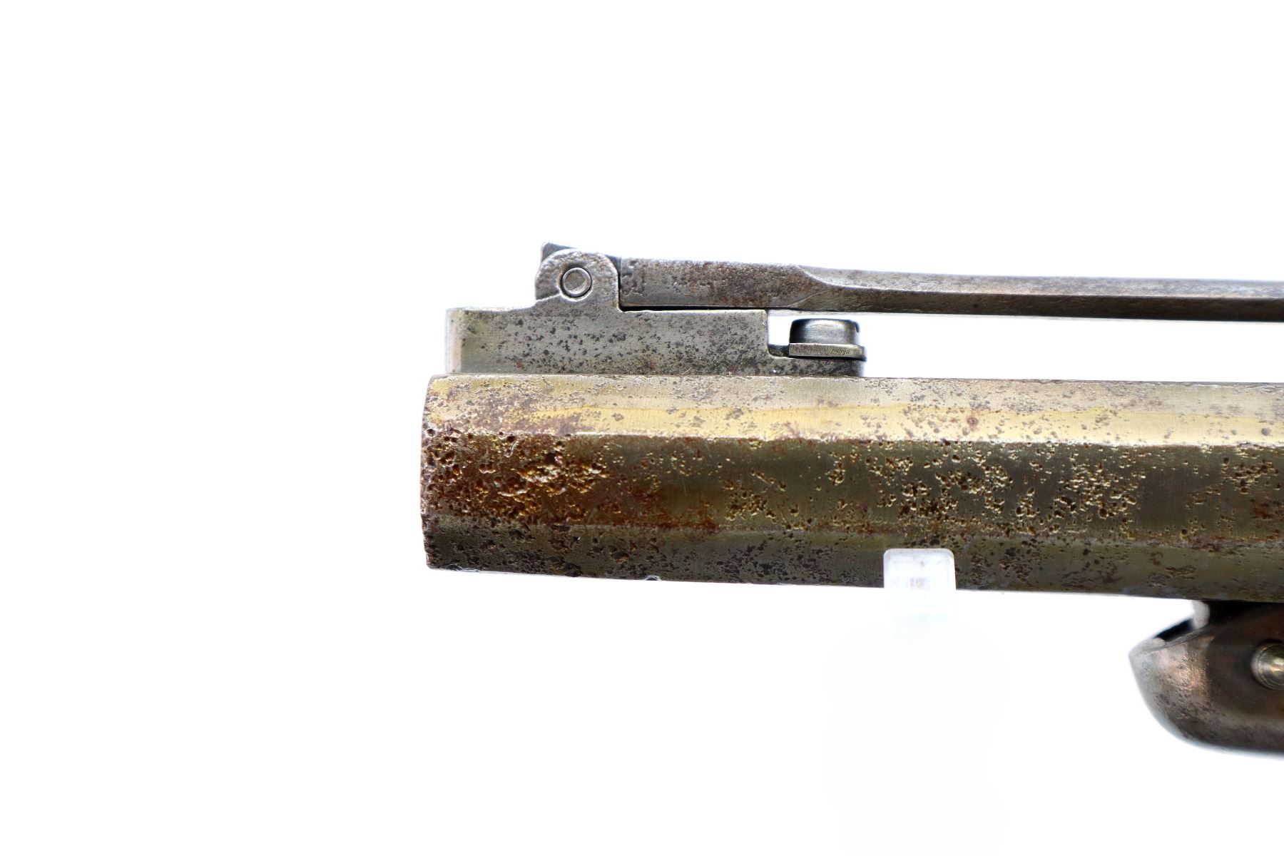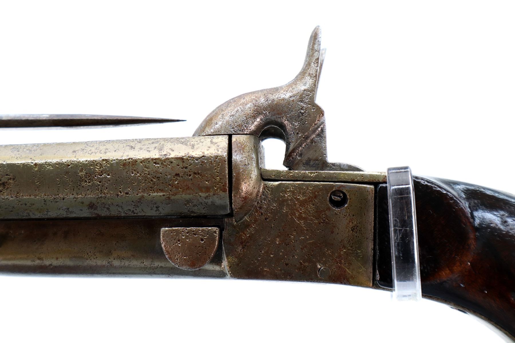 Main Description: No sights, octagon barrels with attached folding bayonet which is loose, smooth spur hammers and folding triggers, hammer pin is a replacement. Two piece checkered wood grips, lanyard ring, barrels are loose on the frame.
