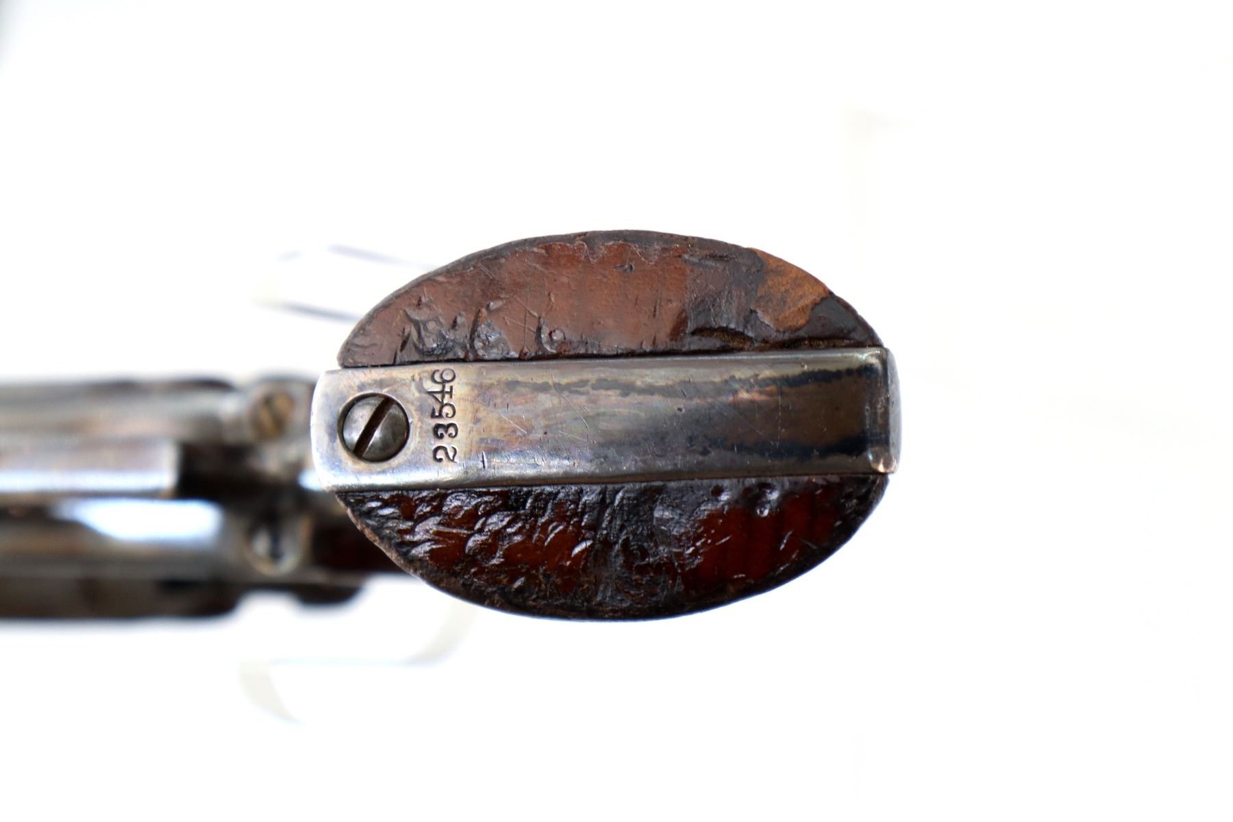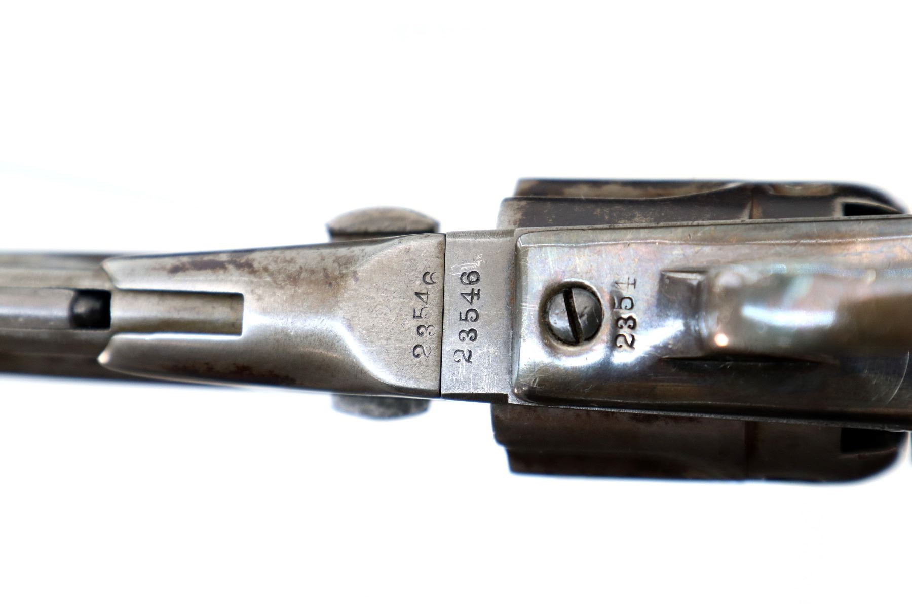 Wear: Metal finish turning silver grey with light pitting, rust speckles, scratches, handling marks and wear. Grips show some marks, scratches and wear.