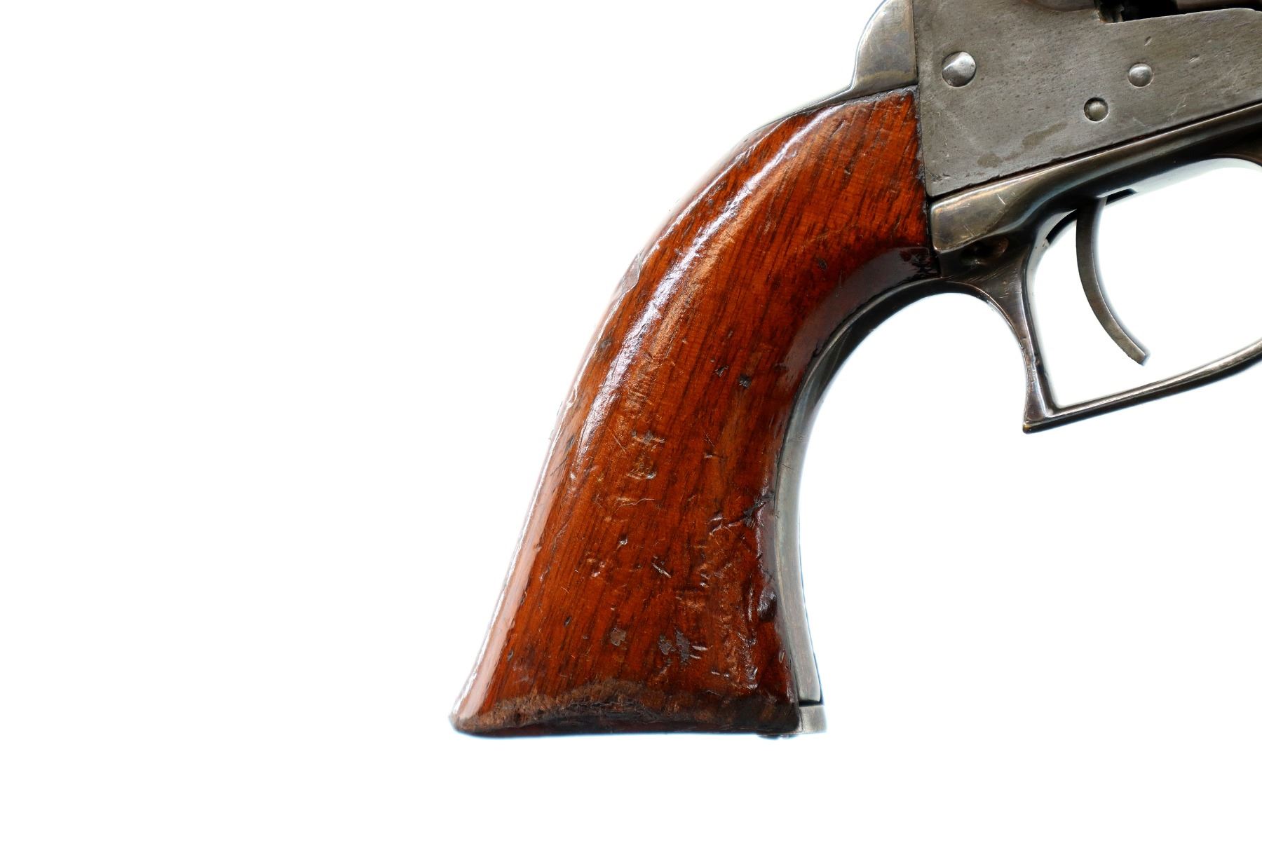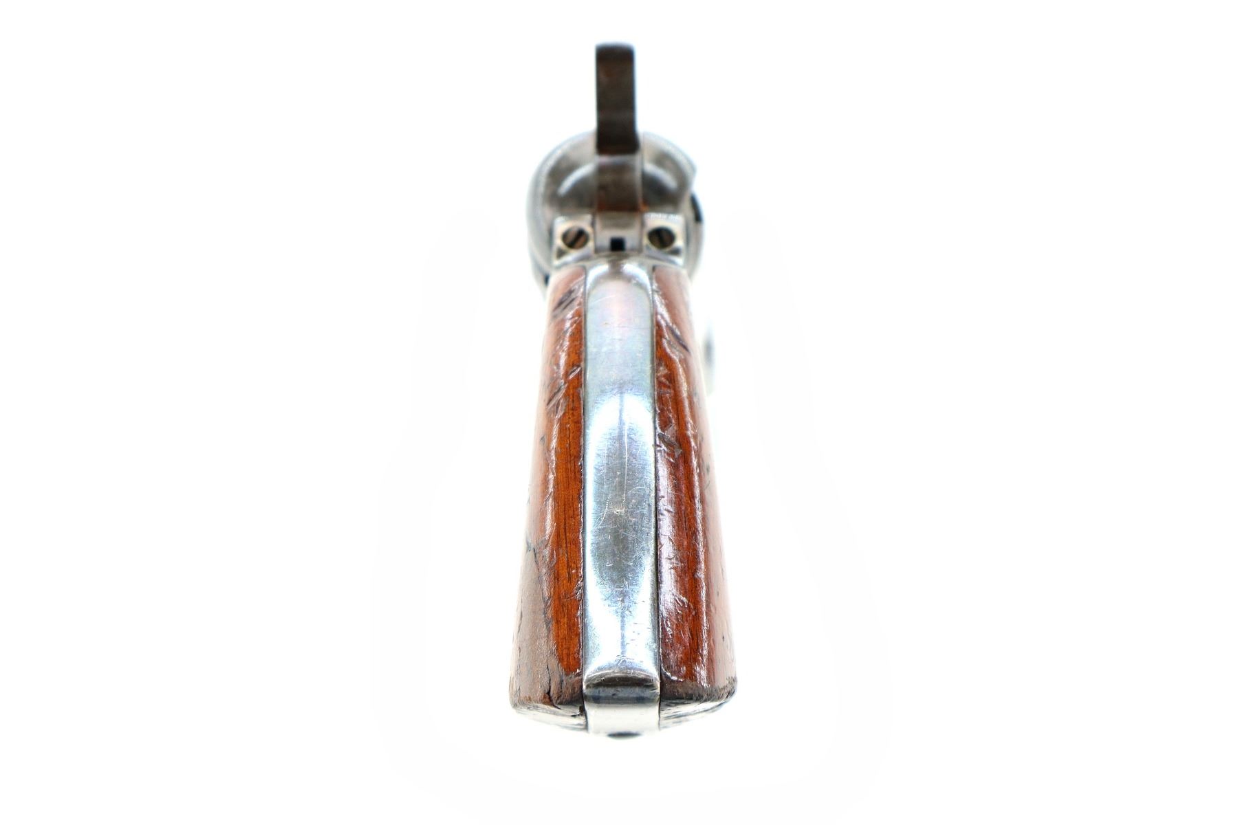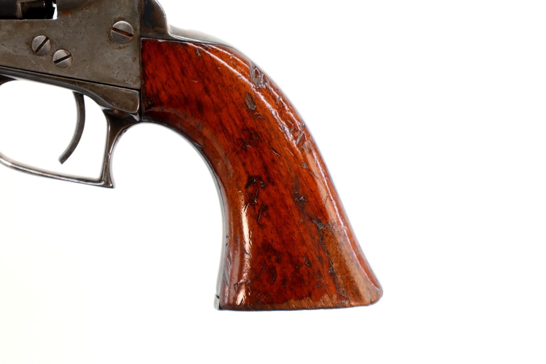 Main Description: Functions mechanically as designed. Brass bead, round barrel, fluted cylinder, nipples are intact, checkered spur hammer. Two piece wood grips, loading lever under barrel.