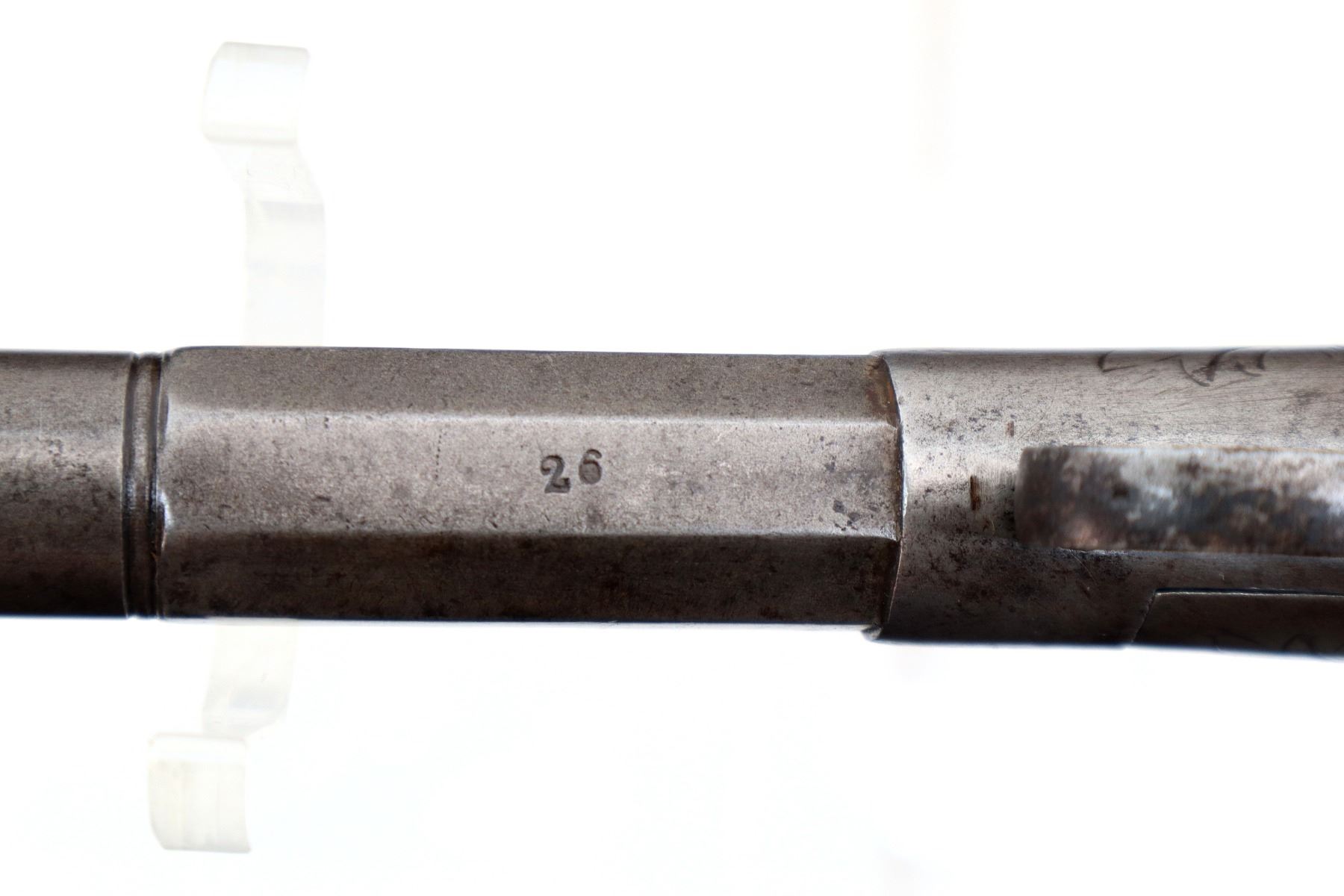Main Description: Brass front blade, half octagon half round barrel, engraved frame, smooth spur hammer that functions. Two piece smooth wood grips,