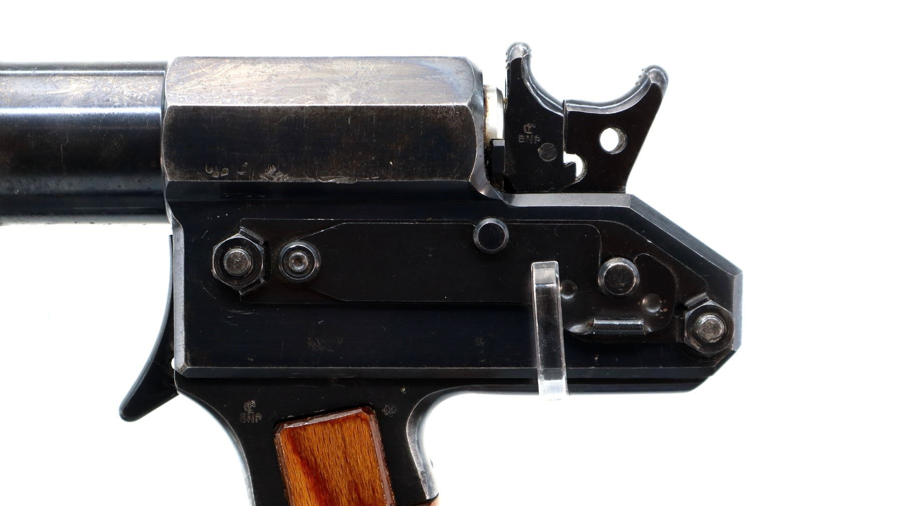 Main Description: No sights, blued finish, heavy steel construction, grooved spur hammer and opening lever that function, smooth trigger. One piece laminate wood grip, various British proof marks.