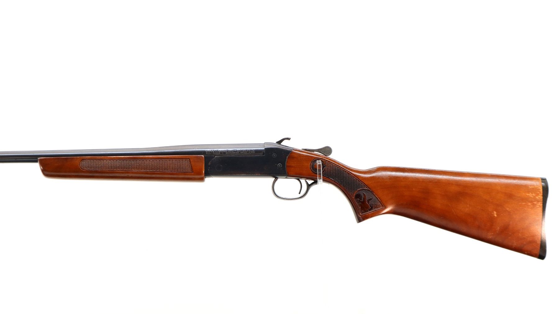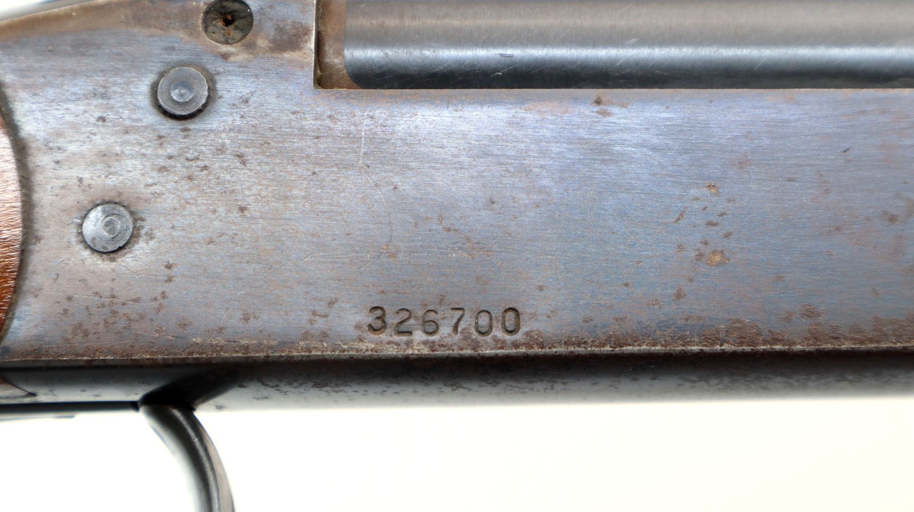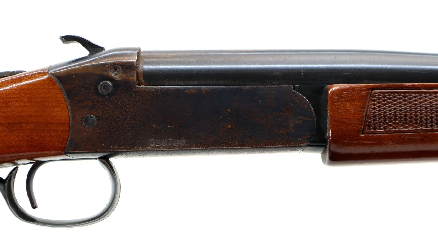 Main Description: Brass bead, blued finish, grooved spur hammer, ejector. Two piece wood stocks, checkered forearm and pistol grip, small crack behind upper tang, grooved black polymer butt plate