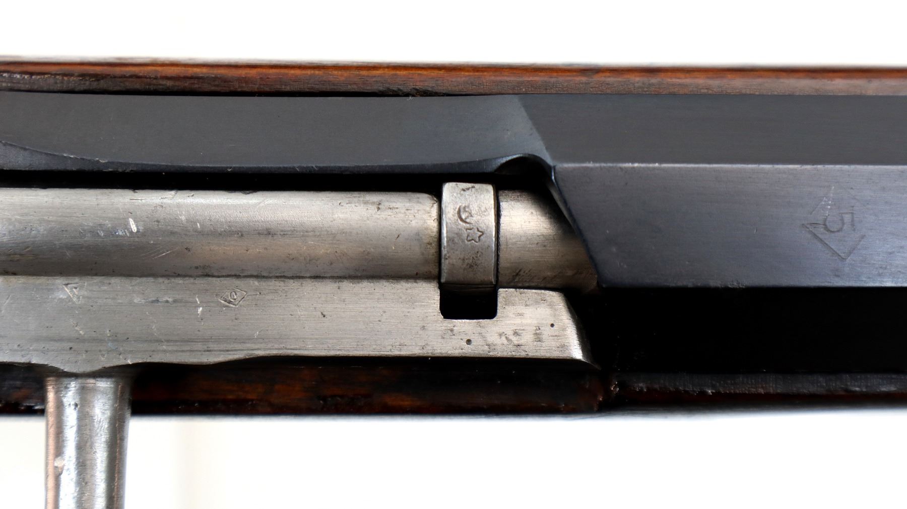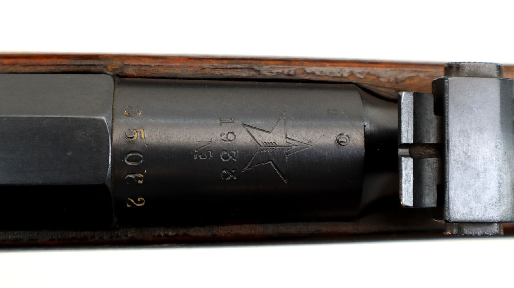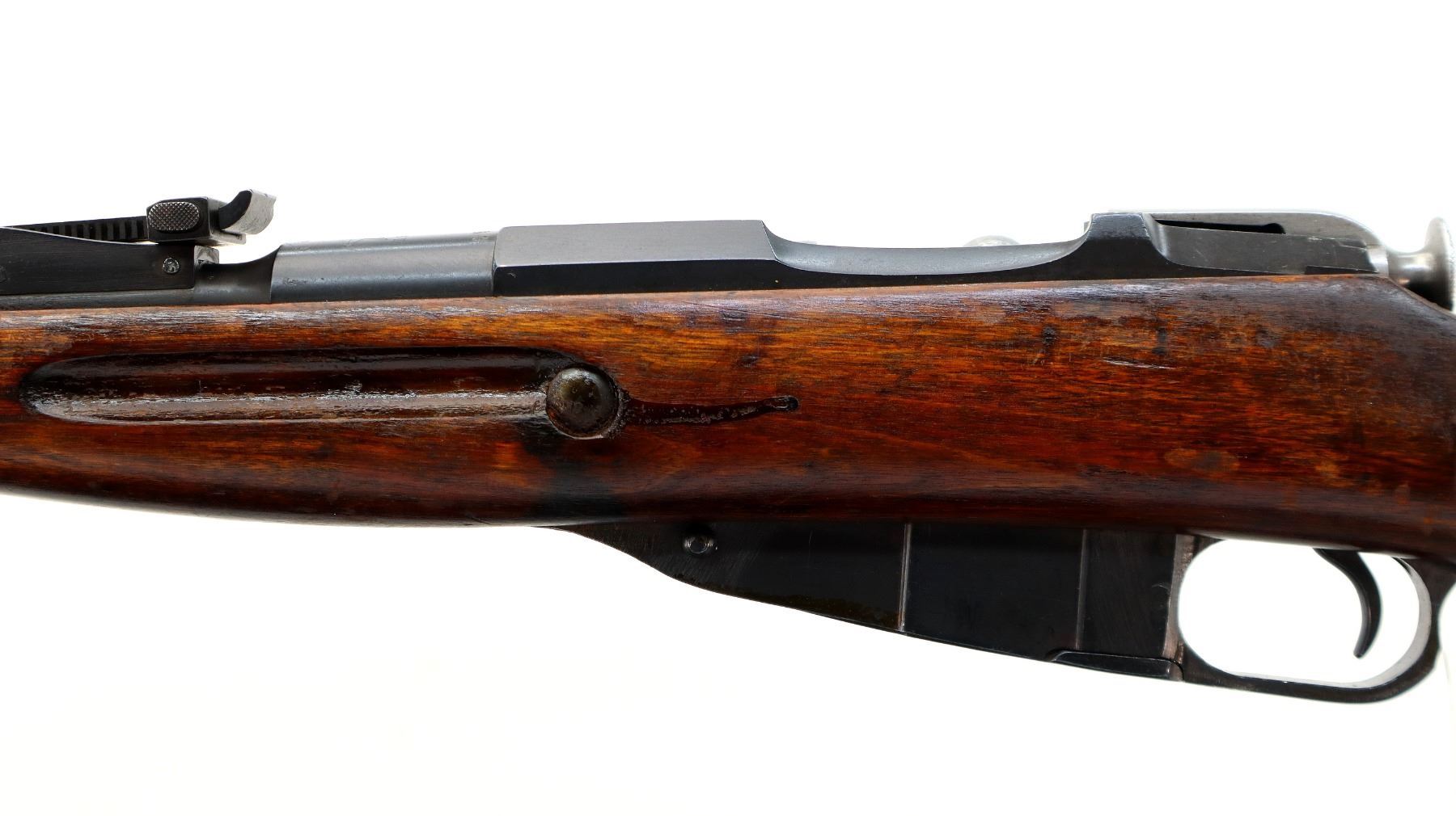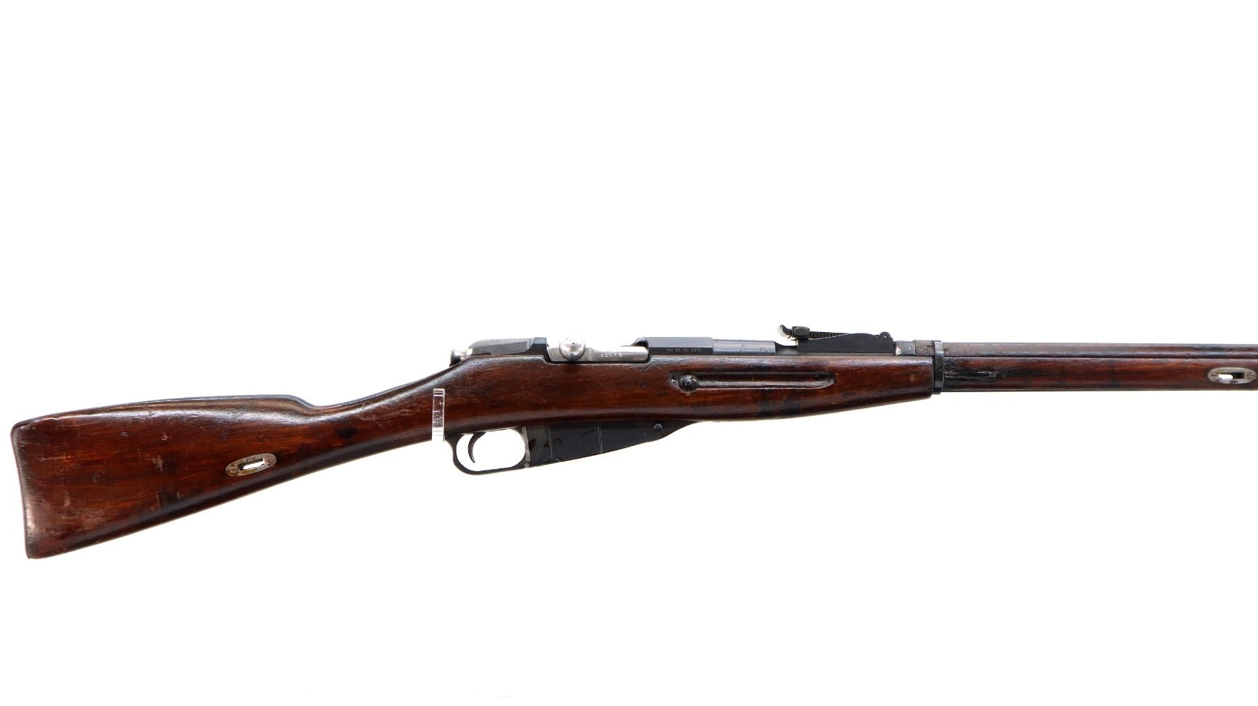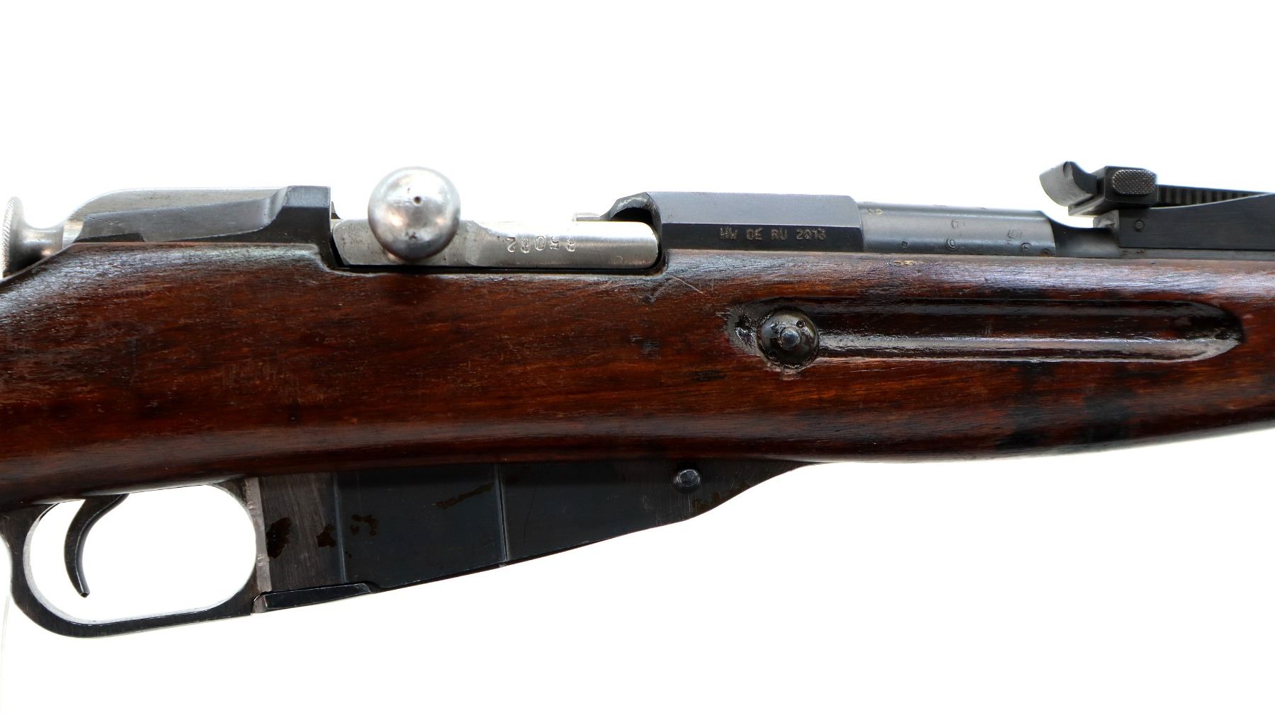 Main Description: Manufactured by Tula 1933, Arsenal rebuilt numbered to match. Post front sight with hood and ramp, adjustable u notched rear sight, blued finish, hex receiver, silver bolt with straight handle. Two piece full military wood stocks, handguard has a large chip, finger grooved forearm, straight grip, smooth steel butt plate, sling slots, cleaning rod.