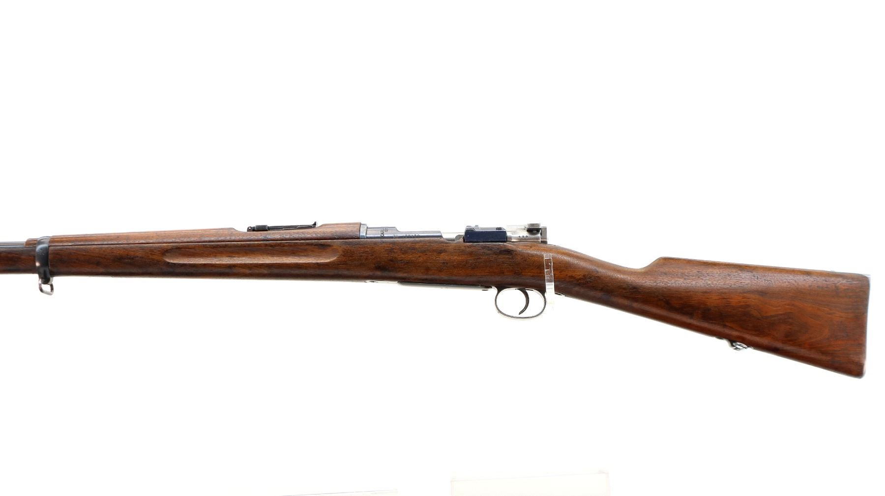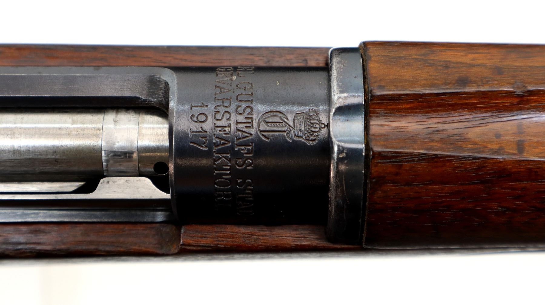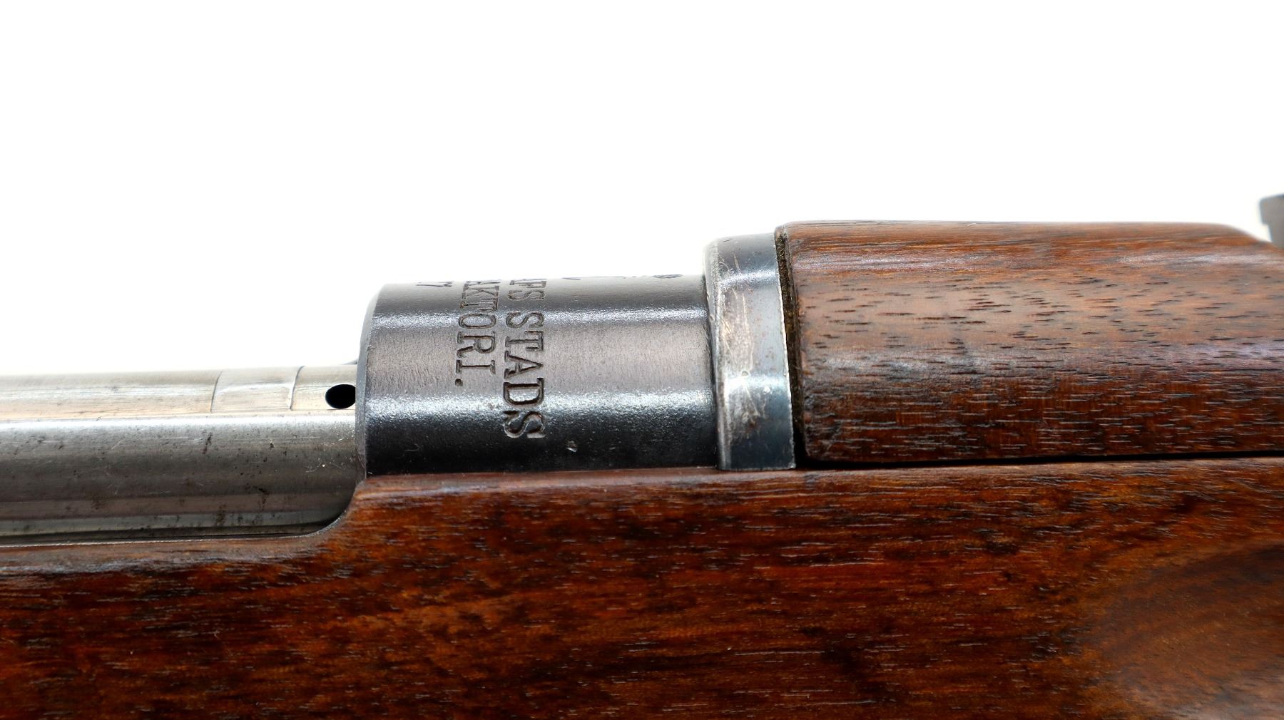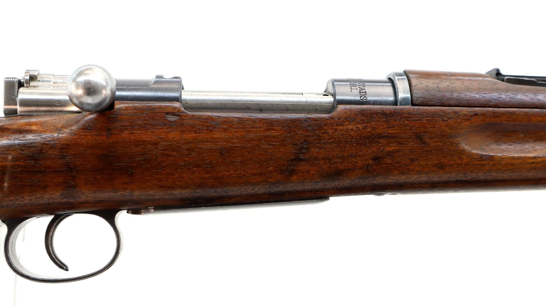 Main Description: Manufactured by Carl Gustafs 1917, visible numbers match. Blade front sight with ramp, adjustable u notched rear sight, blued finish, silver bolt with straight handle. Two piece full military wood stocks, finger grooved forearm, straight grip small crack behind tang, smooth steel butt plate, brass stock disk on right side, sling swivels, bayonet lug, cleaning rod.