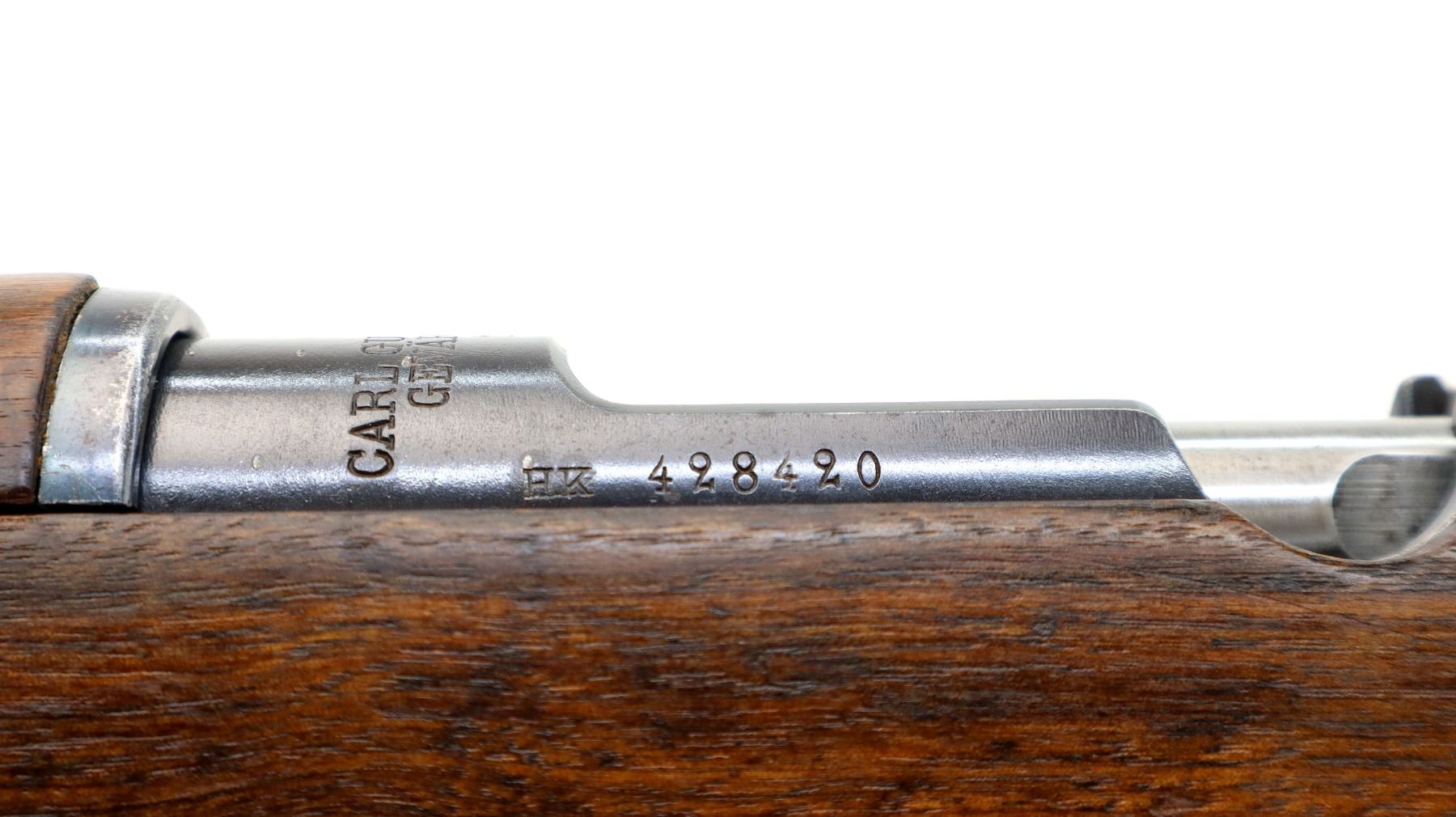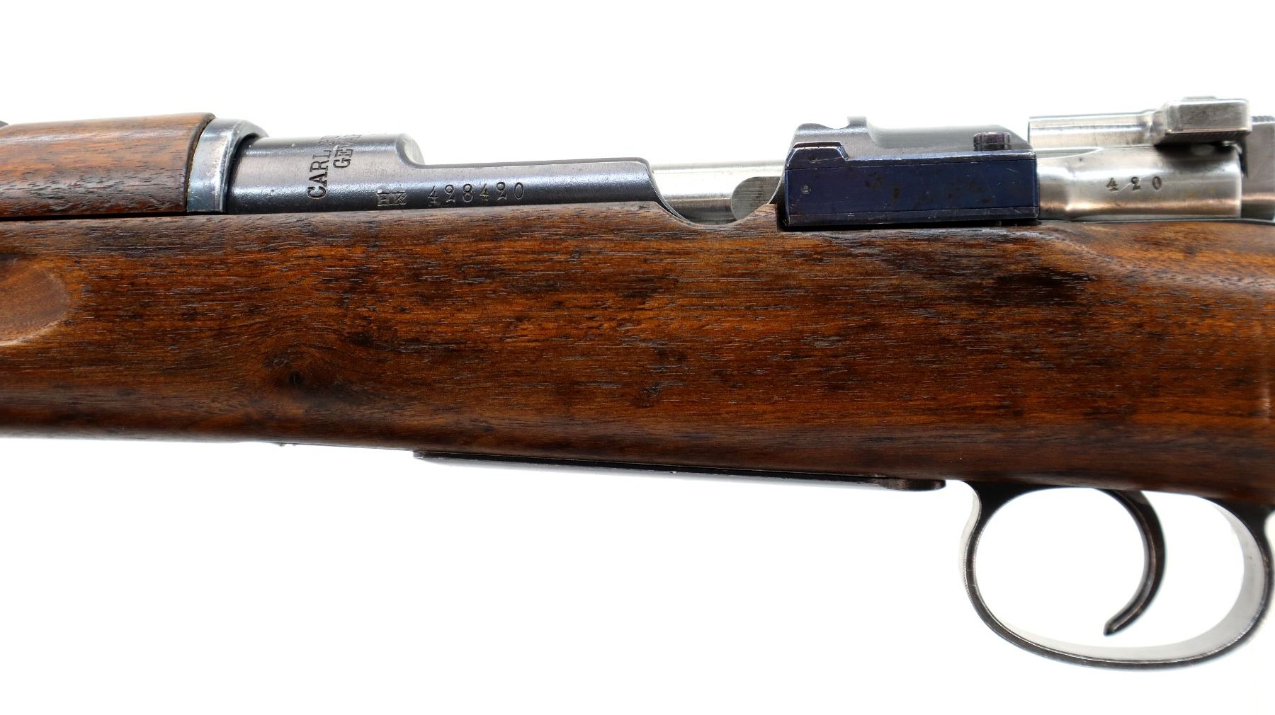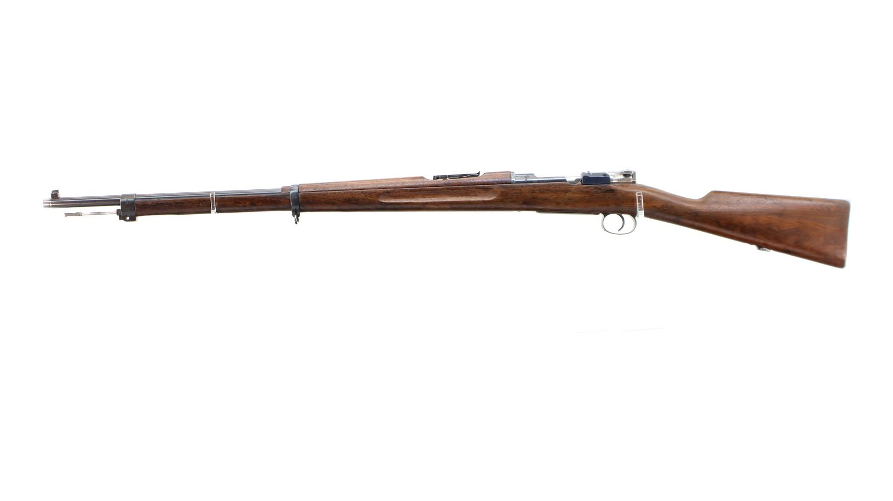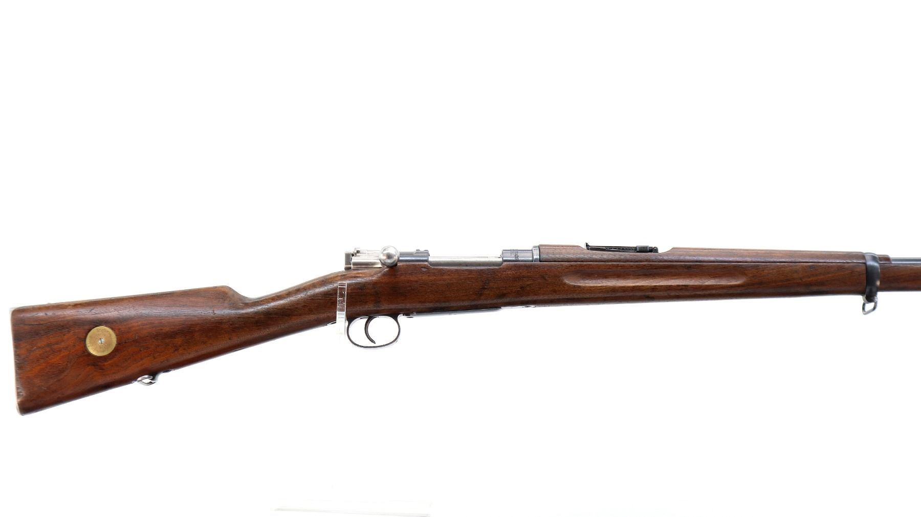 Main Description: Manufactured by Carl Gustafs 1917, visible numbers match. Blade front sight with ramp, adjustable u notched rear sight, blued finish, silver bolt with straight handle. Two piece full military wood stocks, finger grooved forearm, straight grip small crack behind tang, smooth steel butt plate, brass stock disk on right side, sling swivels, bayonet lug, cleaning rod.