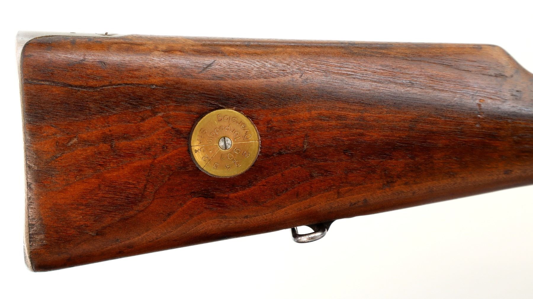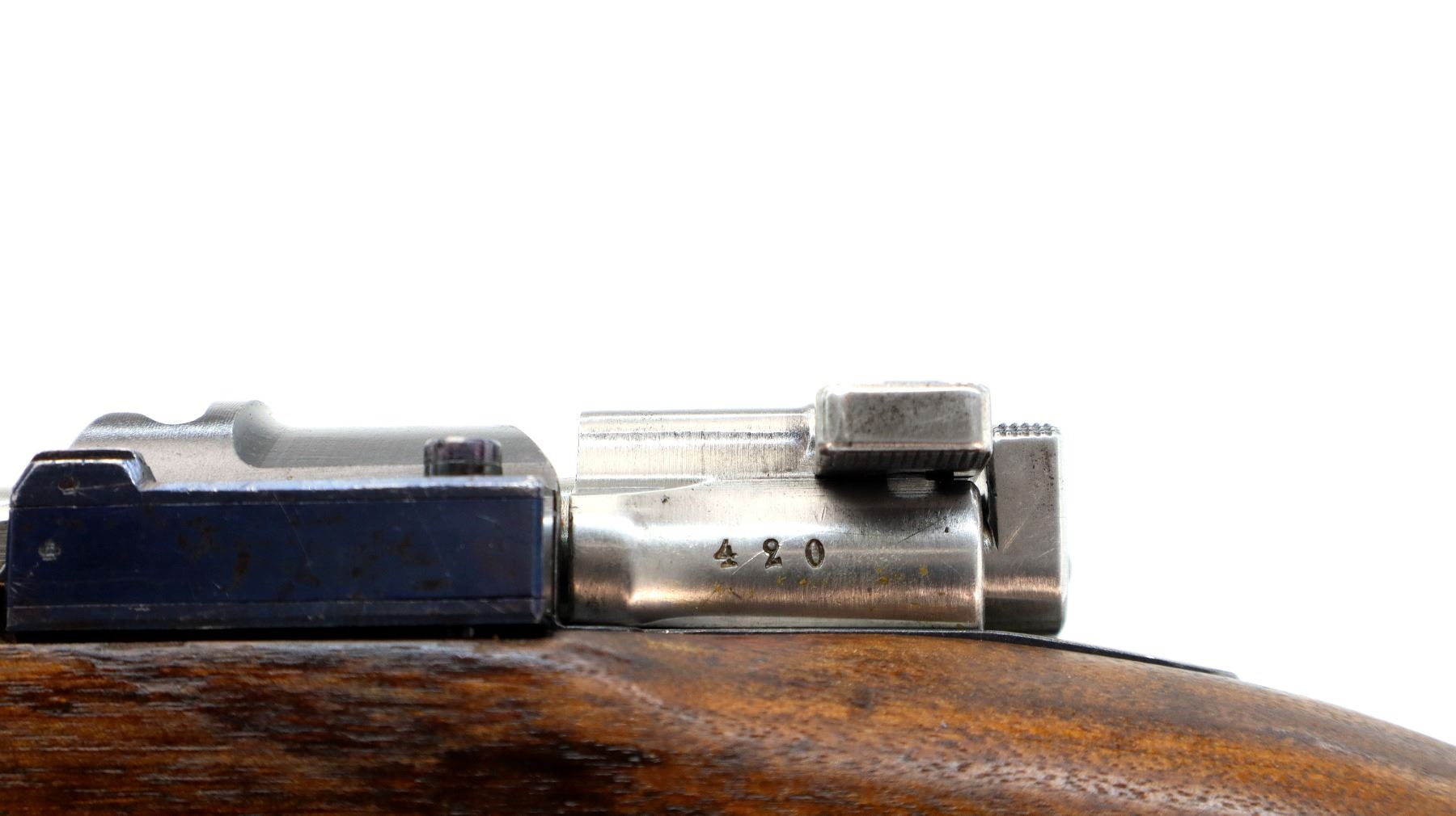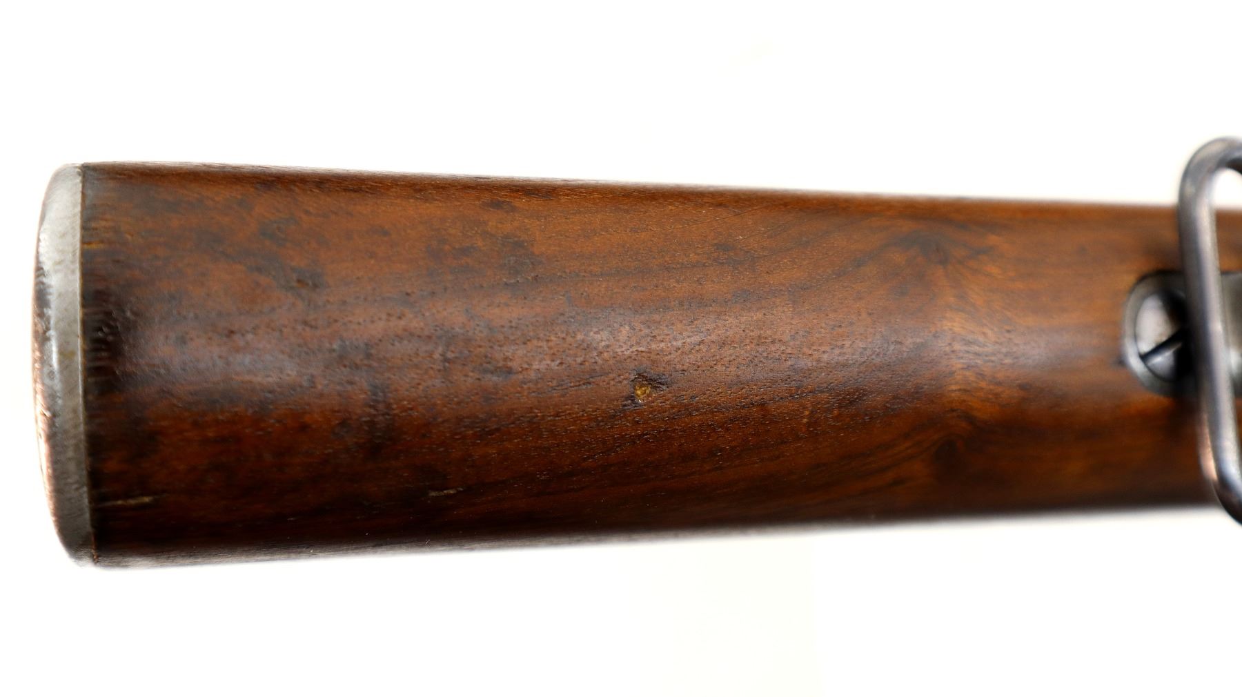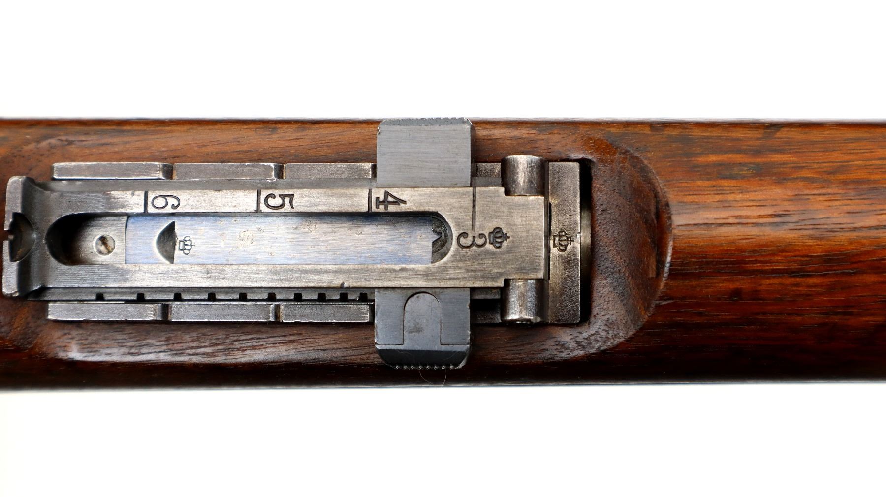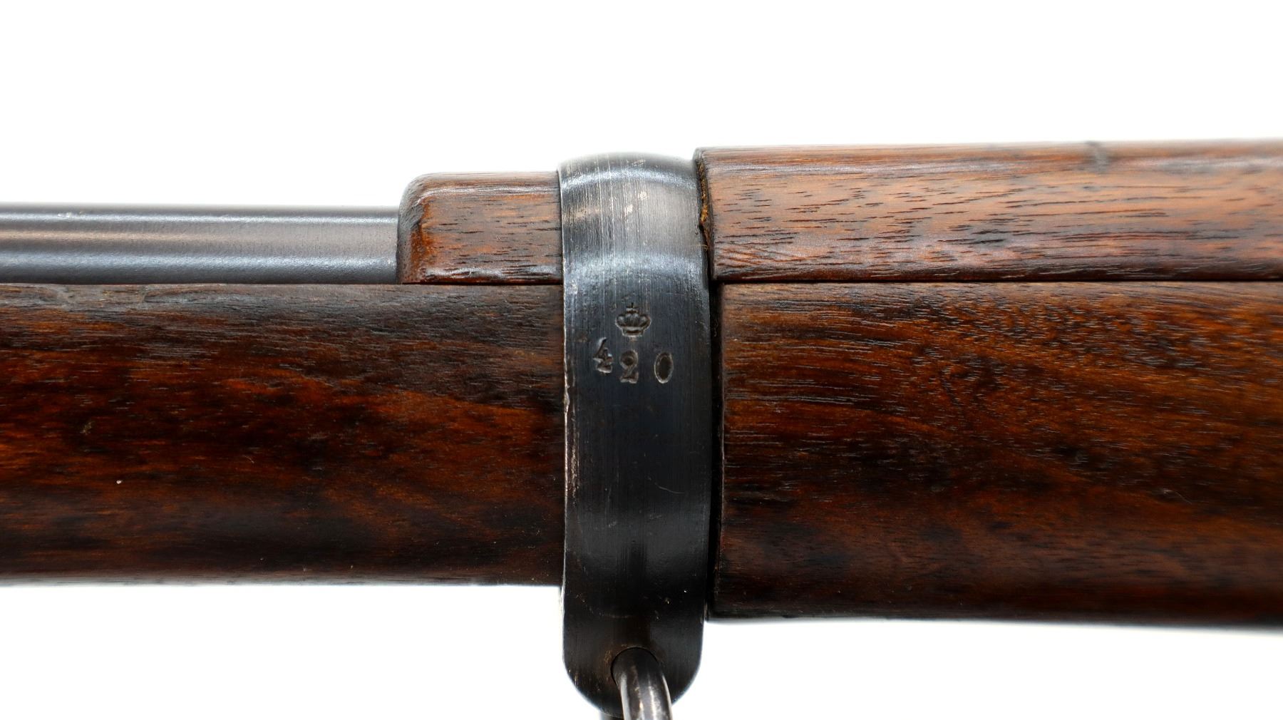 Main Description: Manufactured by Carl Gustafs 1917, visible numbers match. Blade front sight with ramp, adjustable u notched rear sight, blued finish, silver bolt with straight handle. Two piece full military wood stocks, finger grooved forearm, straight grip small crack behind tang, smooth steel butt plate, brass stock disk on right side, sling swivels, bayonet lug, cleaning rod.