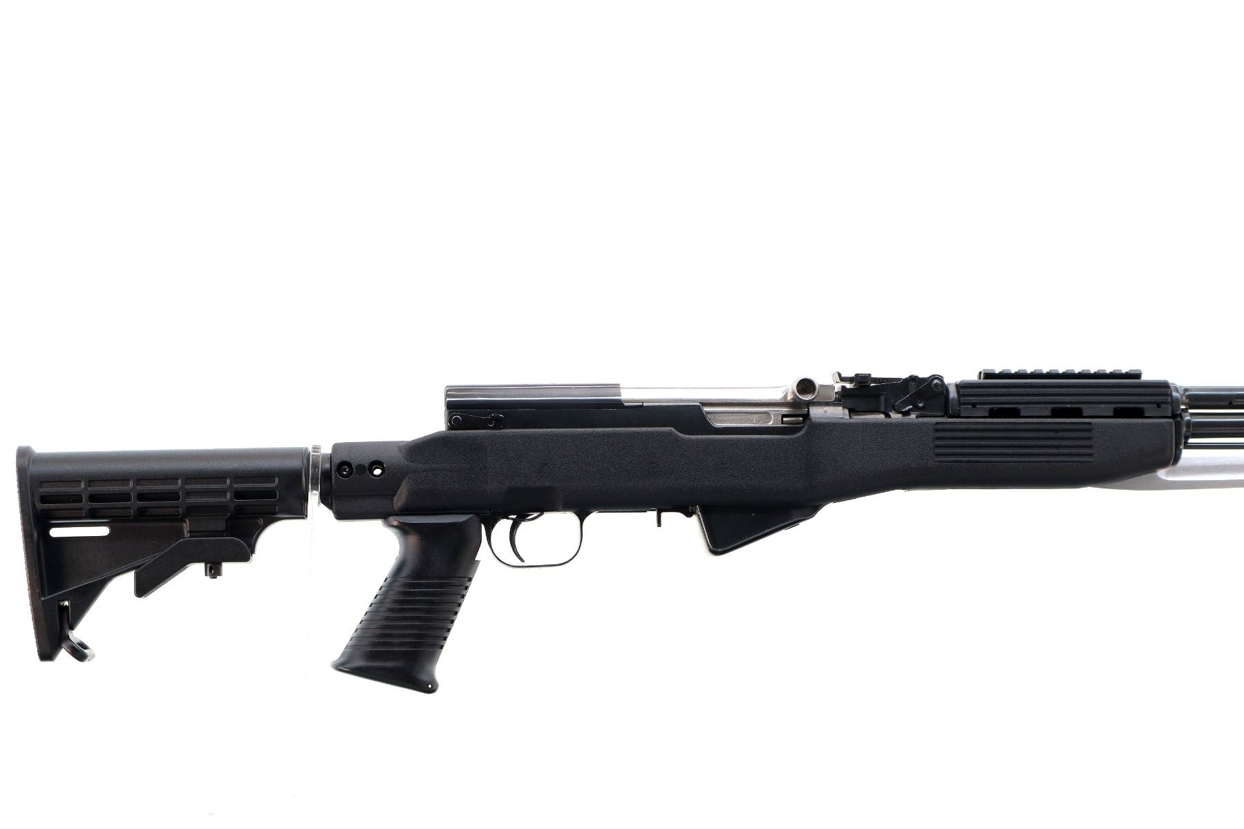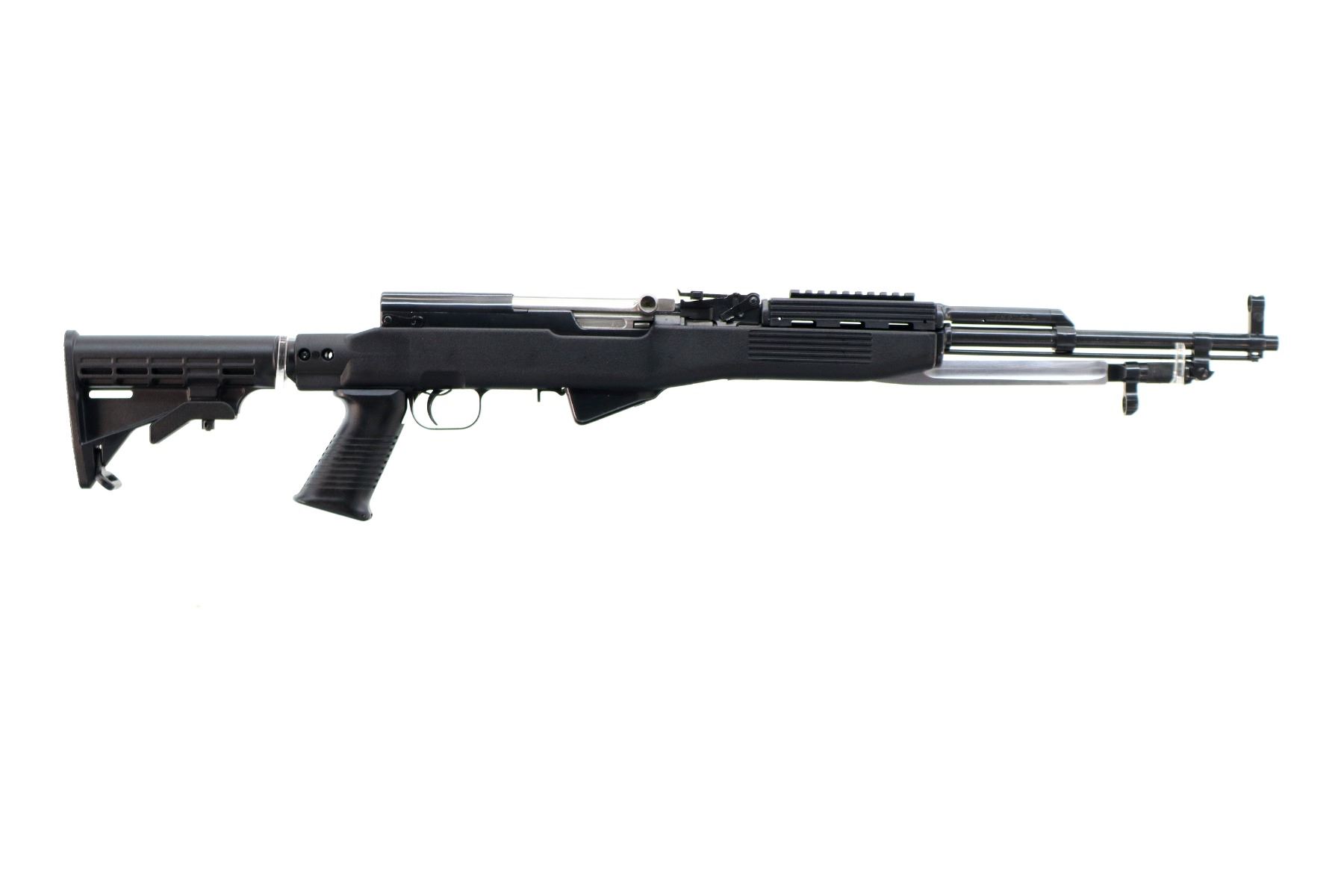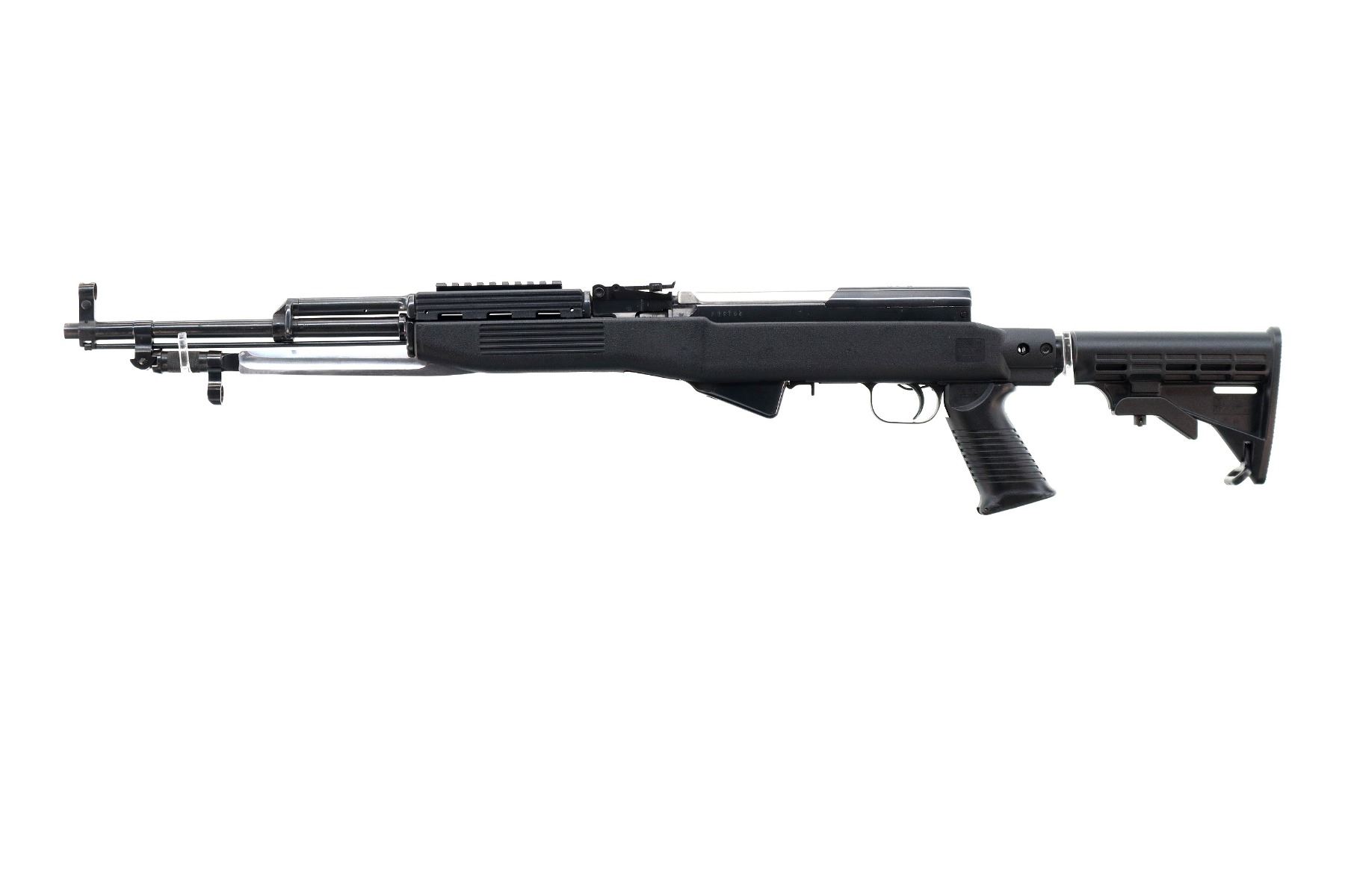 Main Description: Manufactured by Tula 1951, visible numbers match. Post front sight with hood and ramp, adjustable u notched rear sight, blued finish, silver bolt and carrier. Two piece black synthetic Tapco synthetic stocks, ventilated handguard with integral rail on top, grooved forearm and pistol grip with trap, collapsible M4 style butt stock, missing one retaining bolt, checkered butt, sling swivels, cleaning rod, attached folding blade bayonet.