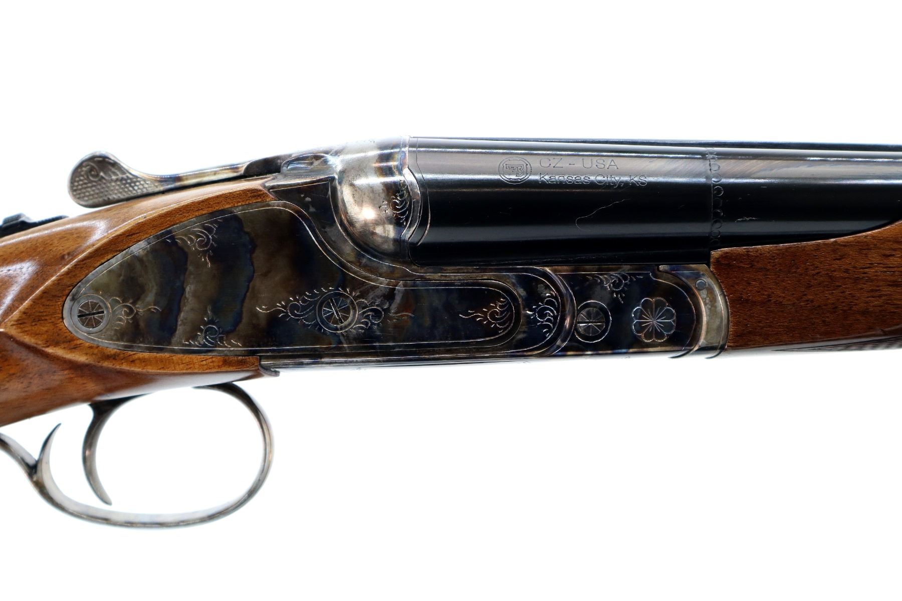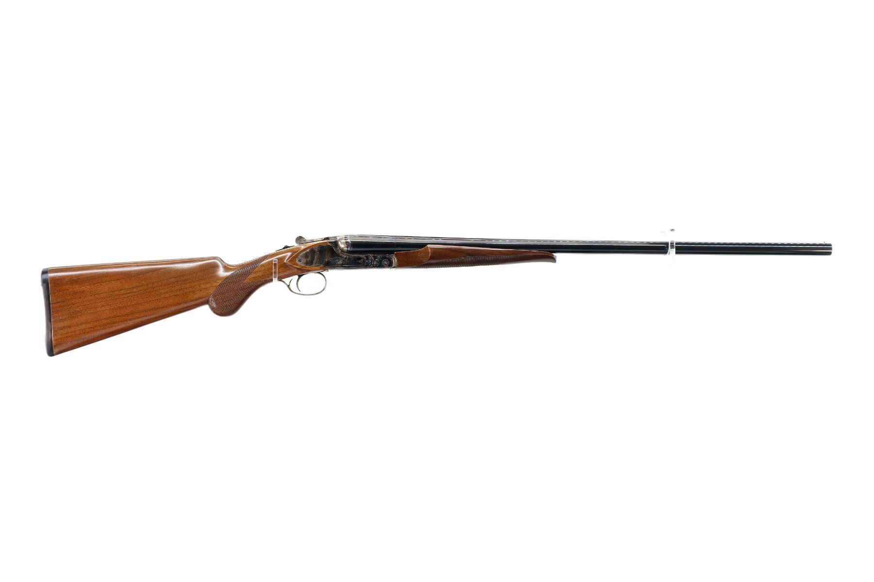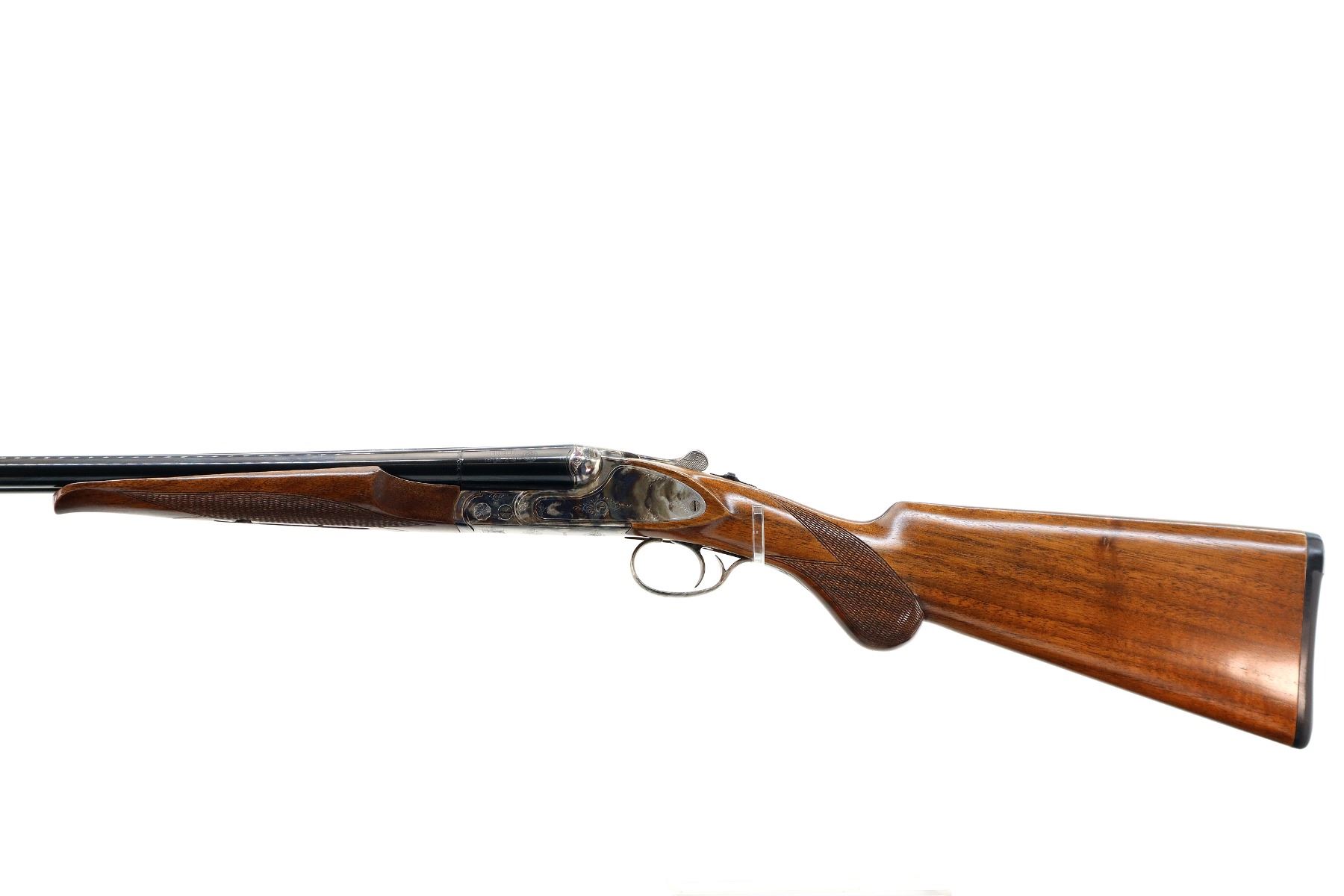 Main Description: Brass bead, polish blued barrels with raised rib, engraved colour case hardened receiver with side plates, manual selective safety, extractor, single mechanical trigger. Two piece wood stocks, checkered Beavertail forearm and pistol grip, black rubber recoil pad.