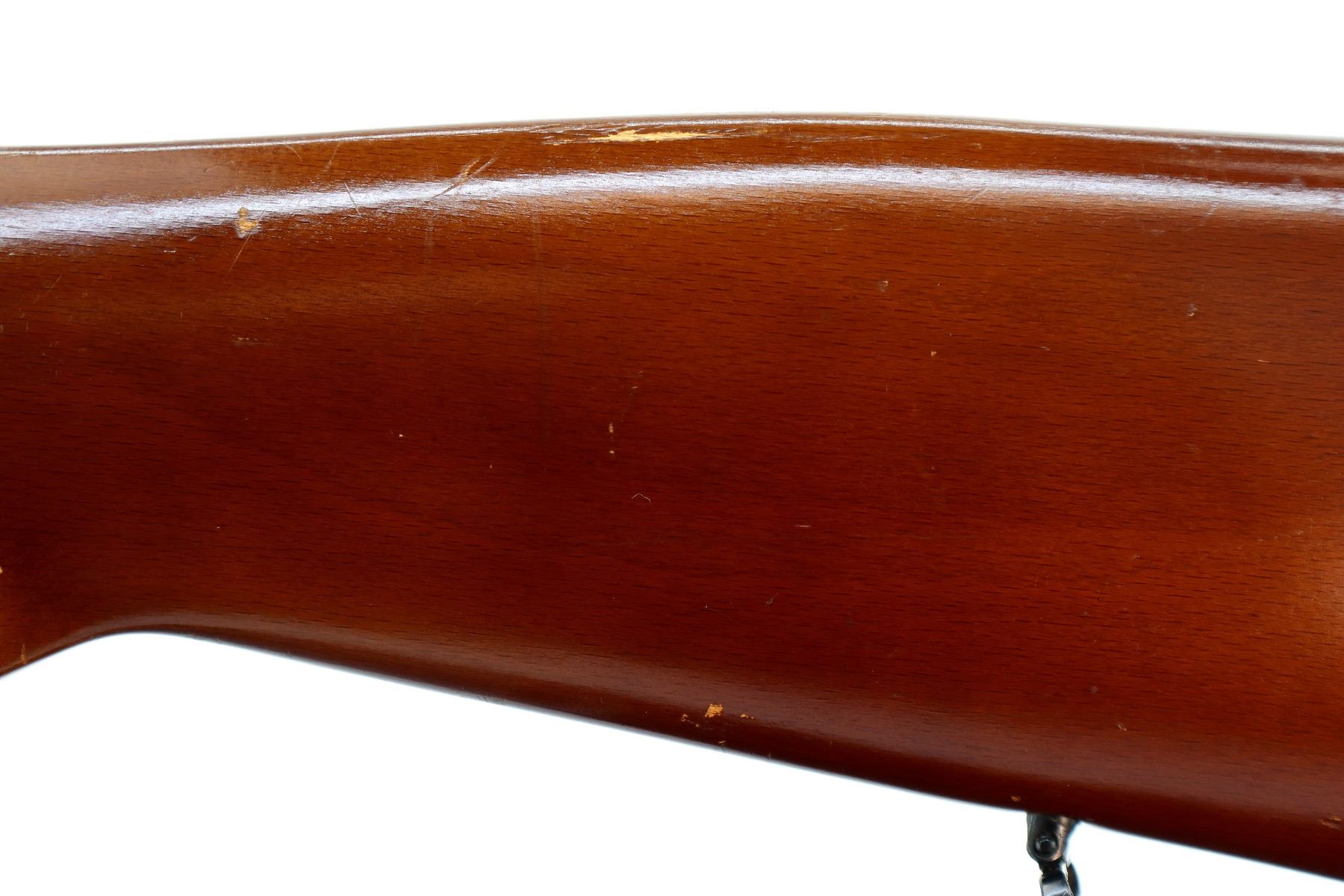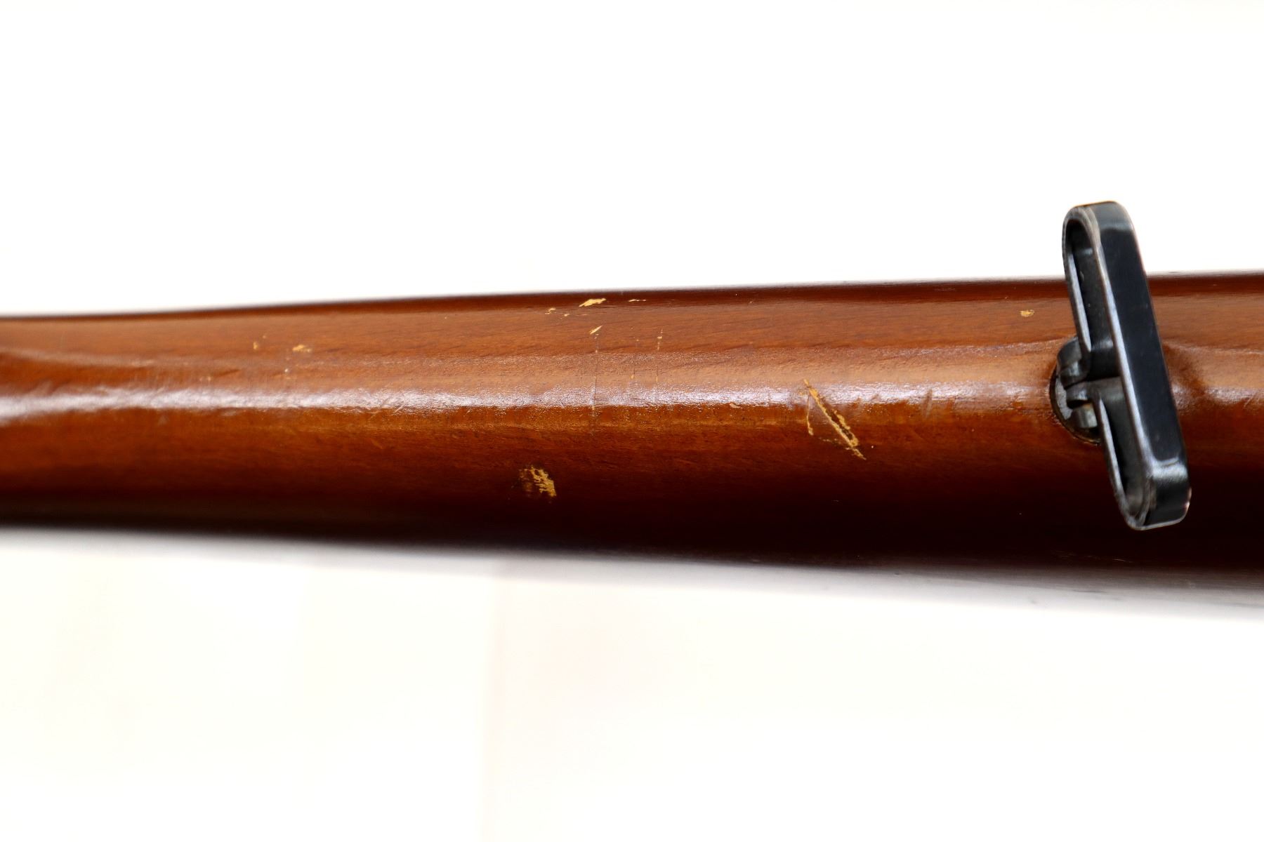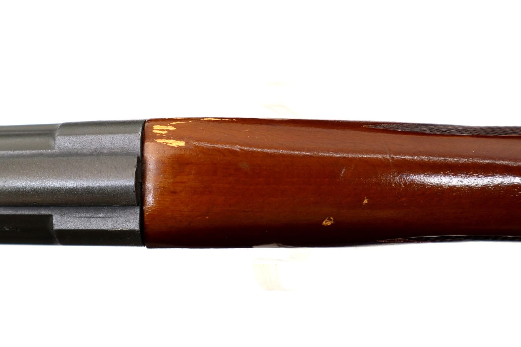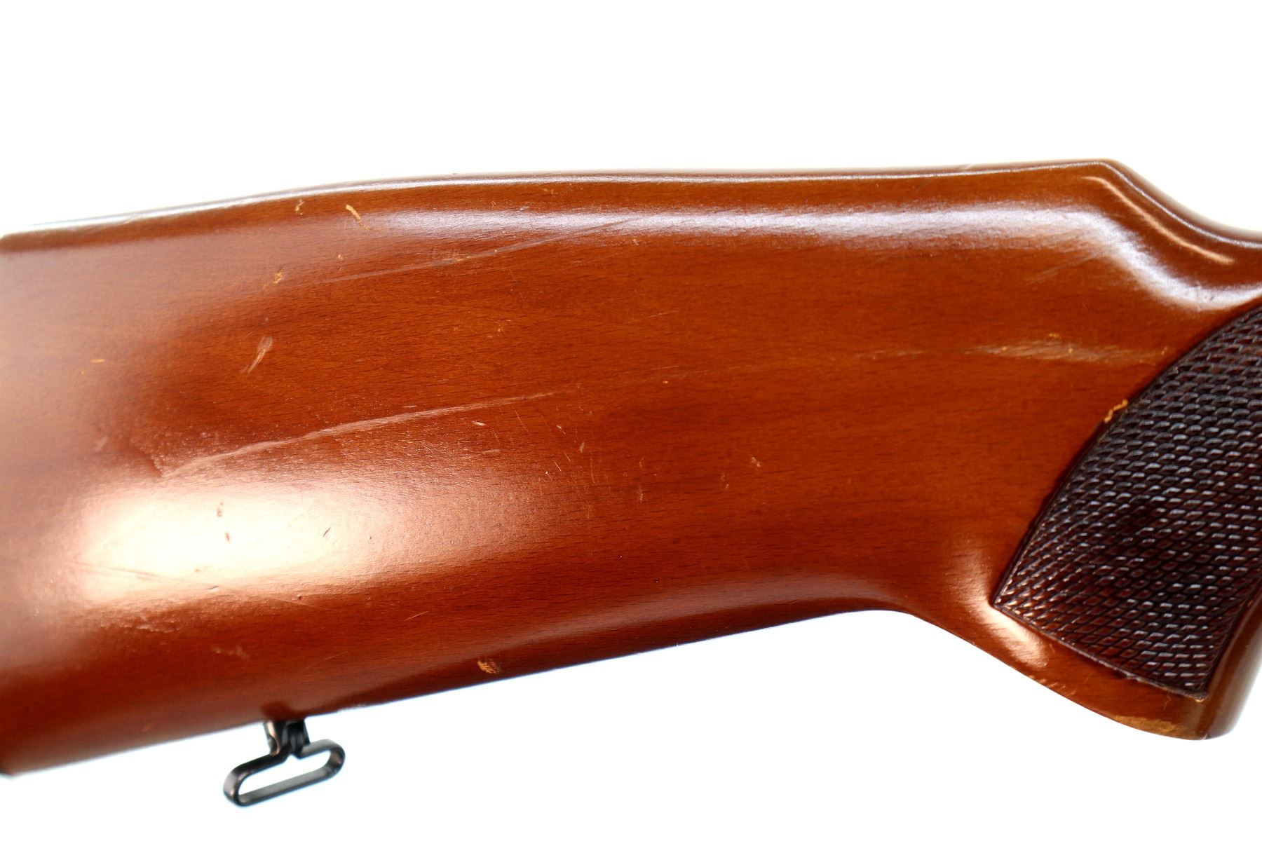 Main Description: Blade front sight missing ramp, adjustable folding u notched rear sight, blued round barrel, grooved grey alloy receiver. Two piece wood stocks, finger grooved checkered forearm, pistol grip and black polymer butt plate, has sling swivels.