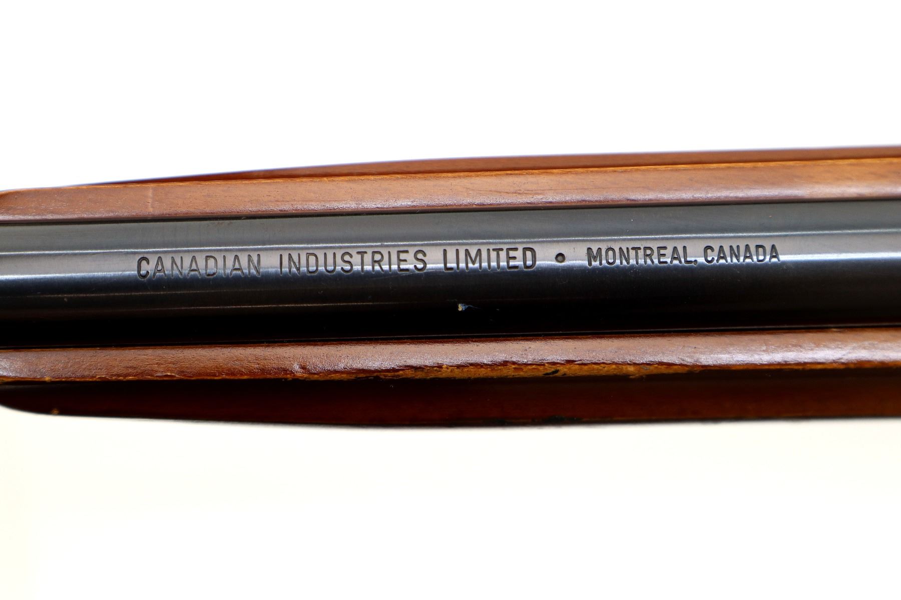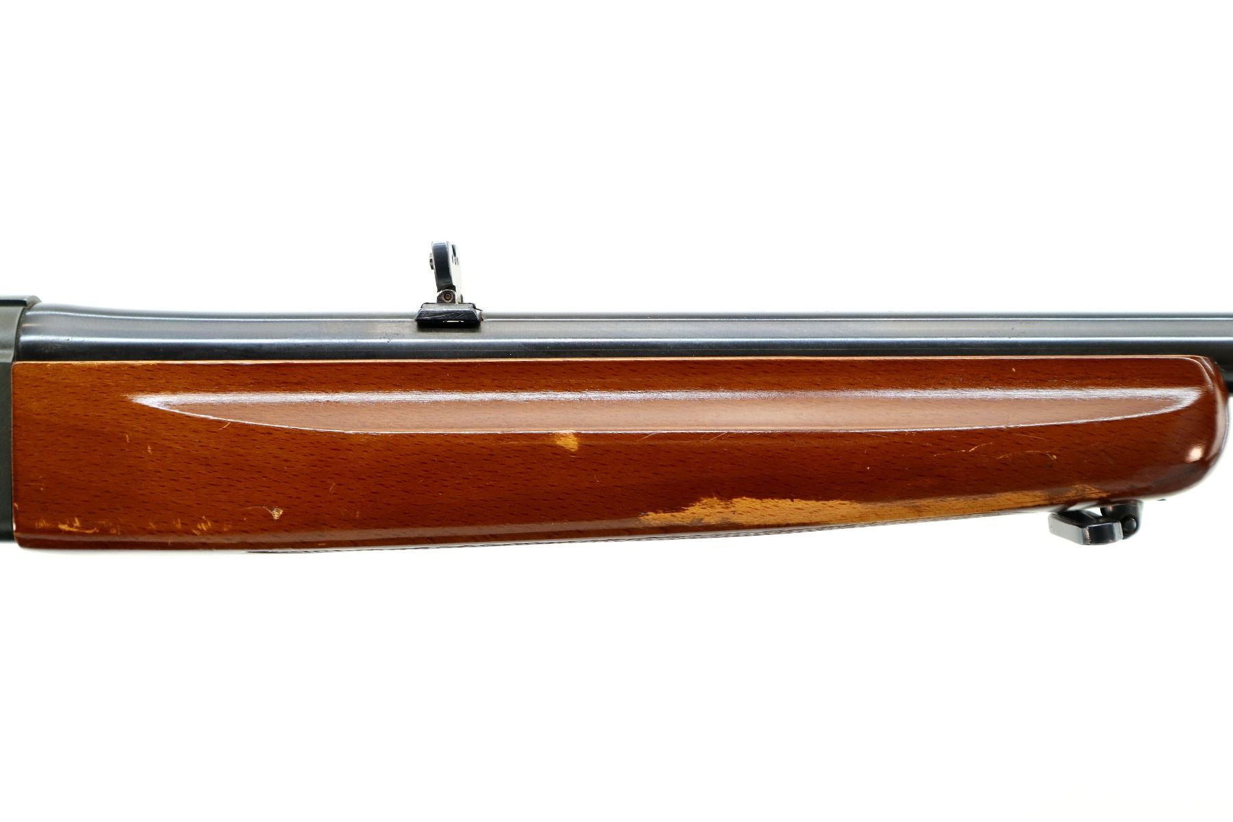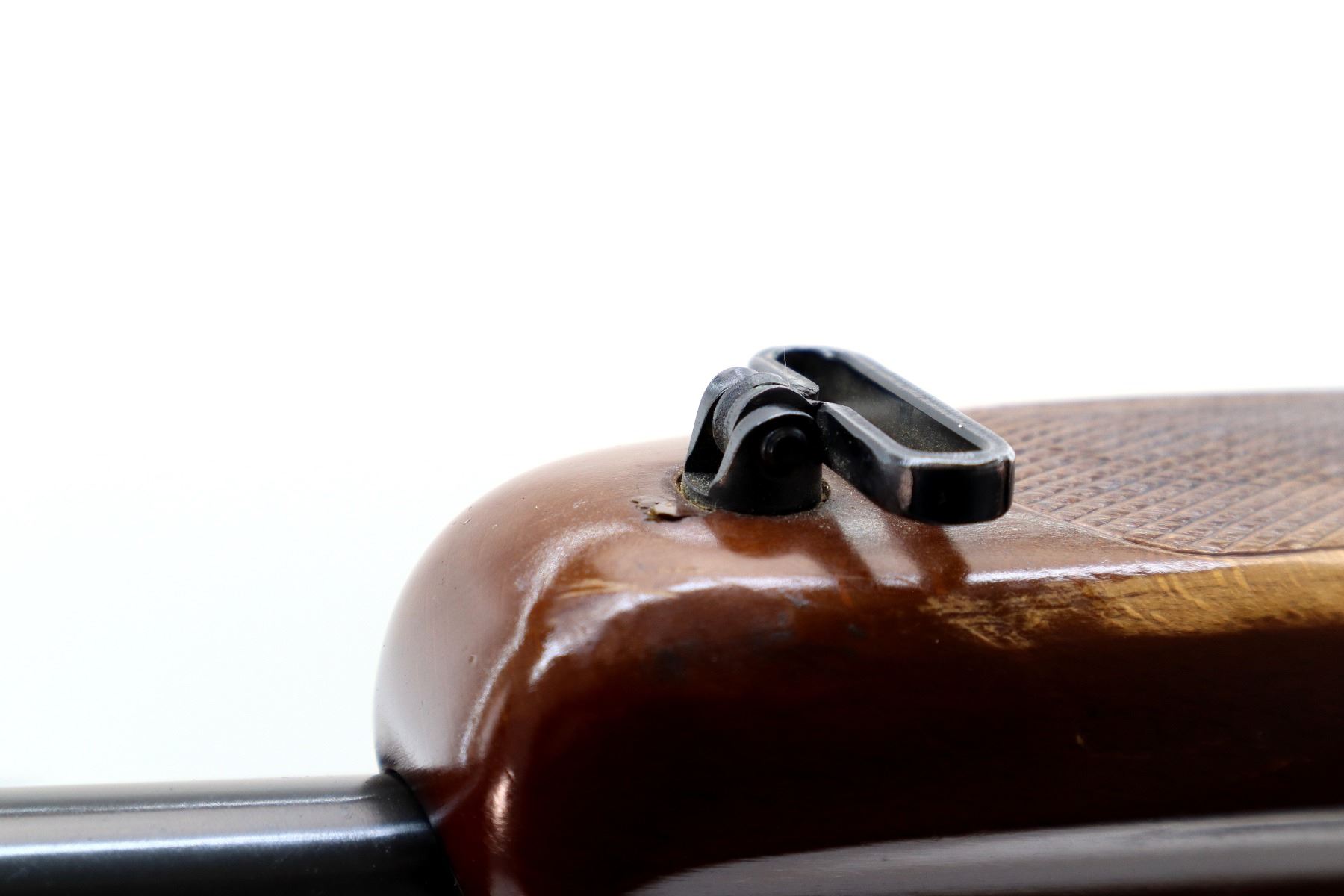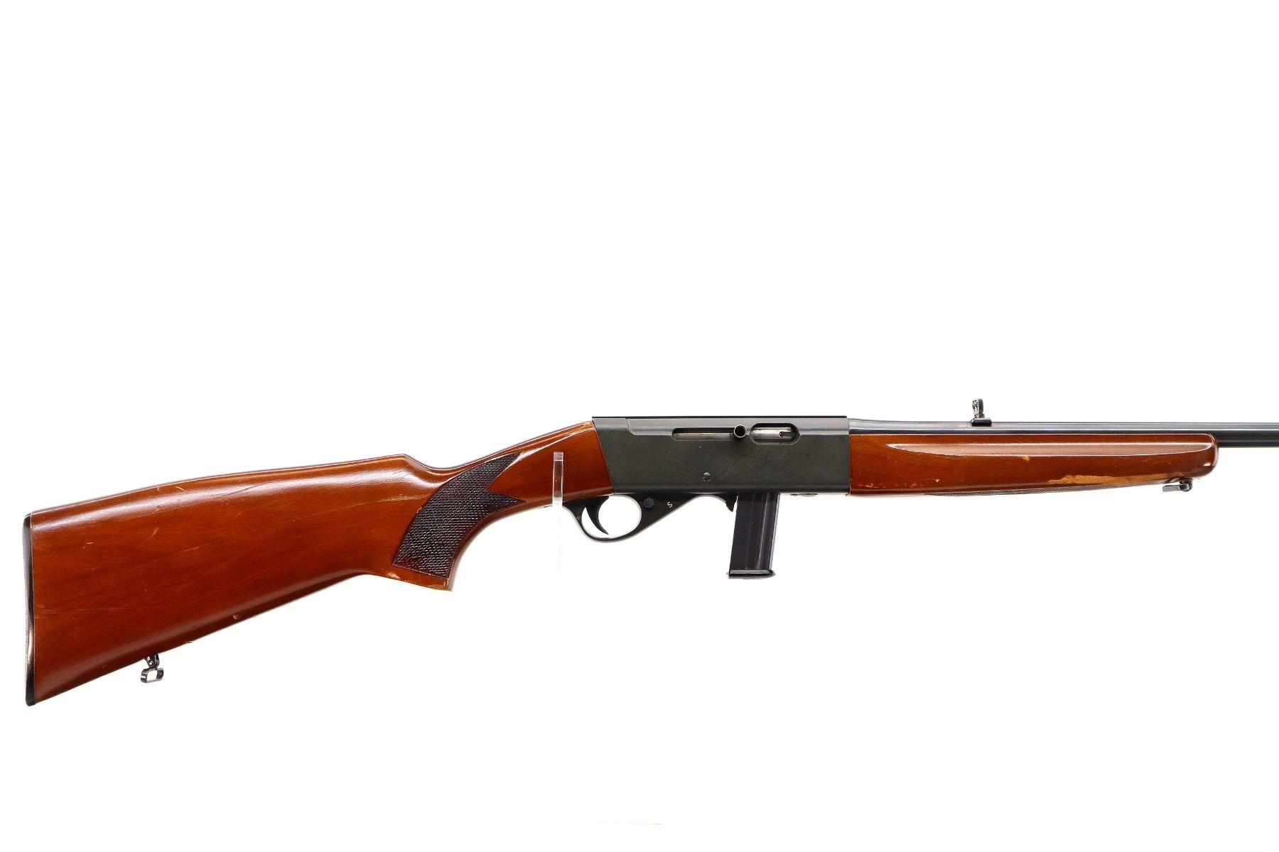 Main Description: Blade front sight missing ramp, adjustable folding u notched rear sight, blued round barrel, grooved grey alloy receiver. Two piece wood stocks, finger grooved checkered forearm, pistol grip and black polymer butt plate, has sling swivels.