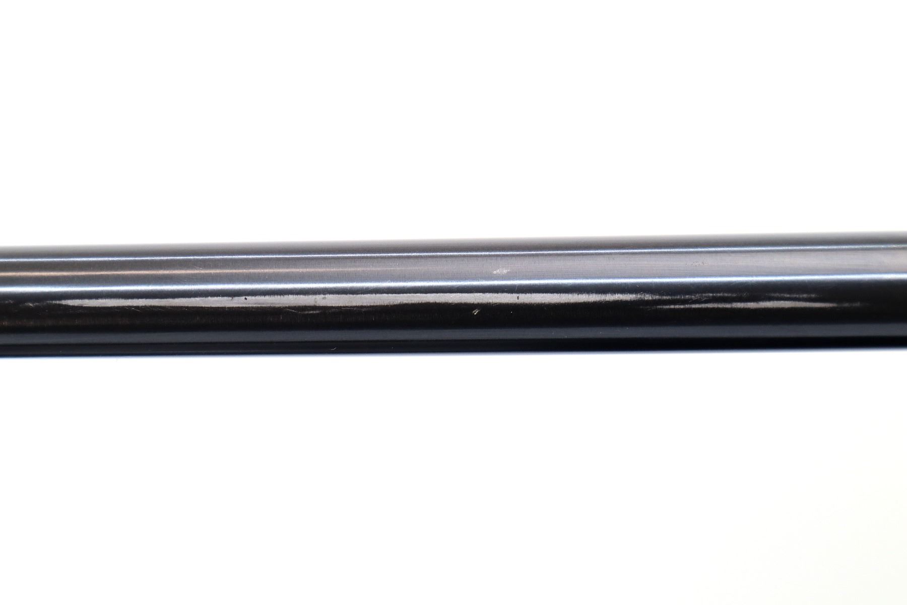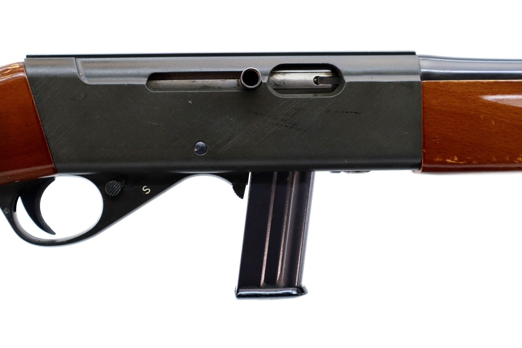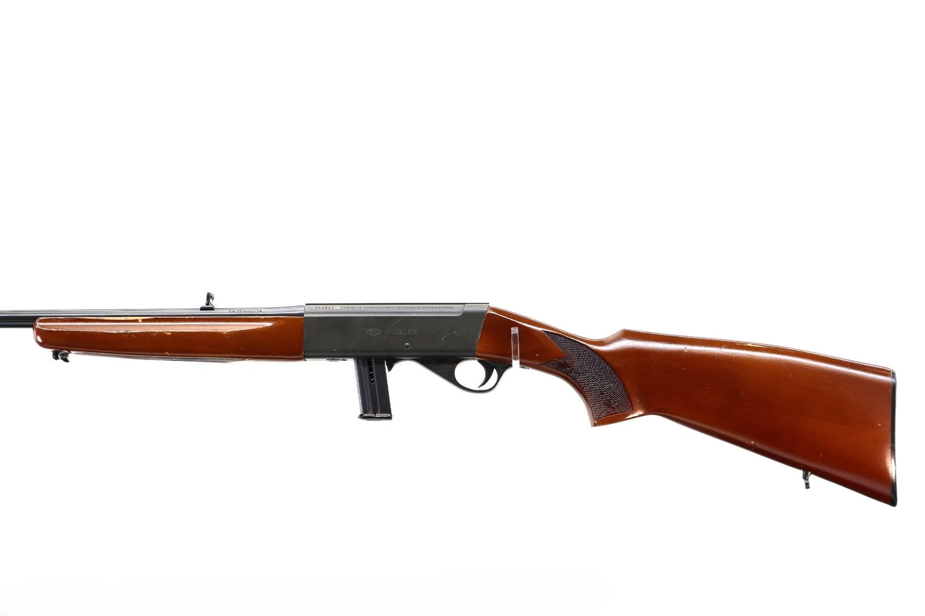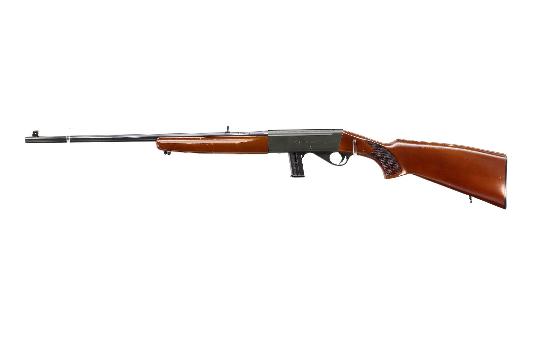 Main Description: Blade front sight missing ramp, adjustable folding u notched rear sight, blued round barrel, grooved grey alloy receiver. Two piece wood stocks, finger grooved checkered forearm, pistol grip and black polymer butt plate, has sling swivels.