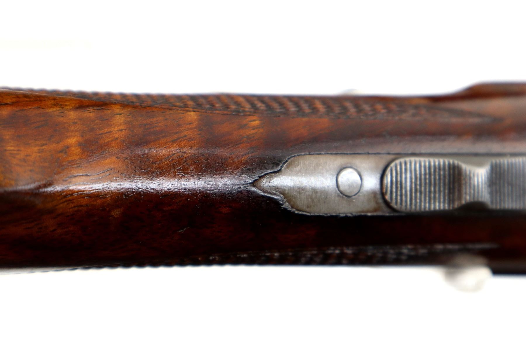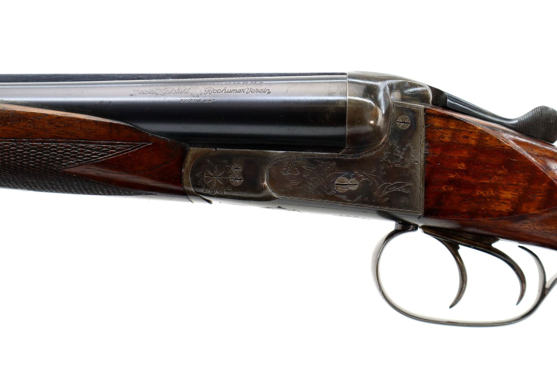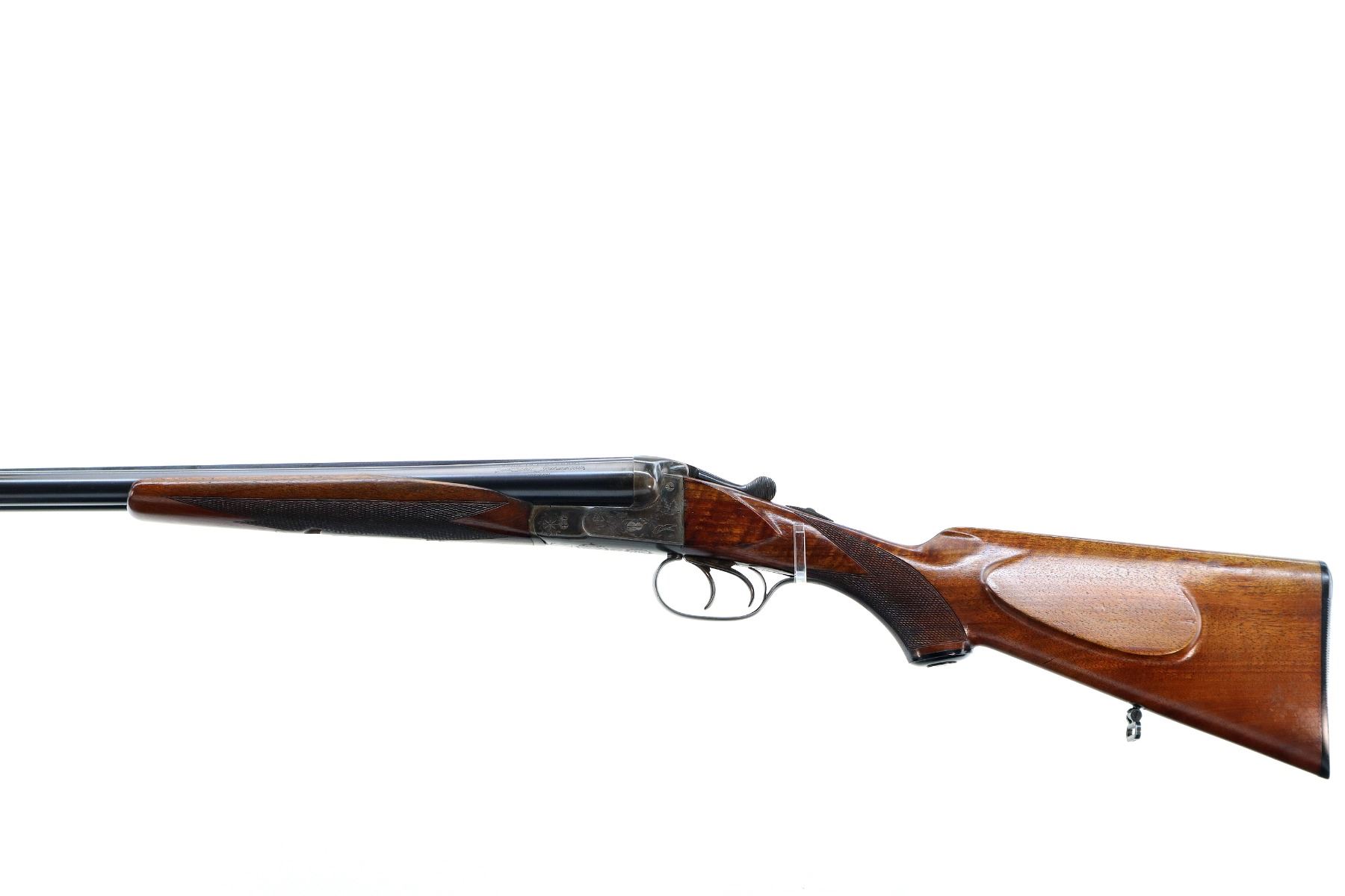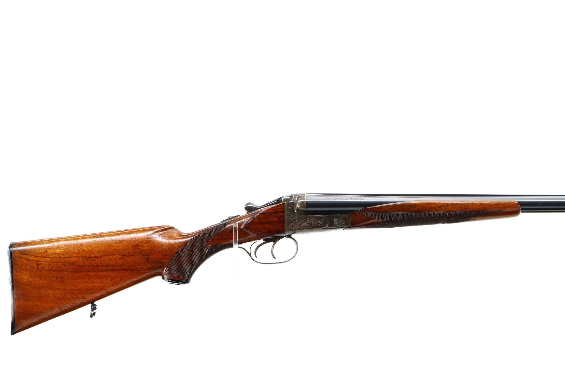 Main Description: Silver bead, blued barrels with raised rib, colour case hardened engraved receiver, automatic safety, extractor, double triggers. Two piece wood stocks, checkered Beavertail forearm and pistol grip, small crack behind upper tang, cheek rest, grooved black polymer butt plate, grip cap, sling swivels