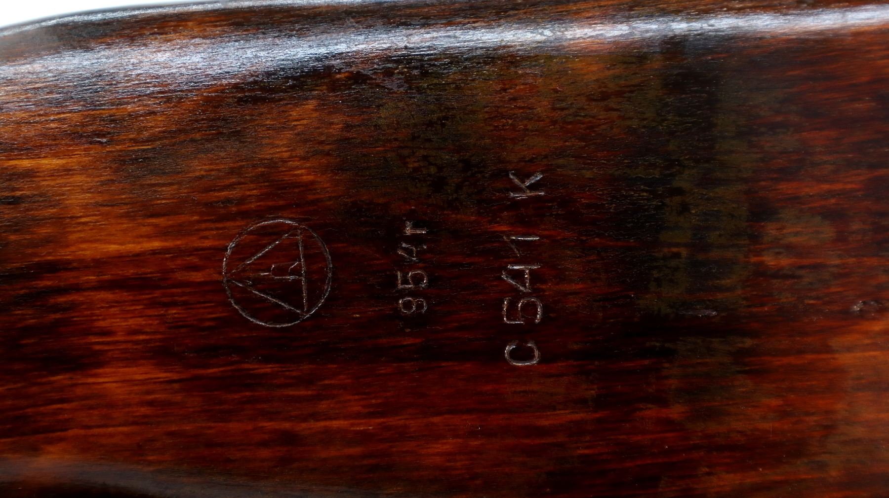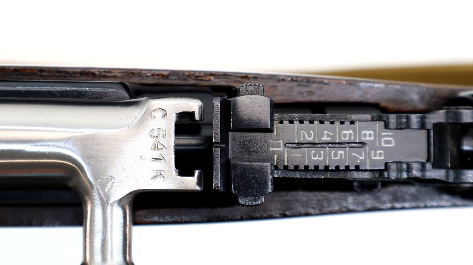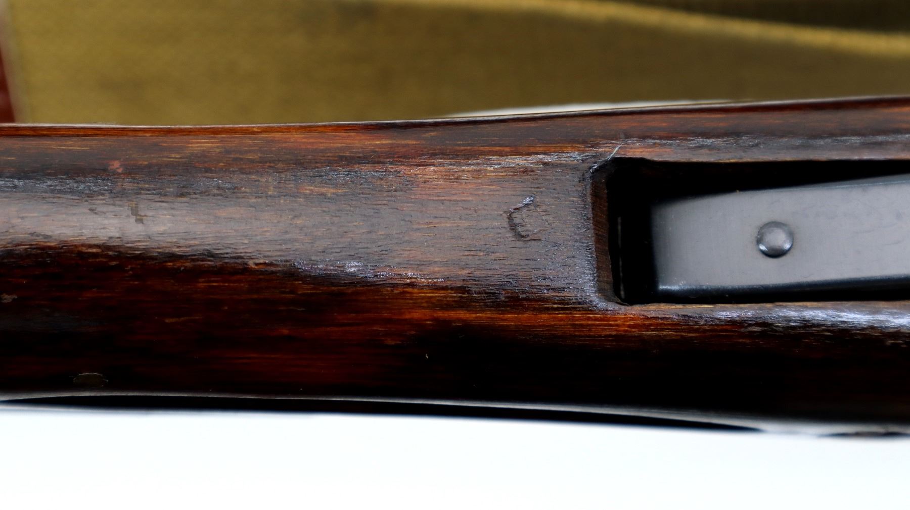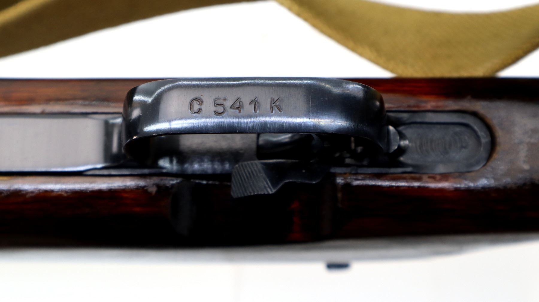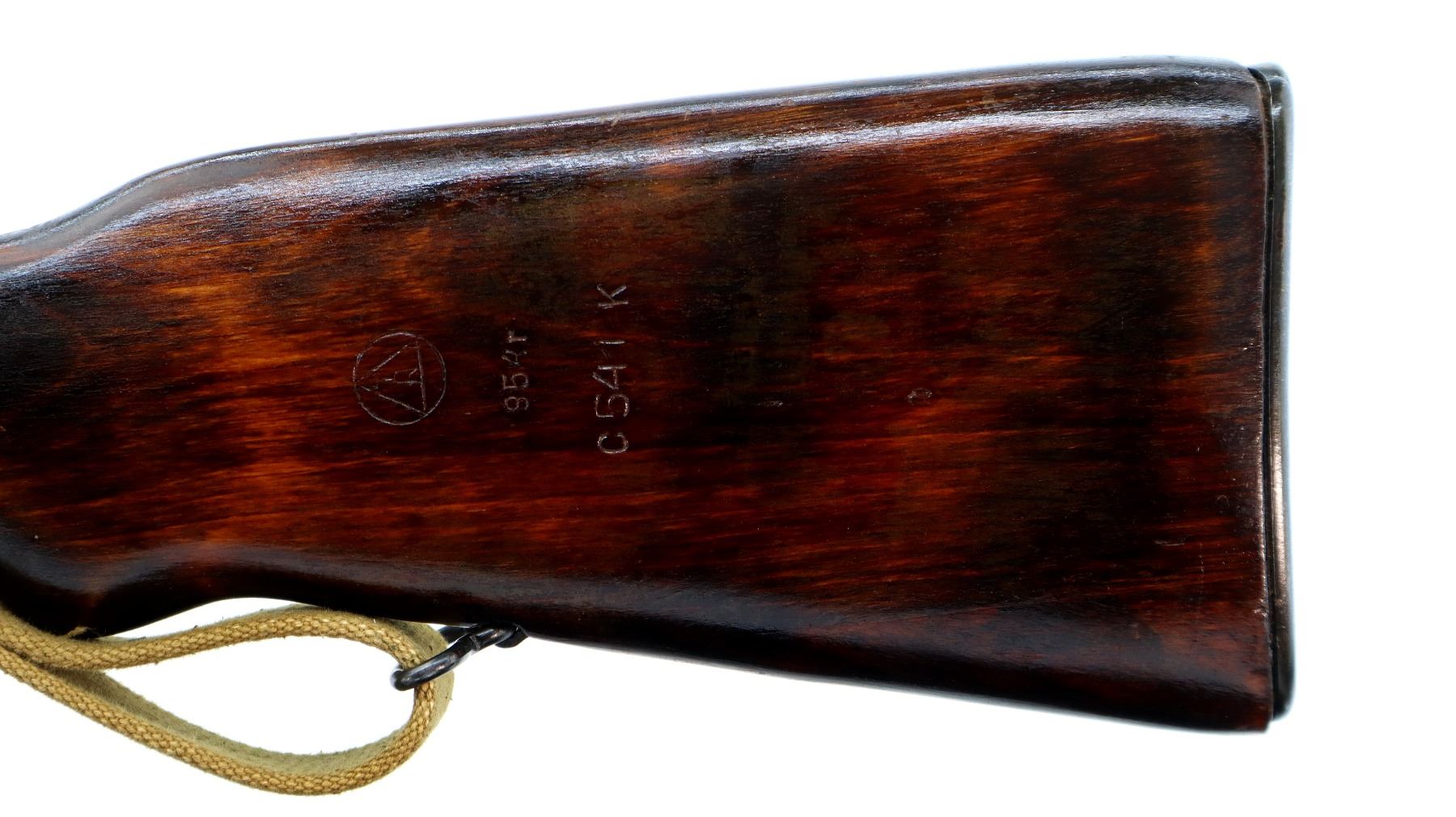 Main Description: Manufactured by Izhevsk 1954, visible numbers match. This Rifle does not appear to have any refurb markings. Post front sight with hood and ramp, adjustable u notched rear sight, blued finish, silver bolt and carrier. Two piece full military wood stocks, ventilated handguard, finger grooved forearm, pistol grip, smooth steel butt plate with trap, lace on ammo holder on stock, sling swivels with tan canvas military sling, cleaning rod, attached folding blade bayonet with slide gold colouring.